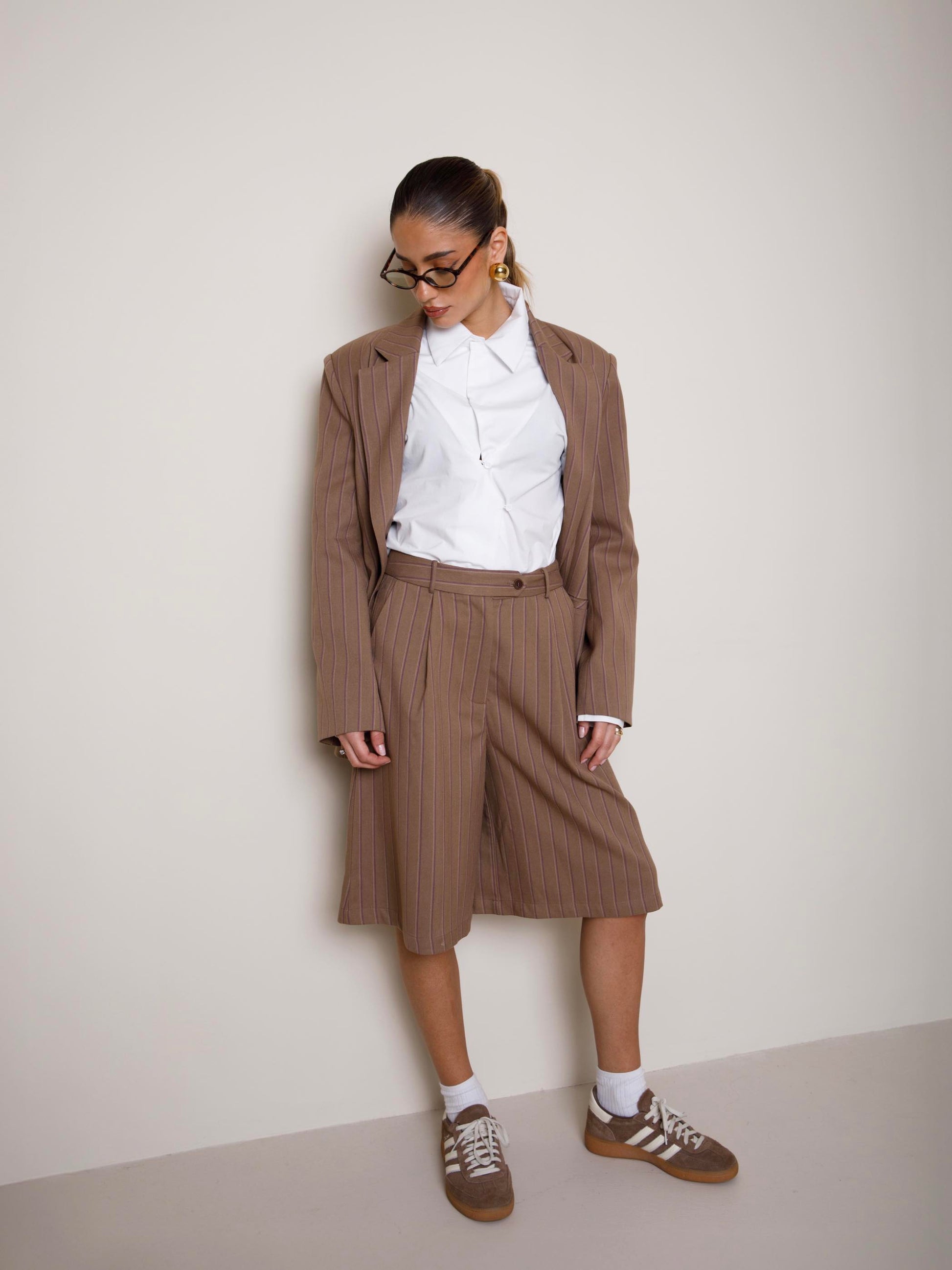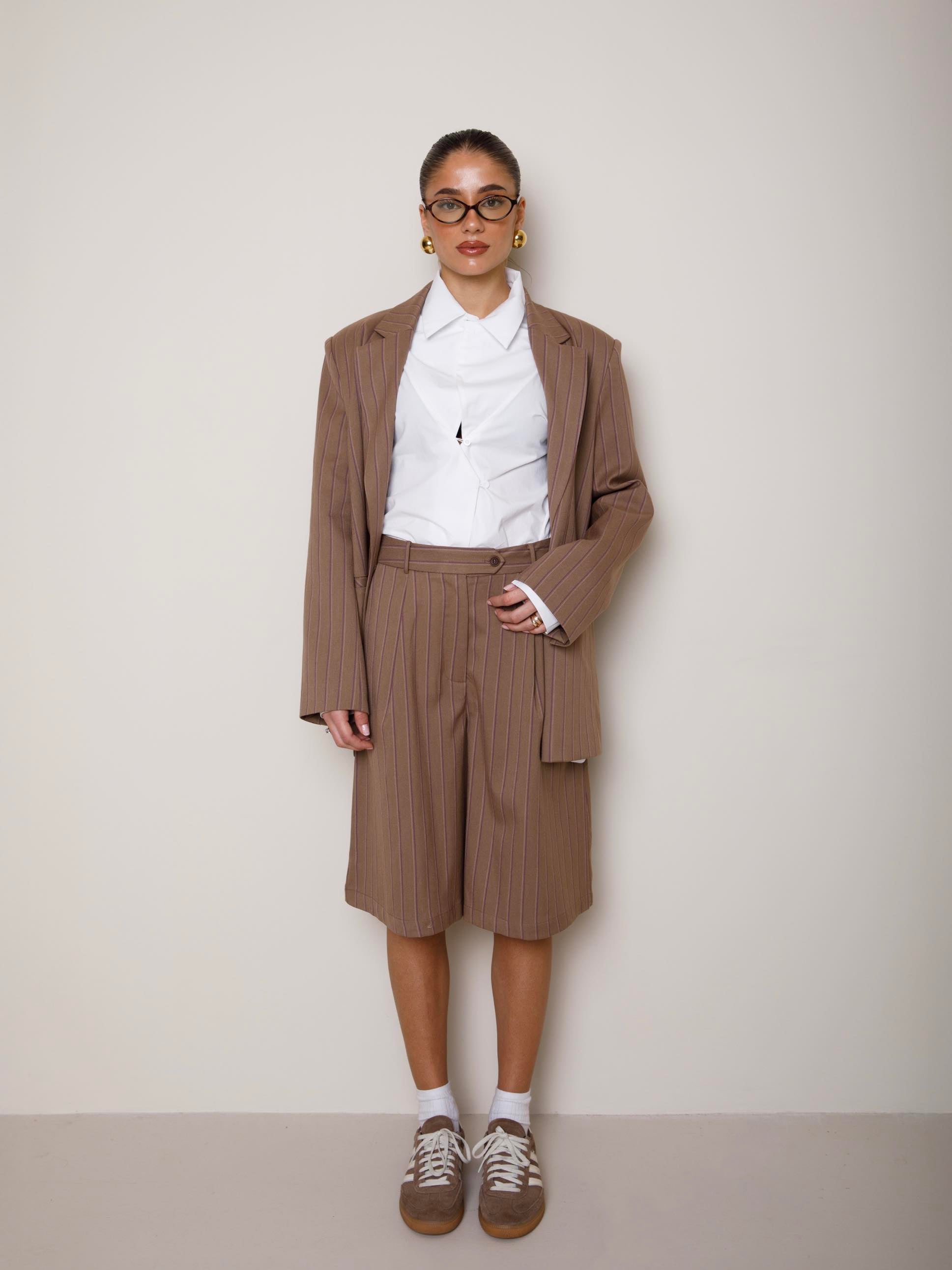 Bermuda a gamba larga e vita alta con passanti in misto viscosa. Fantasia a righe. Presenta pinces e tasche. Chiusura frontale con zip e bottoni. Fit regolare.