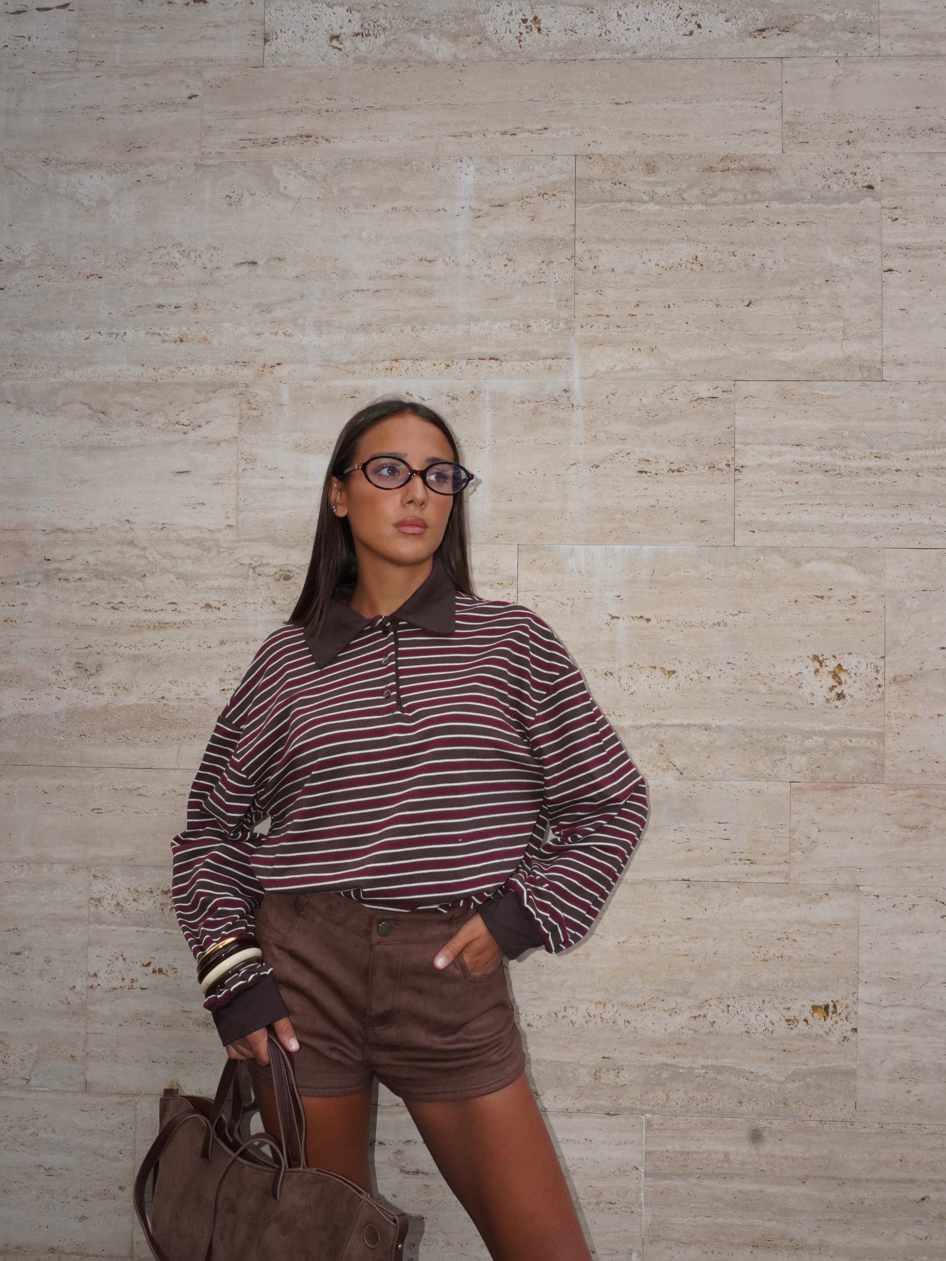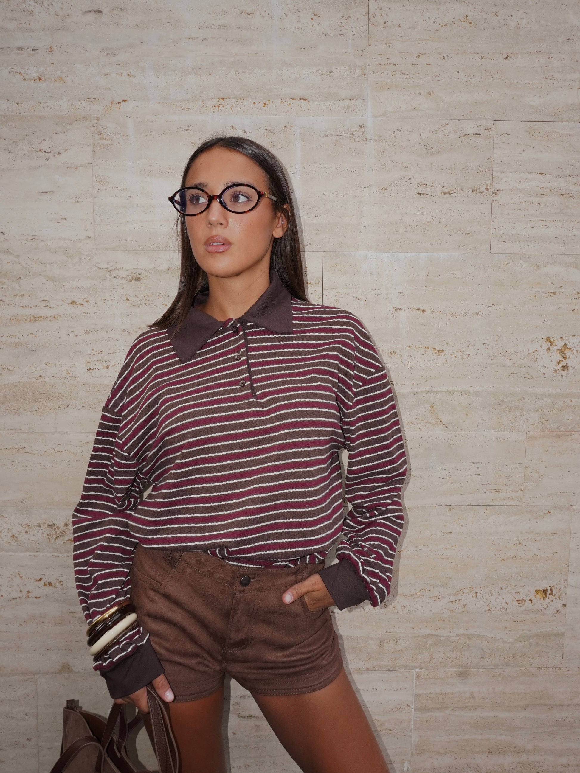 Maglia polo a righe, chiusura con bottoncini sul davanti.