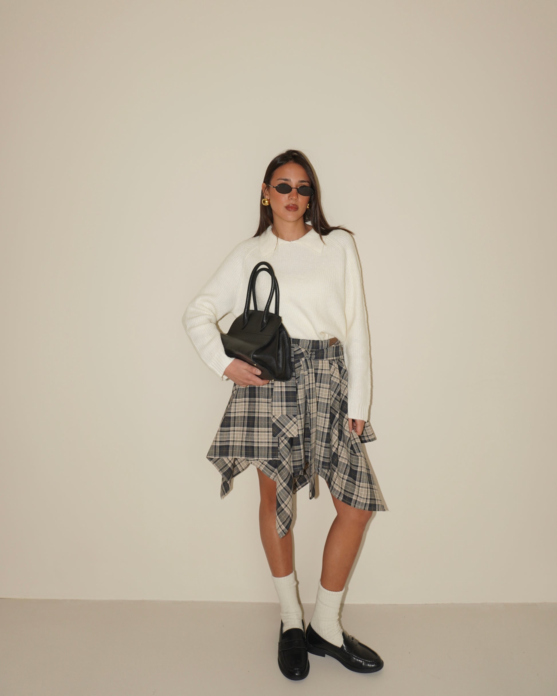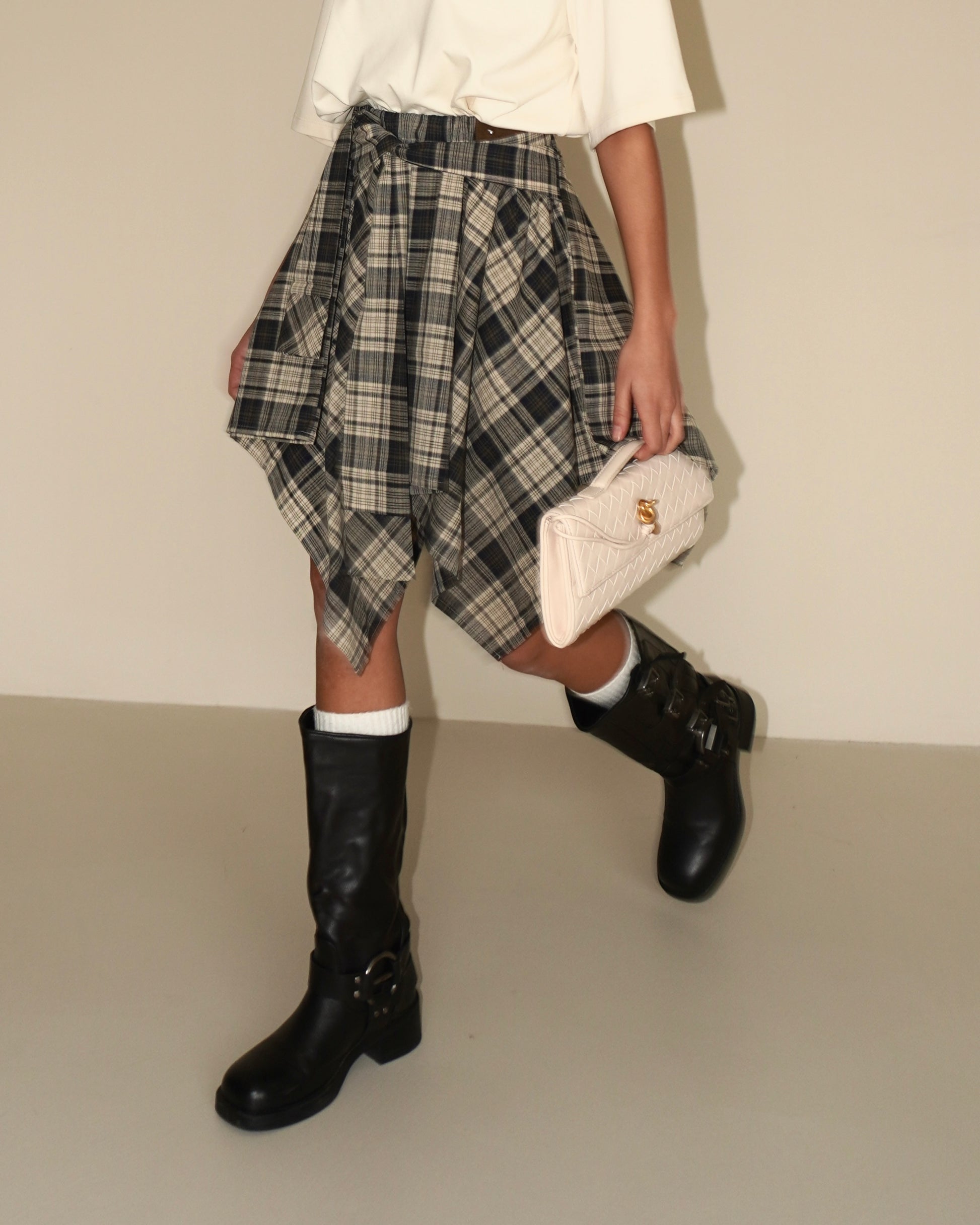 Gonna con fantasia a quadri. Dettaglio di chiusura con nodo sul davanti effetto camicia. Coulisse posteriore.