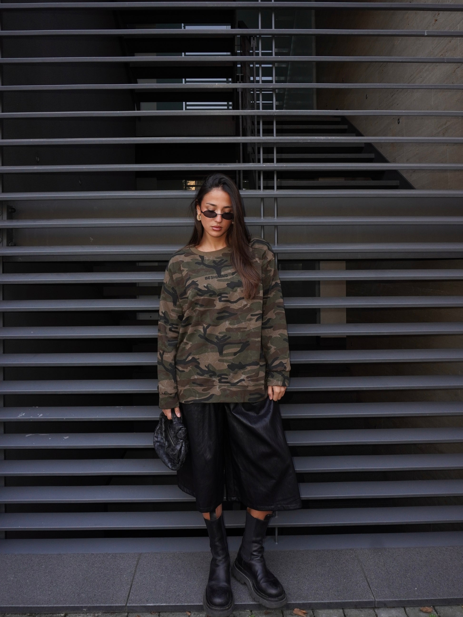 Maglia oversize a maniche lunghe con spalle imbottite. Fantasia militare. Dettaglio ricamo frontale e polsino girocollo.