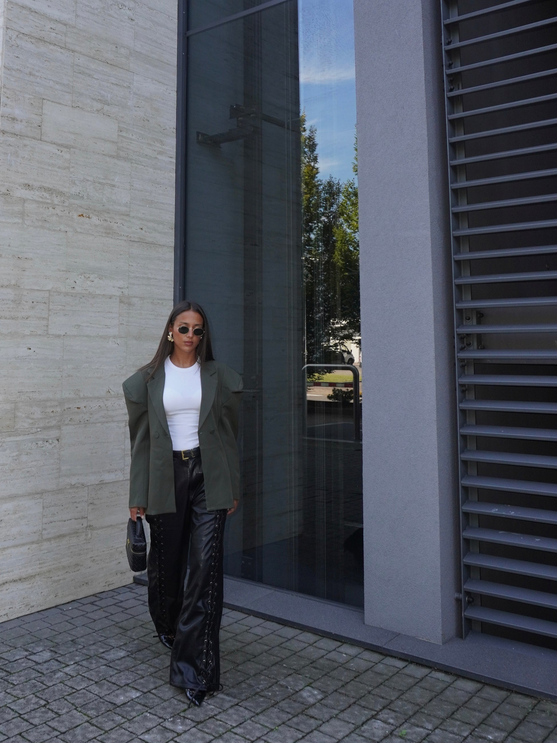 Pantalone in ecopelle stringato. Presenta tasche, chiusura con zip e bottone.