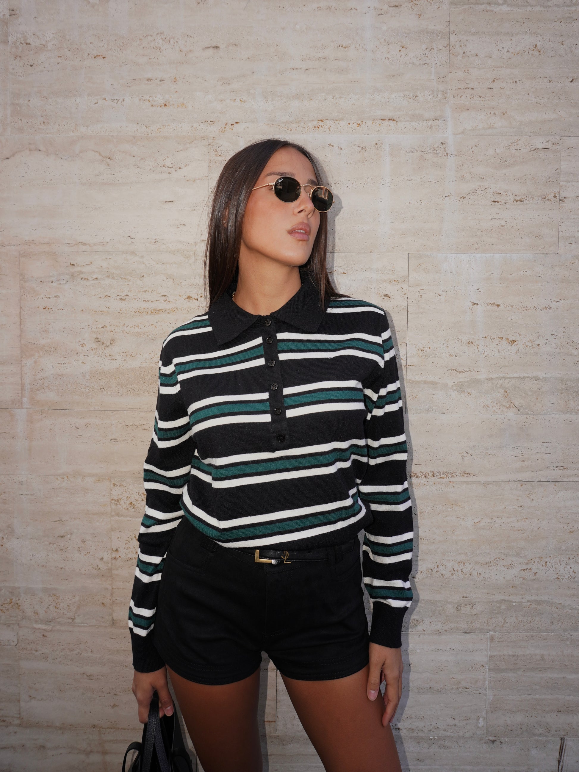 Polo in maglia a righe con maniche lunghe. Colletto e scollo a V con chiusura con bottoni centrali.