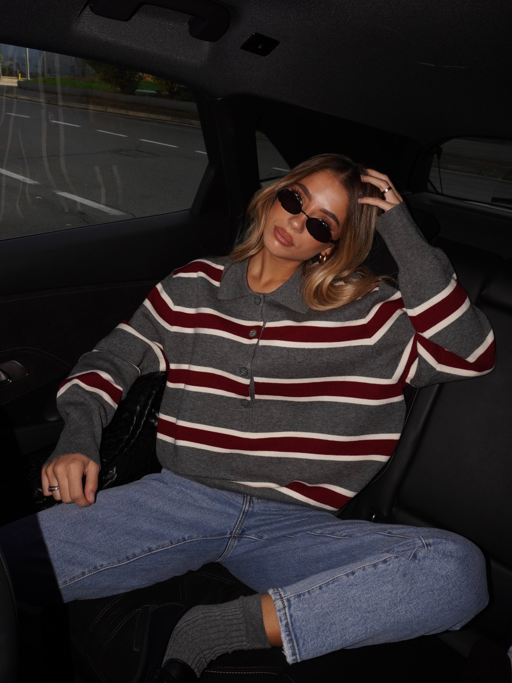 Polo a maniche lunghe oversize con fantasia a righe. Chiusura con bottoni centrali.