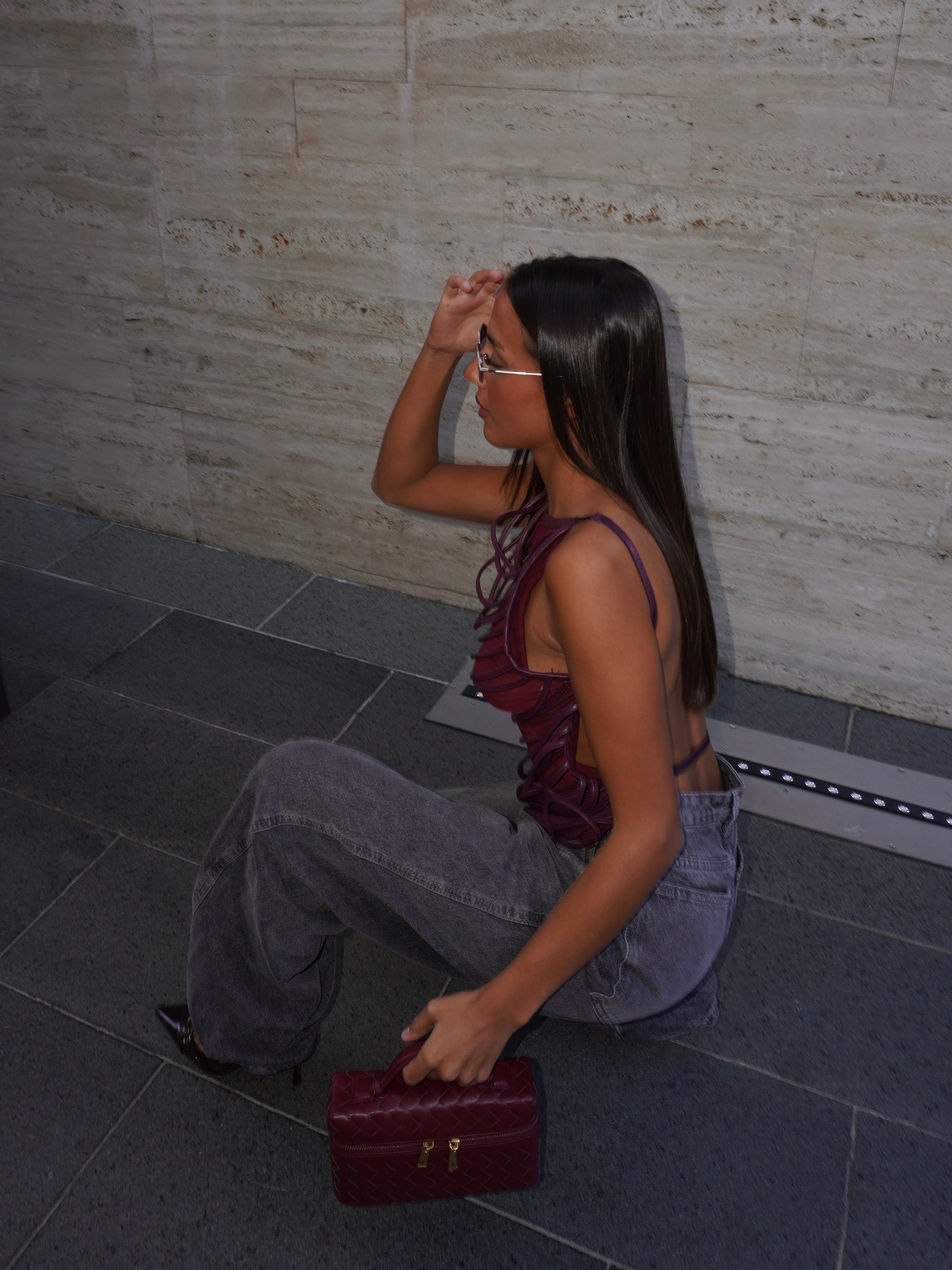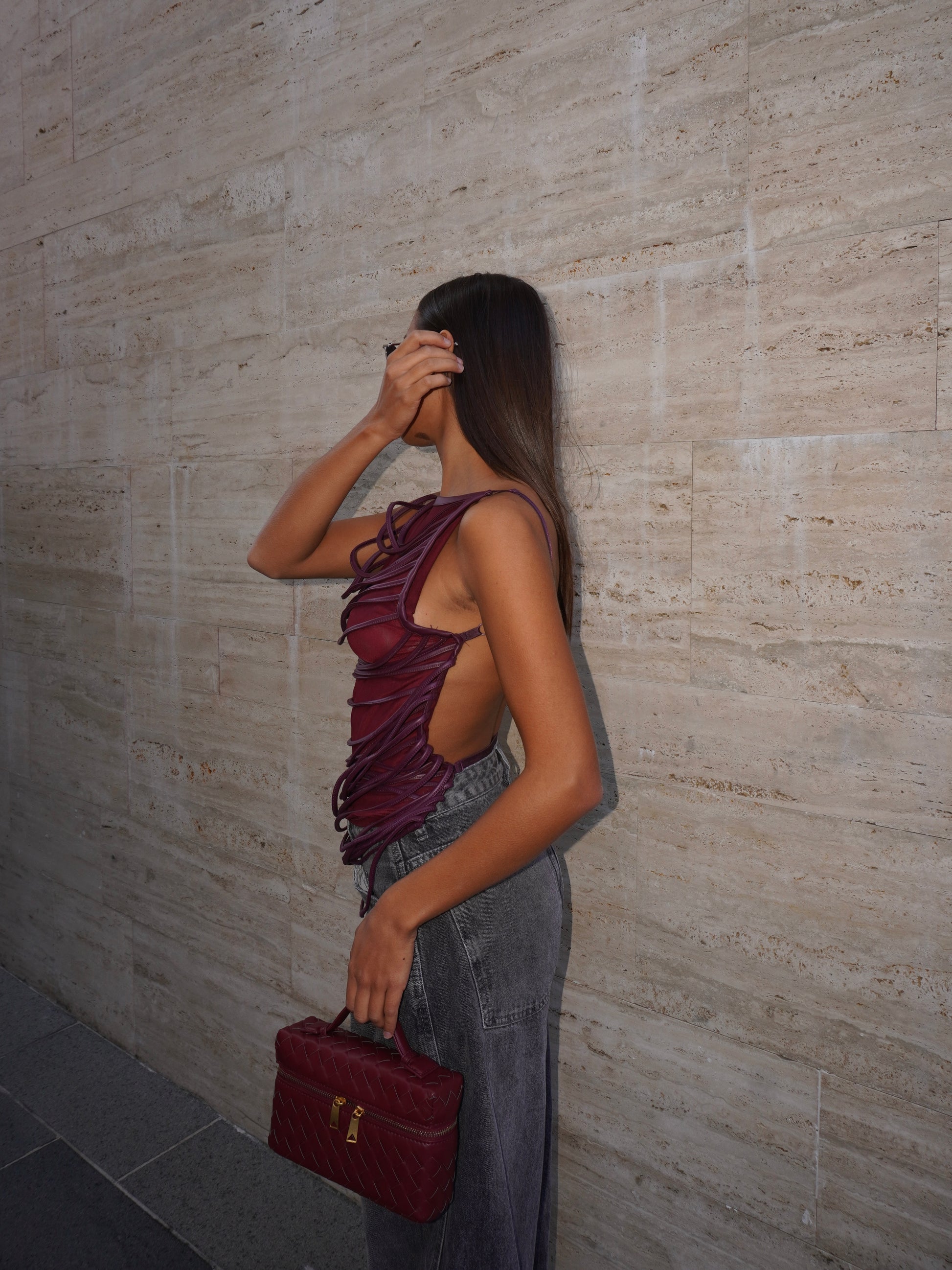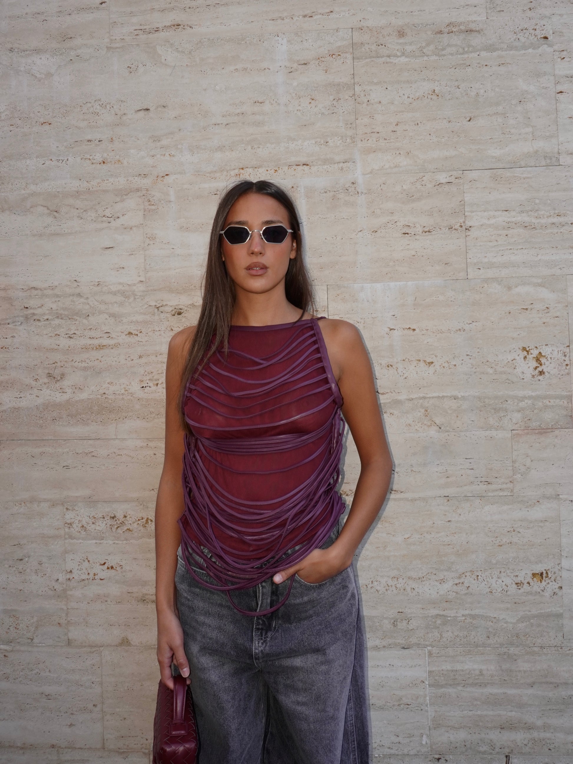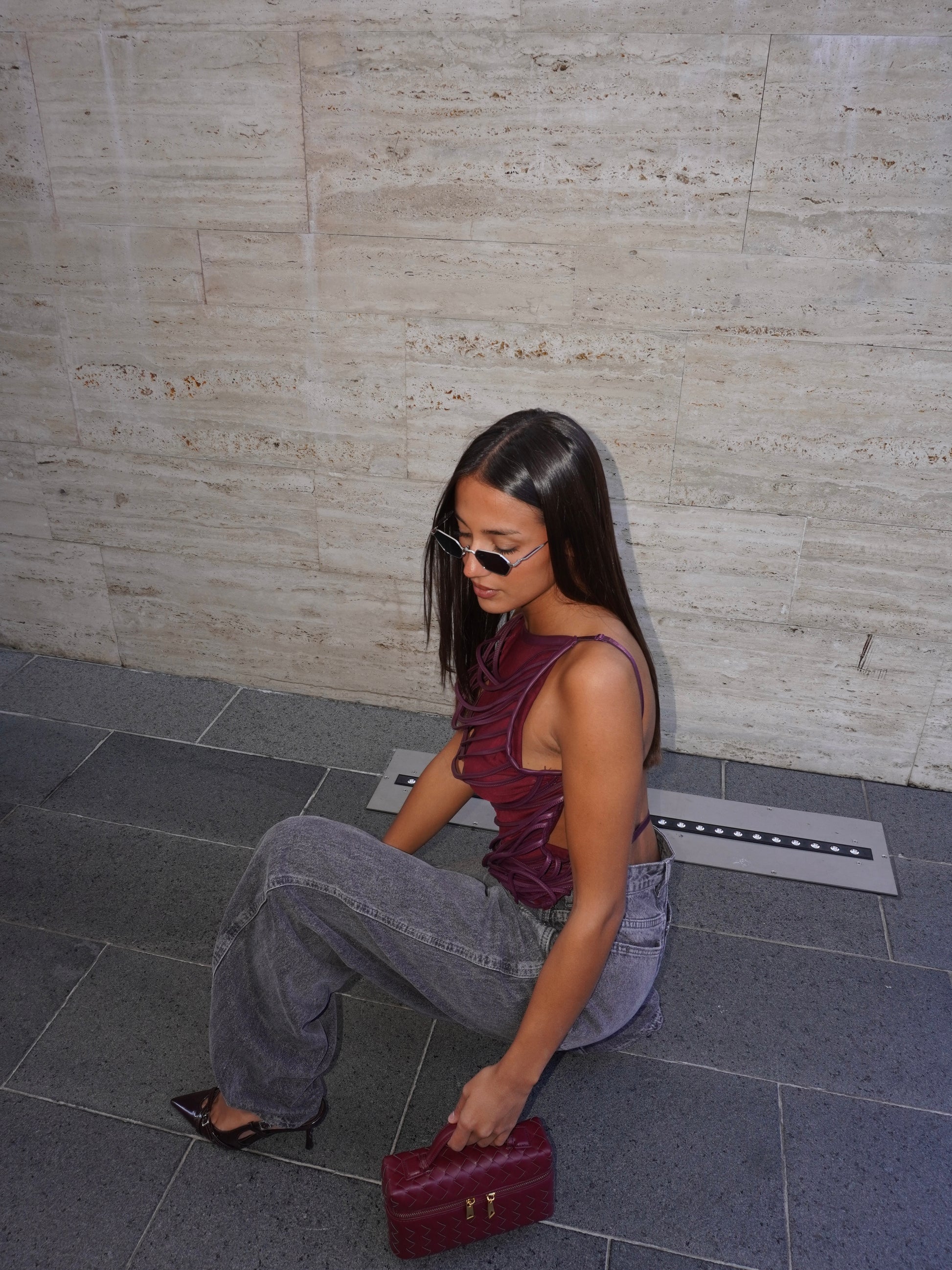 Top schiena scoperta con dettaglio di lacci in ecopelle sul davanti. Presenta bretelle sottili regolabili.