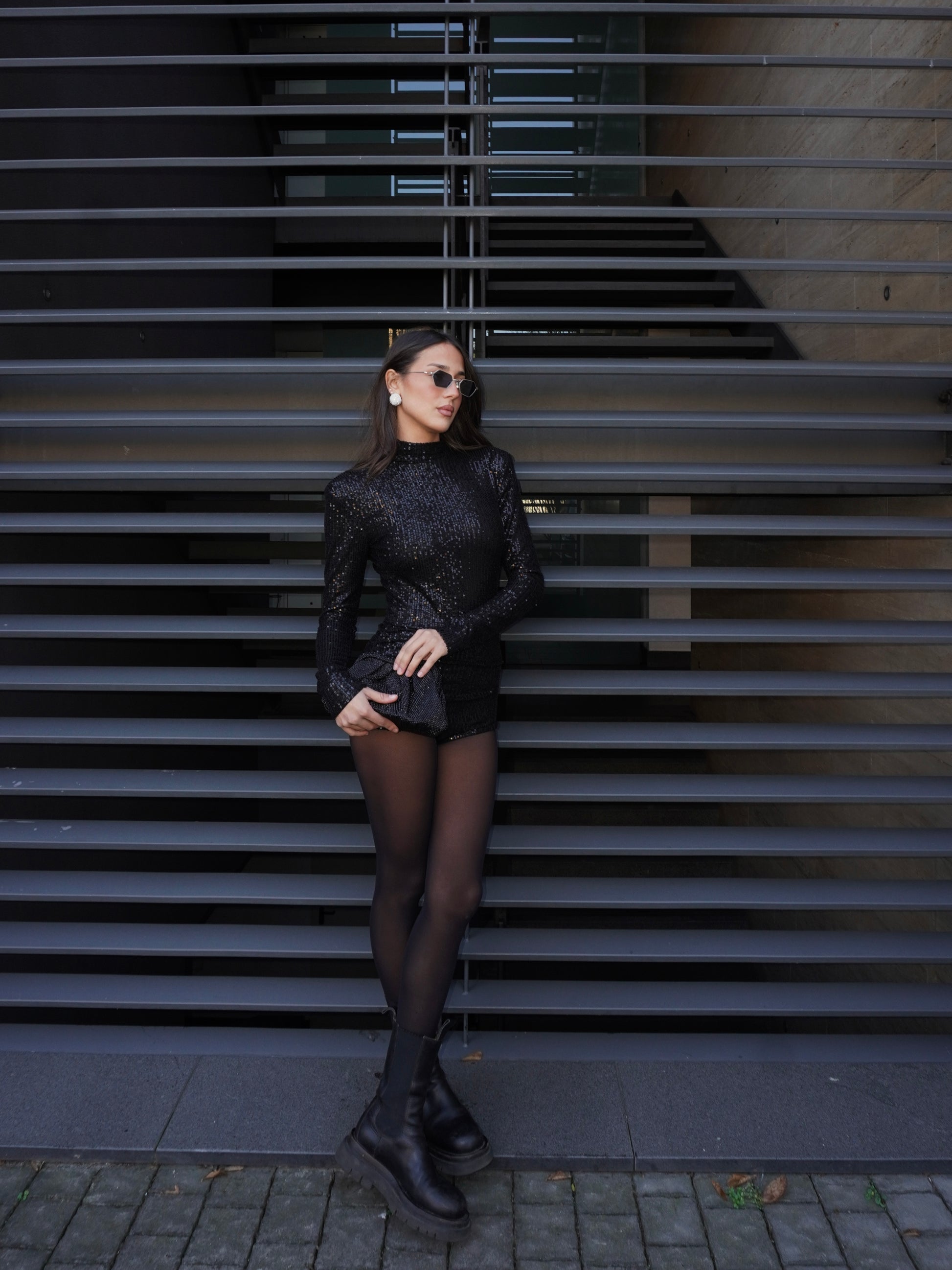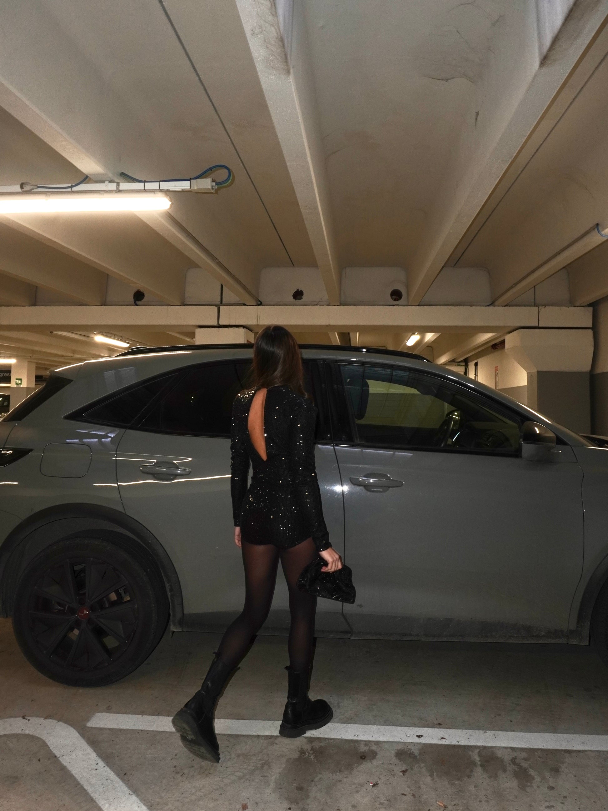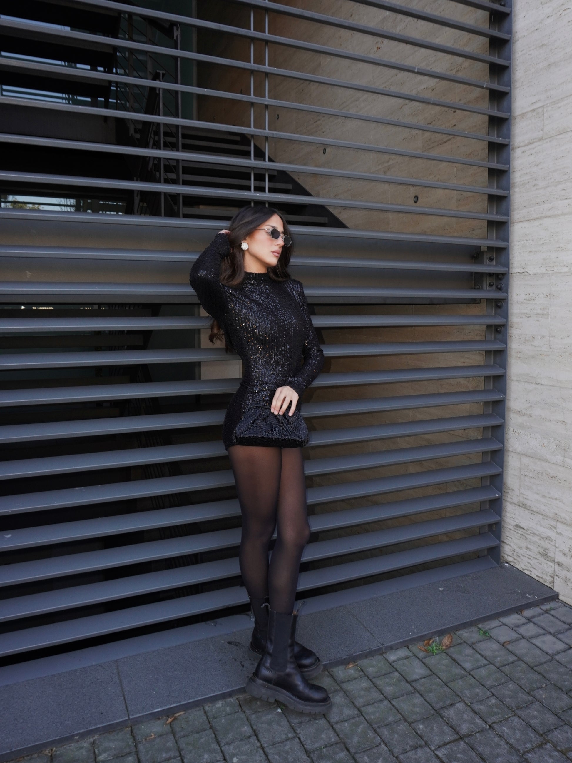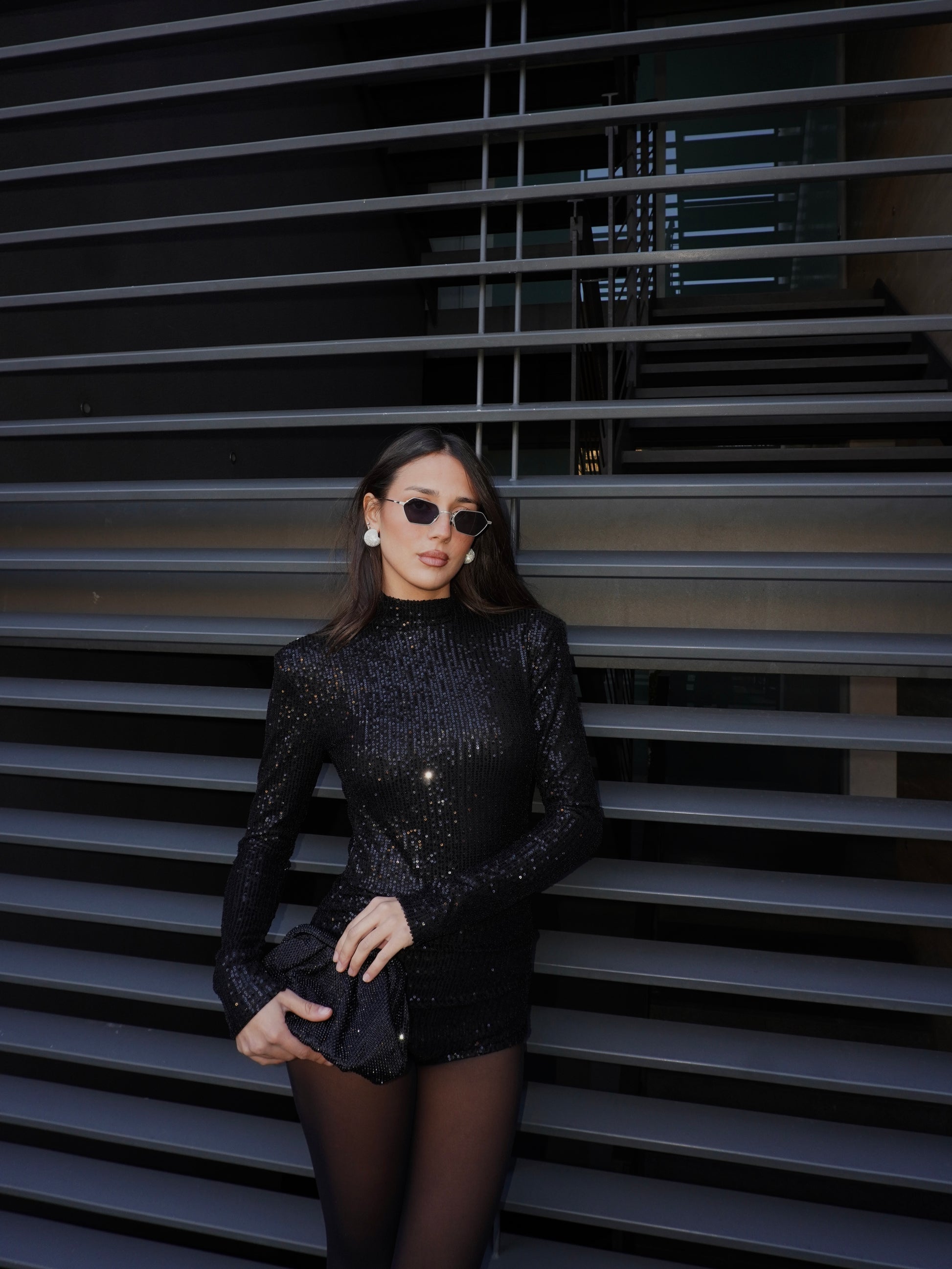 Tutina in paillettes con spalle imbottite. Chiusura posteriore sul colletto con bottoni. Dettaglio di apertura sulla schiena. Arricciatura sul fianco. Foderata.