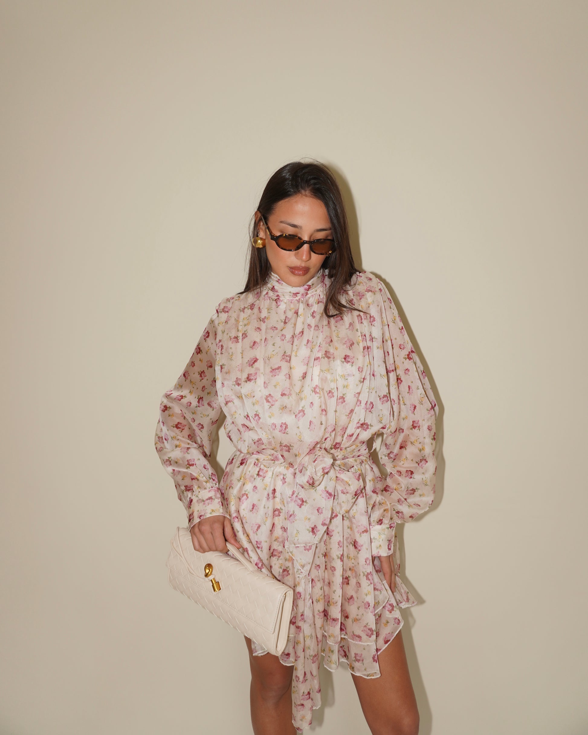 Abito corto in tulle con fantasia floreale. Maniche lunghe con polsini. Drappeggiato. Presenta collo alto con chiusura a fiocco. Vita elasticizzata con cintura. Fit morbido.