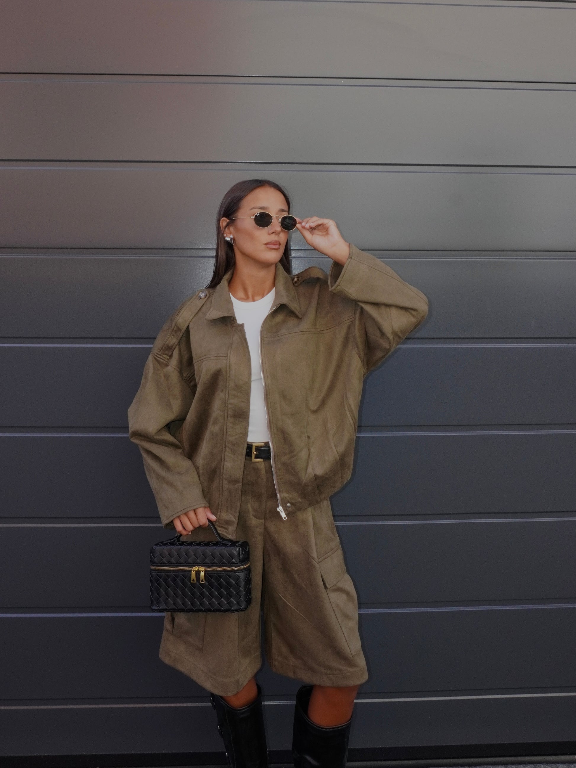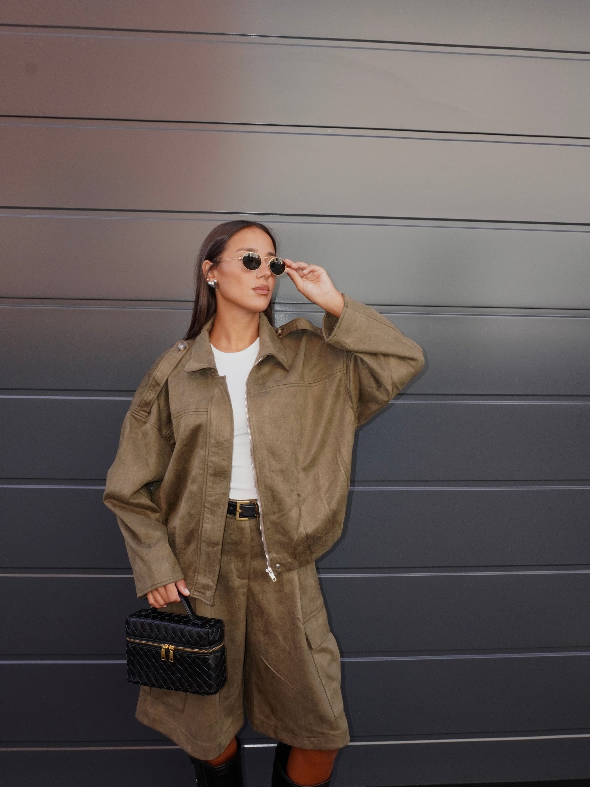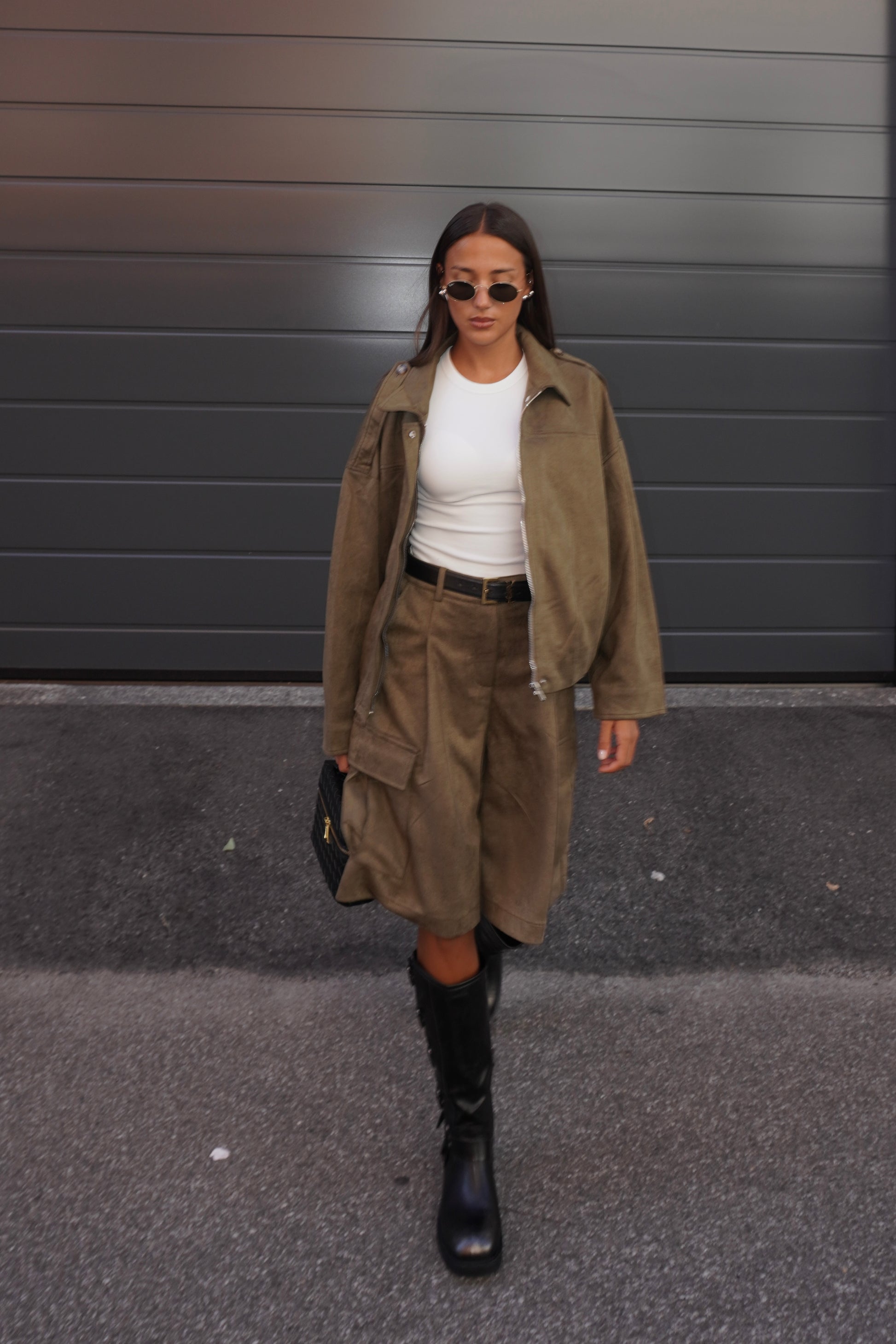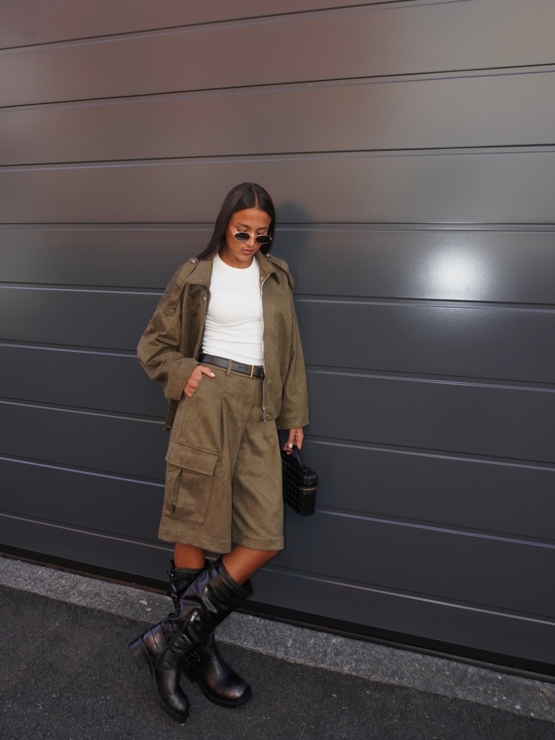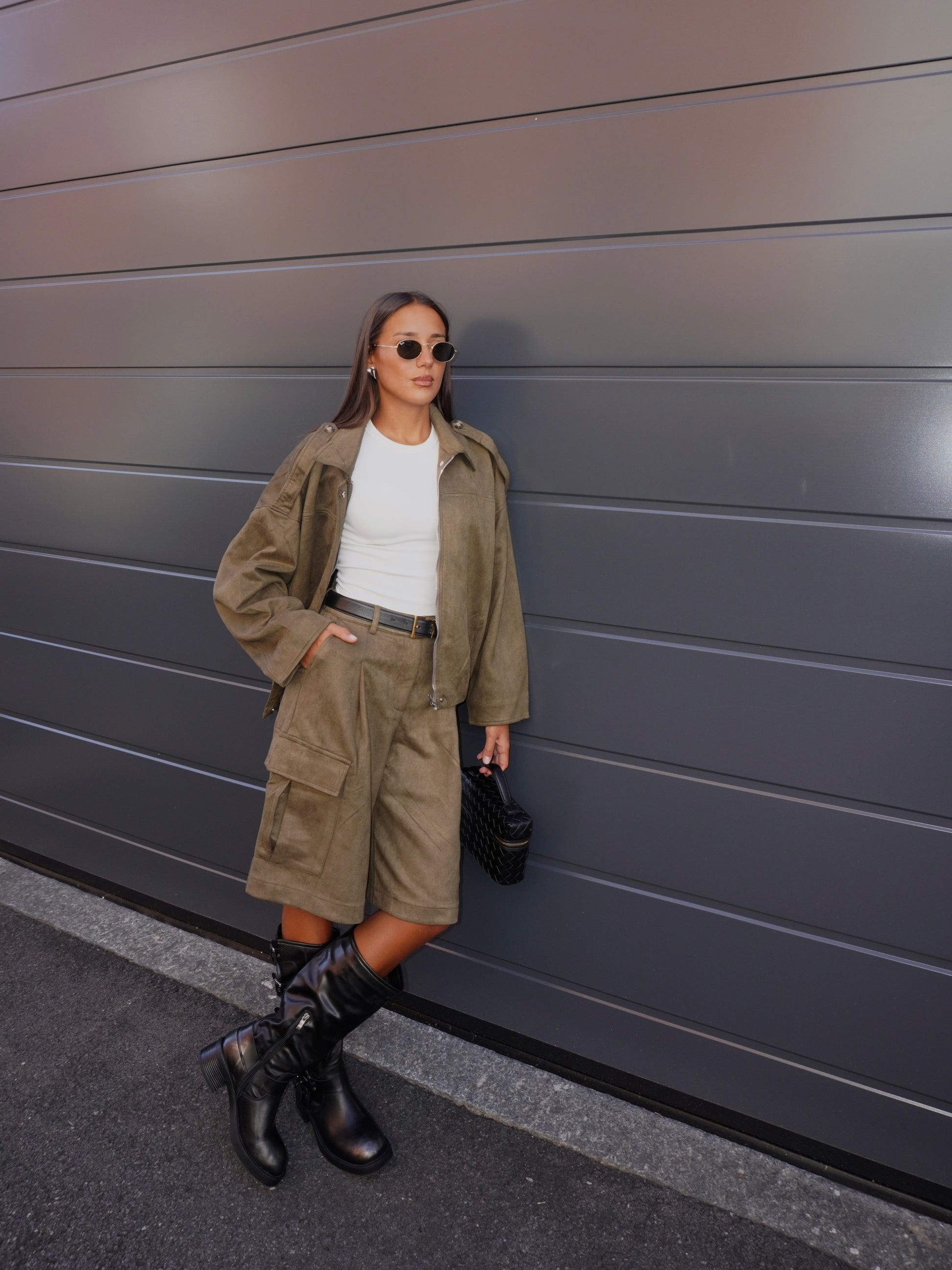 Bermuda cargo in simil camoscio, presenta tasche e passanti per cintura. Chiusura con zip e bottone.