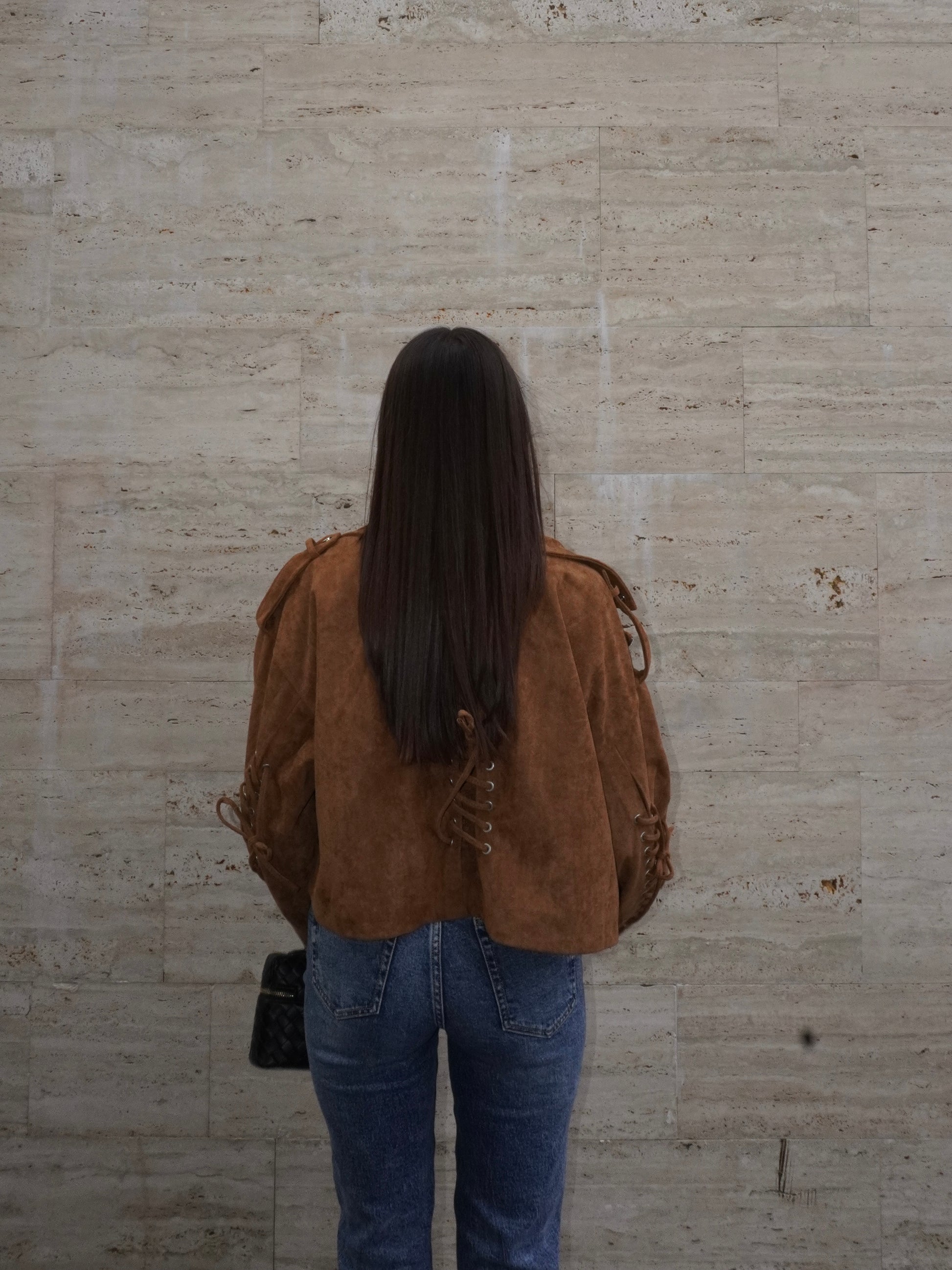 Giacca biker stringato in simil camoscio. Presenta tasche, chiusura con zip asimmetrica. Foderato all'interno.