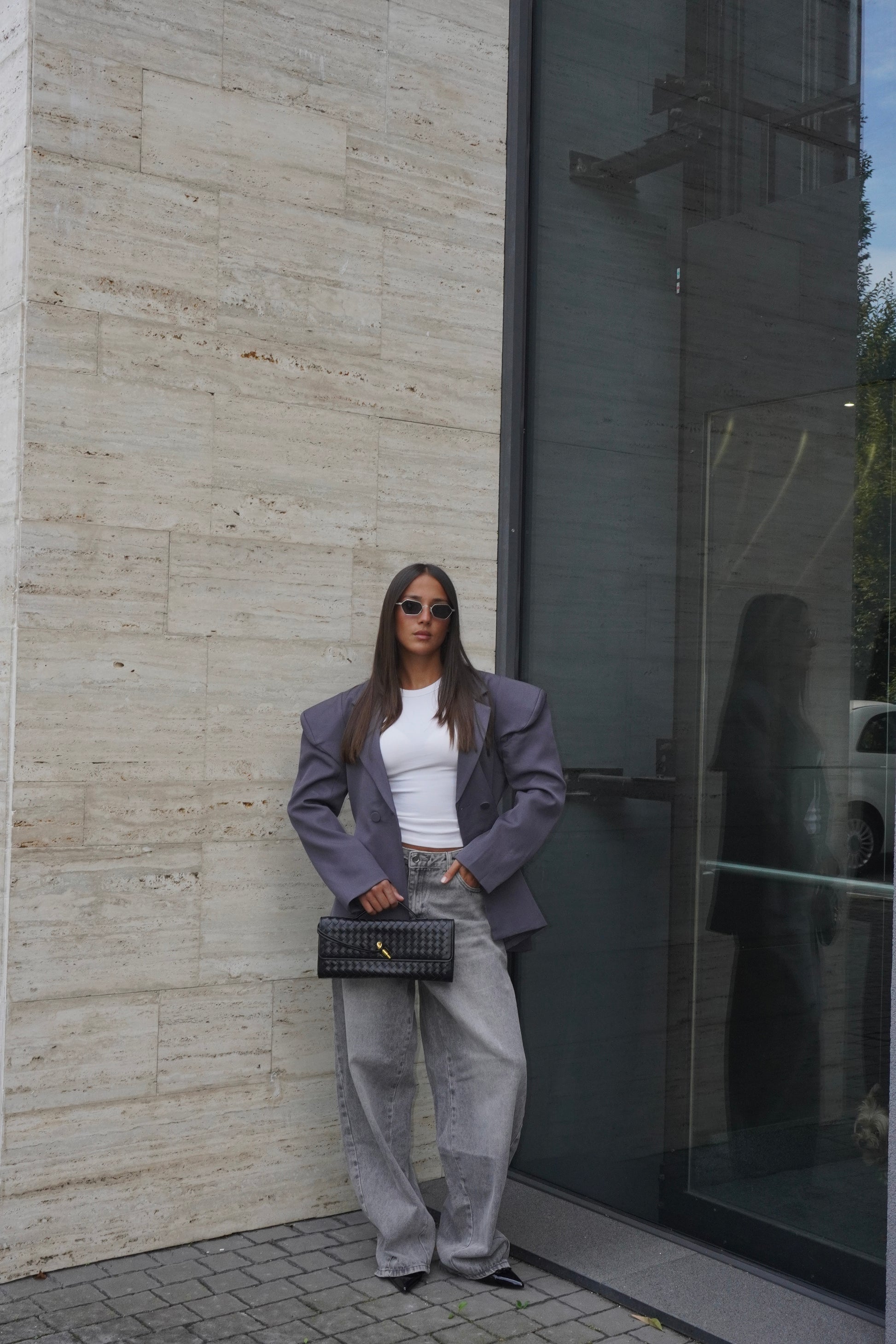 Blazer doppiopetto con dettaglio di spalline imbottite, scollo revers. Chiusura con bottoni.