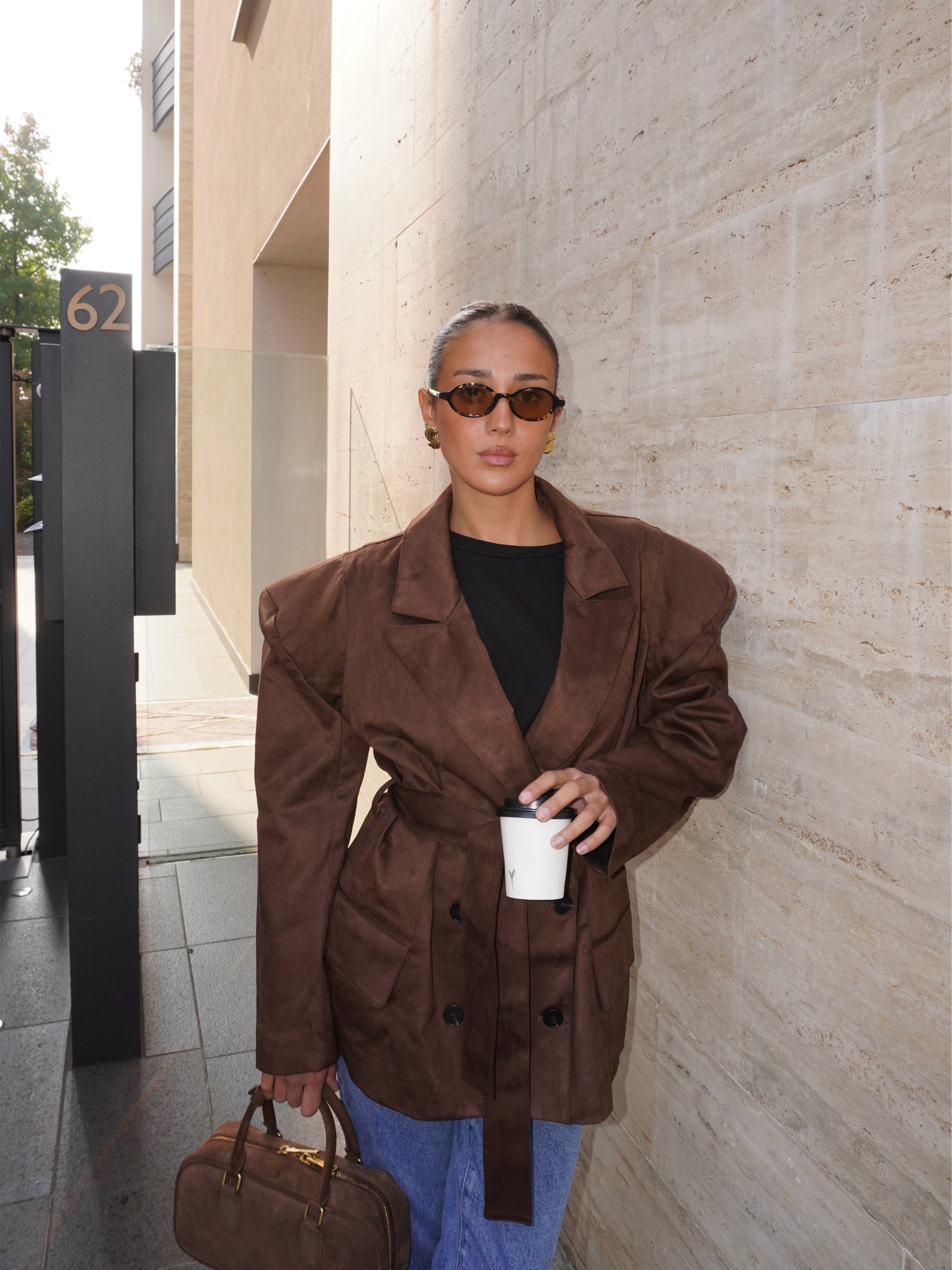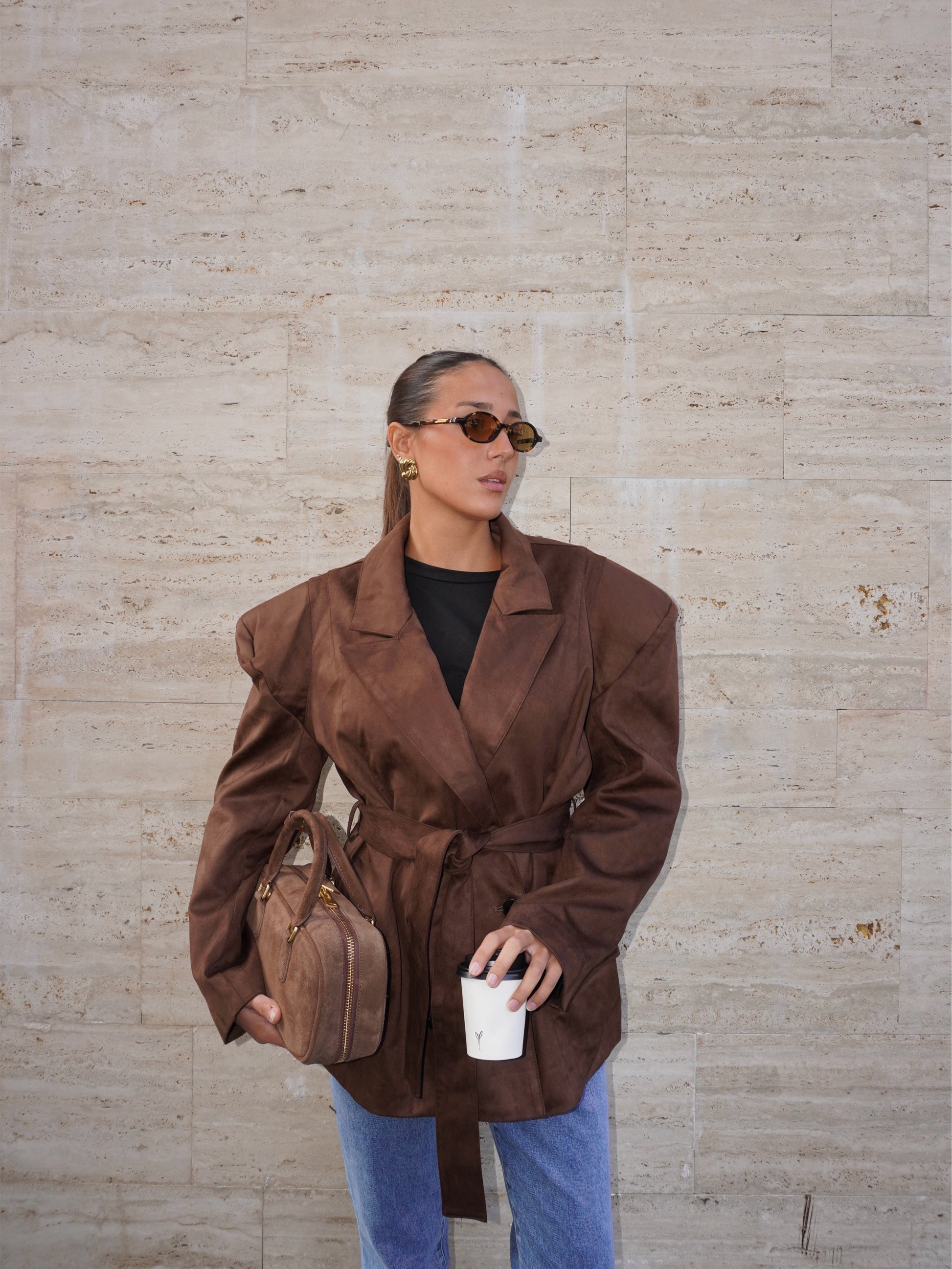 Blazer in simil camoscio con spalline imbottite. Dettaglio di cintura abbinata. Chiusura con bottoni, presenta tasche.