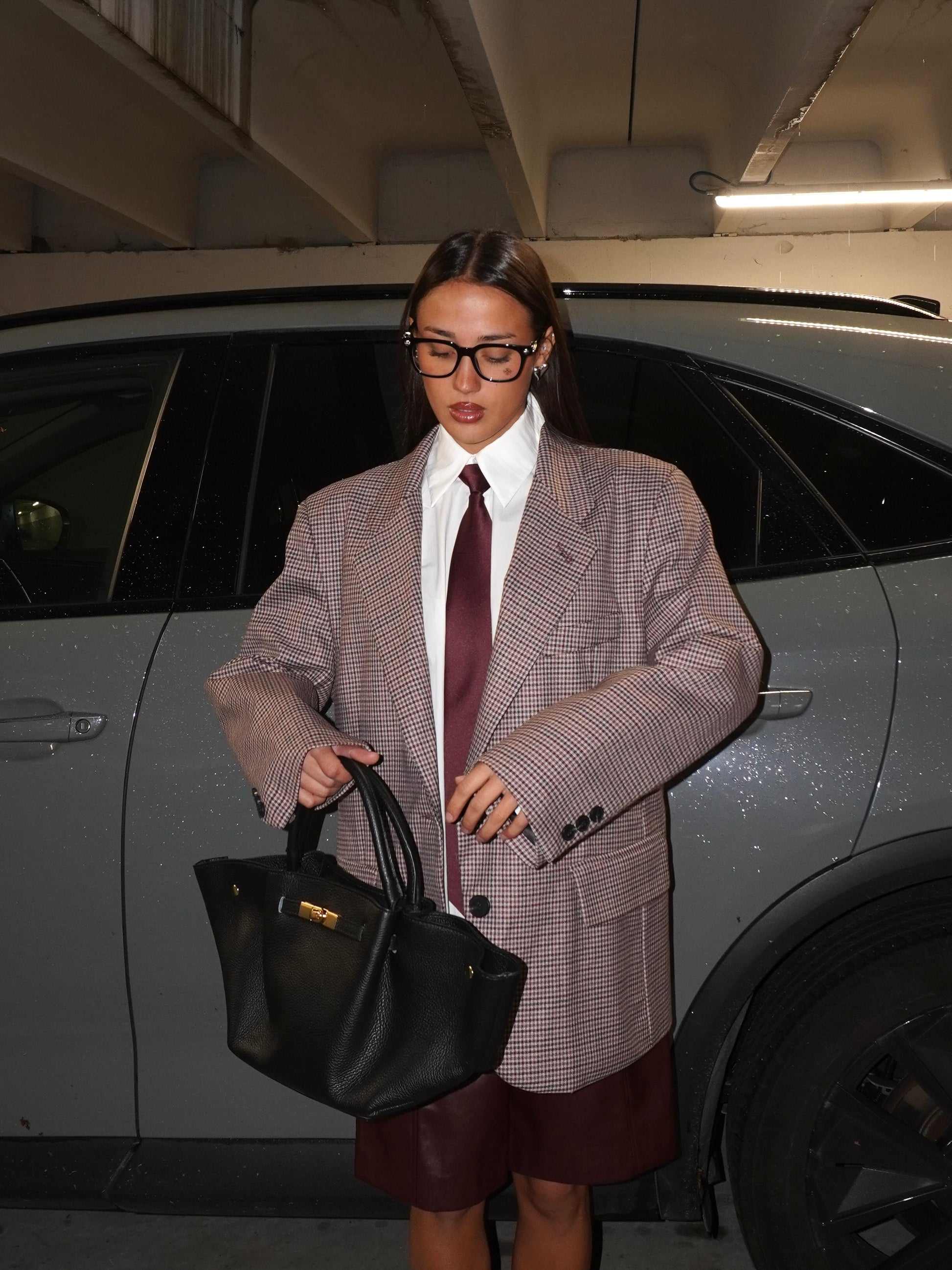 Blazer oversize, presenta scollo revers con tasche. Fantasia pied de poule. Chiusura con bottoni frontali.