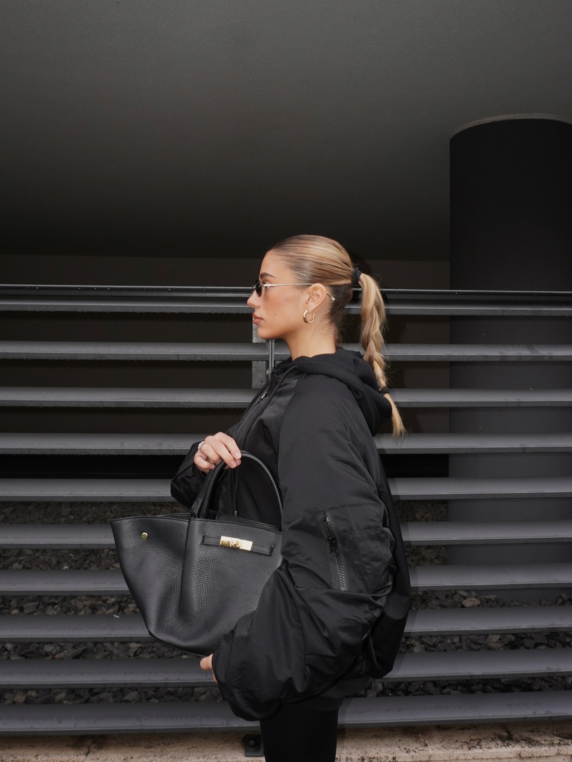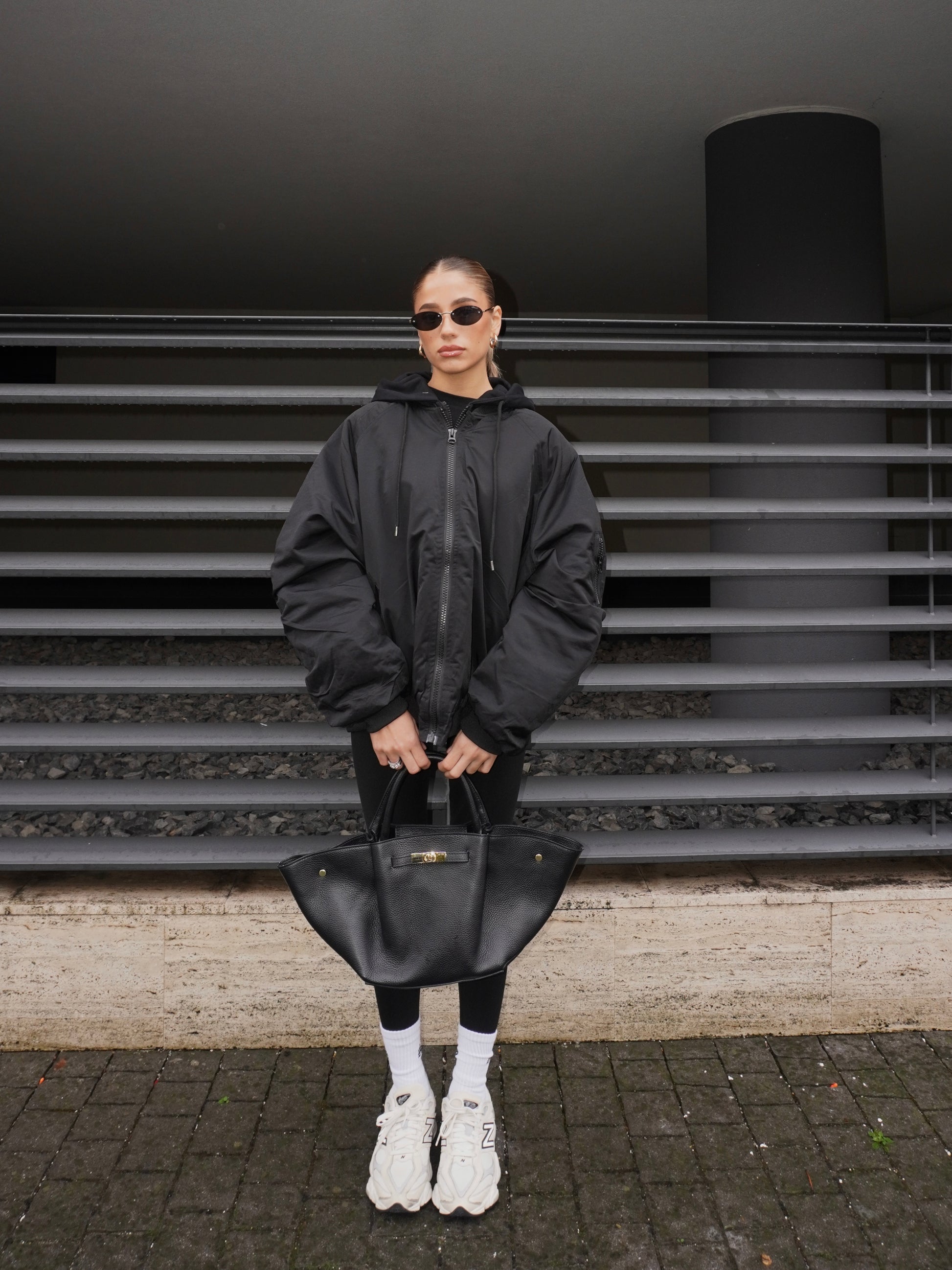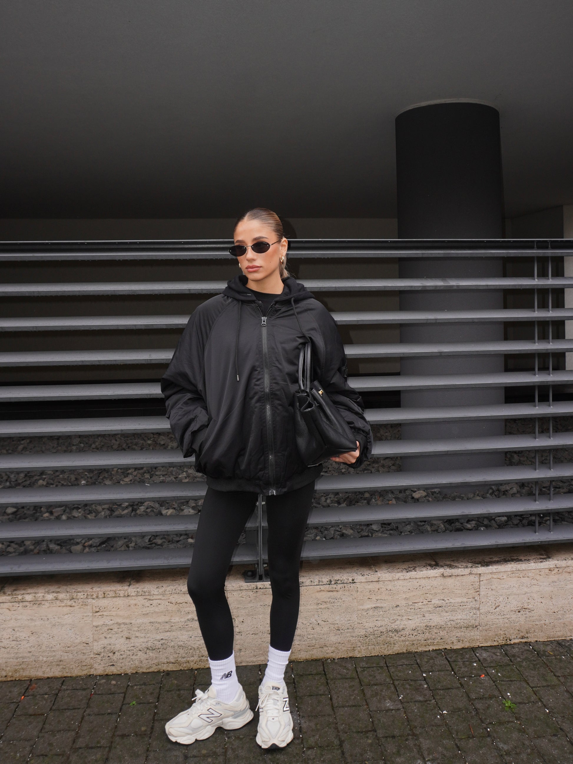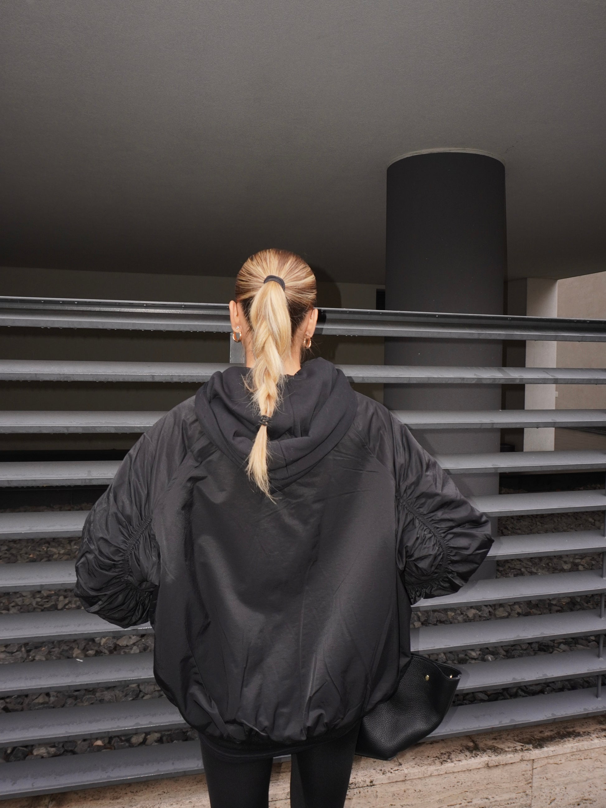Bomber foderato con cappuccio incorporato. Dettaglio di doppia zip, presenza di tasche sul davanti e sul braccio. Arricciatura sulle maniche.