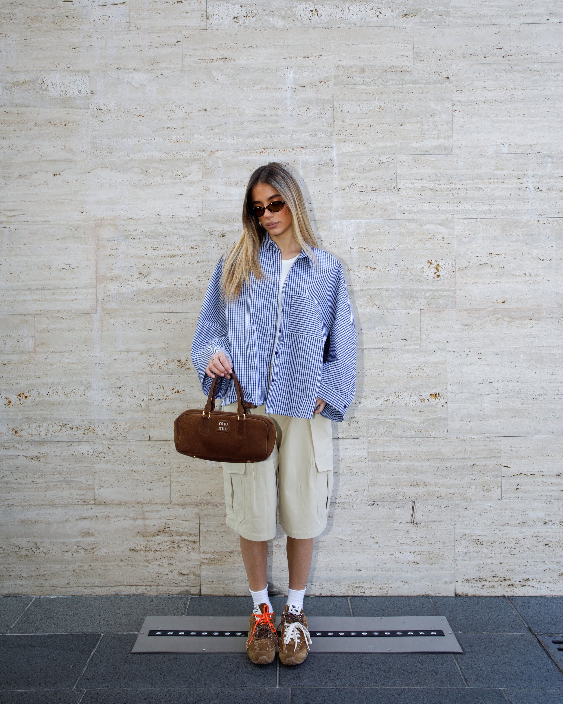 Camicia over a quadretti, chiusura frontale con bottoni. Presenza di tasca sul davanti. Dettaglio di maniche balloon.