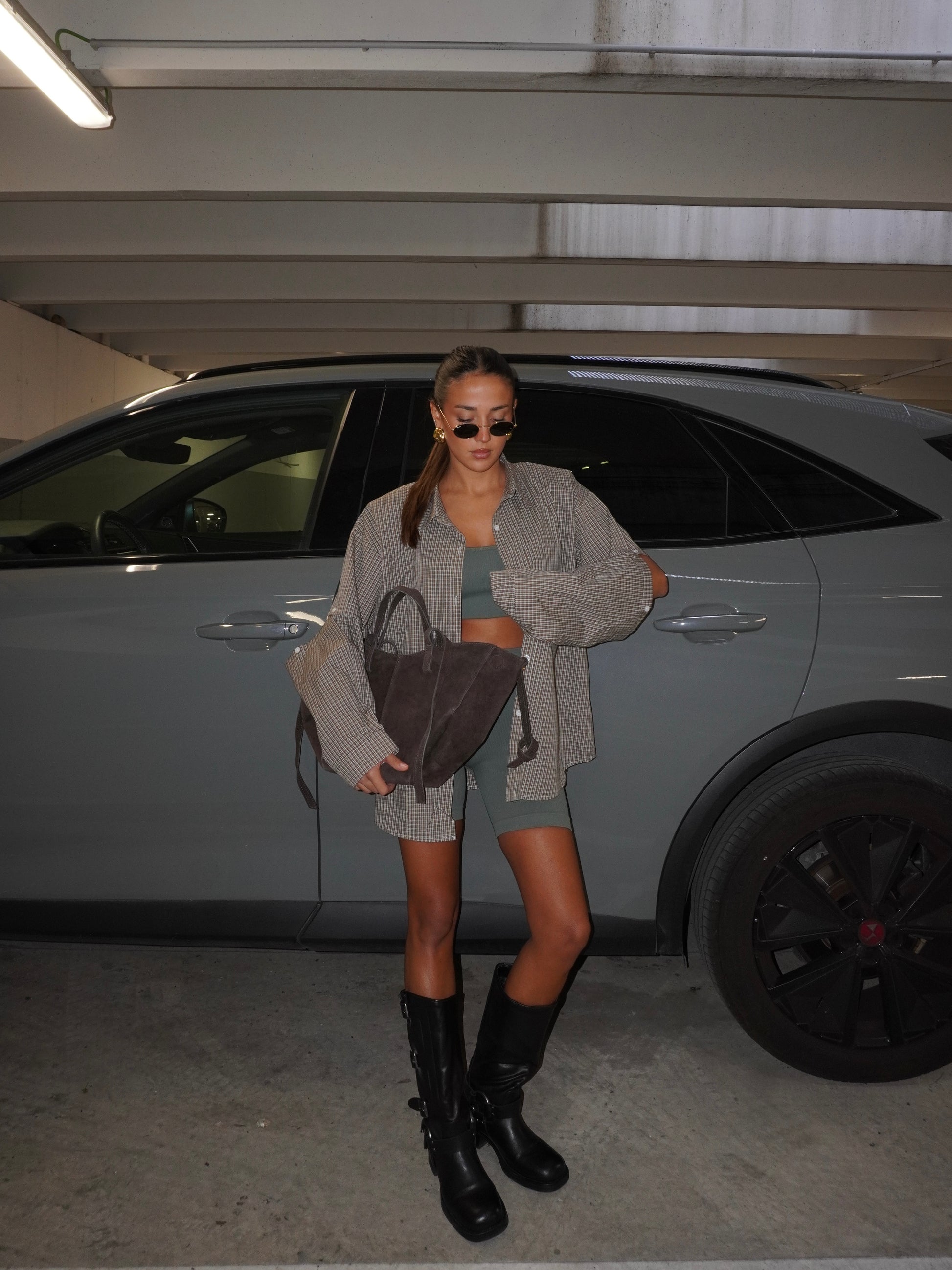 Camicia over a righe con spalline imbottite mezza manica removibile con bottoni. Presenta tasca sul davanti. Chiusura con bottoni.