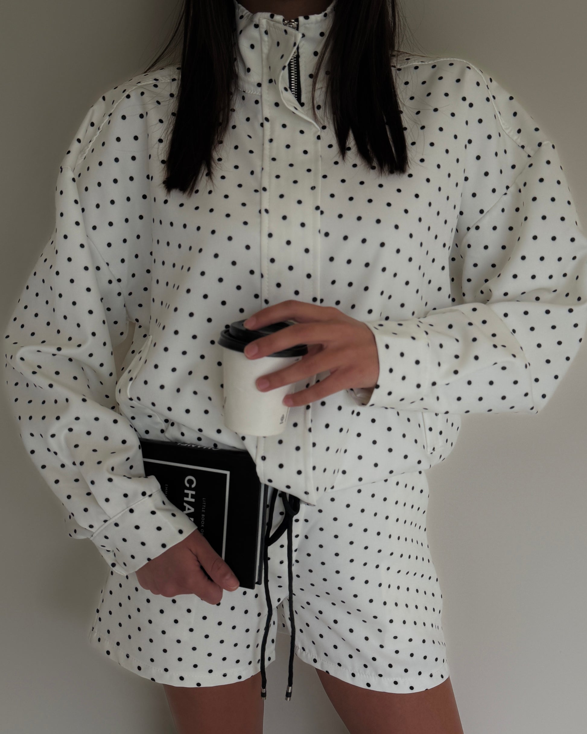 Completo con fantasia a pois, composto da giacca con colletto, dettaglio di elastico in vita, presenta tasche. Chiusura con zip. Shorts con elastico in vita e dettaglio di passanti per cintura. Presenta tasche.