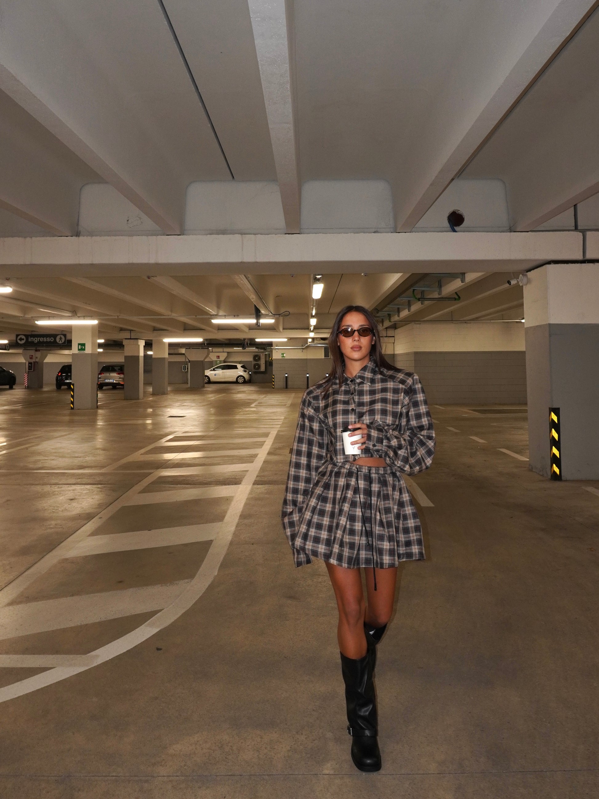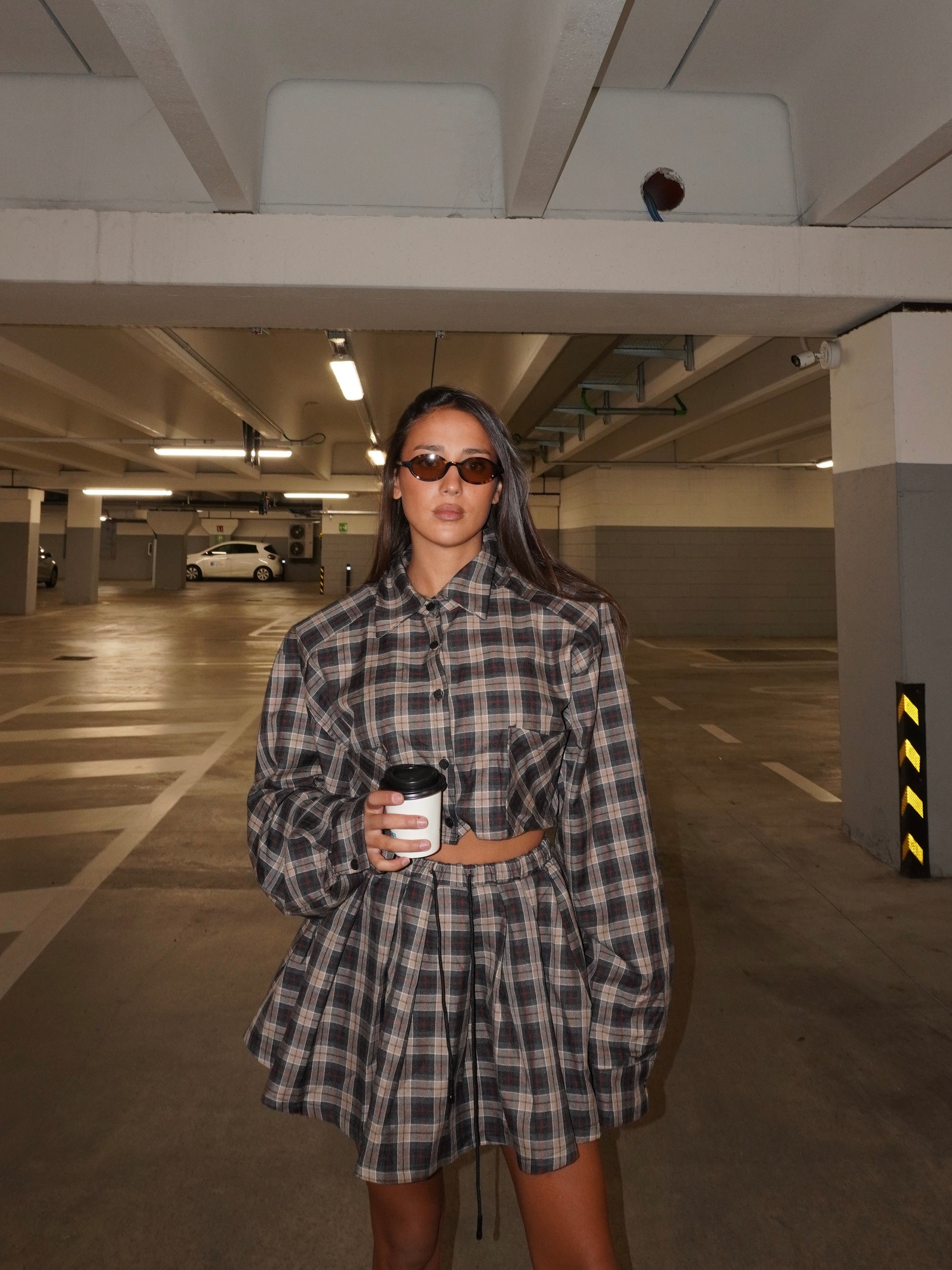 Completo composto da gonna plissettata con coulisse con pantaloncino sotto. Fantasia a righe. Camicia crop con dettaglio di spalline imbottite, chiusura con bottoni. Presenta tasca sul davanti.