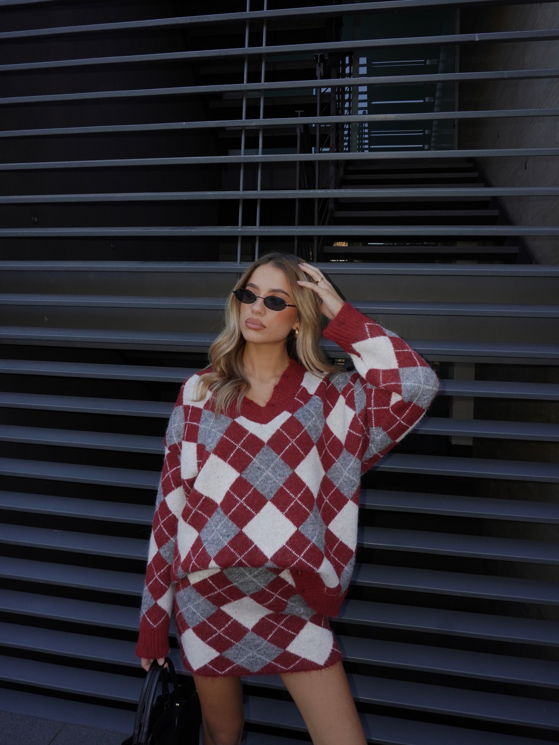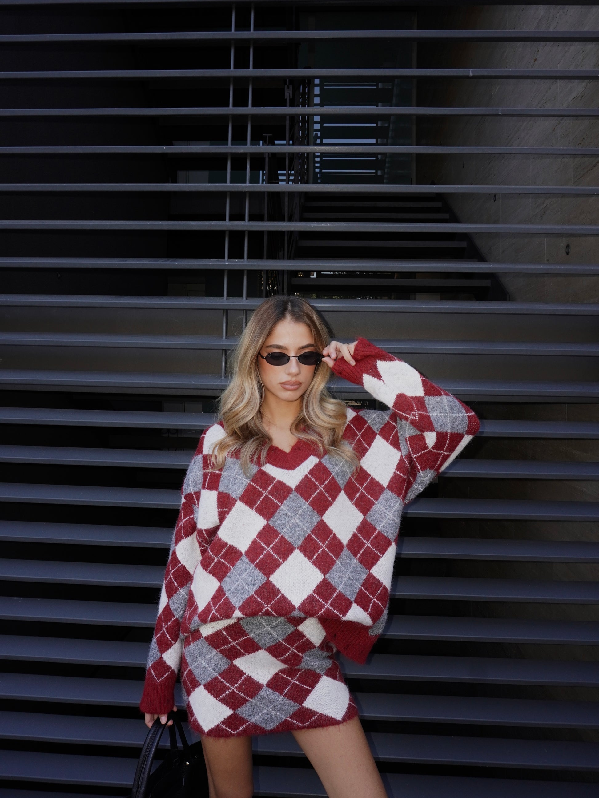 Completo composto da maglione con fantasia e scollo a V. Effetto rovinato. Minigonna abbinata elasticizzata.