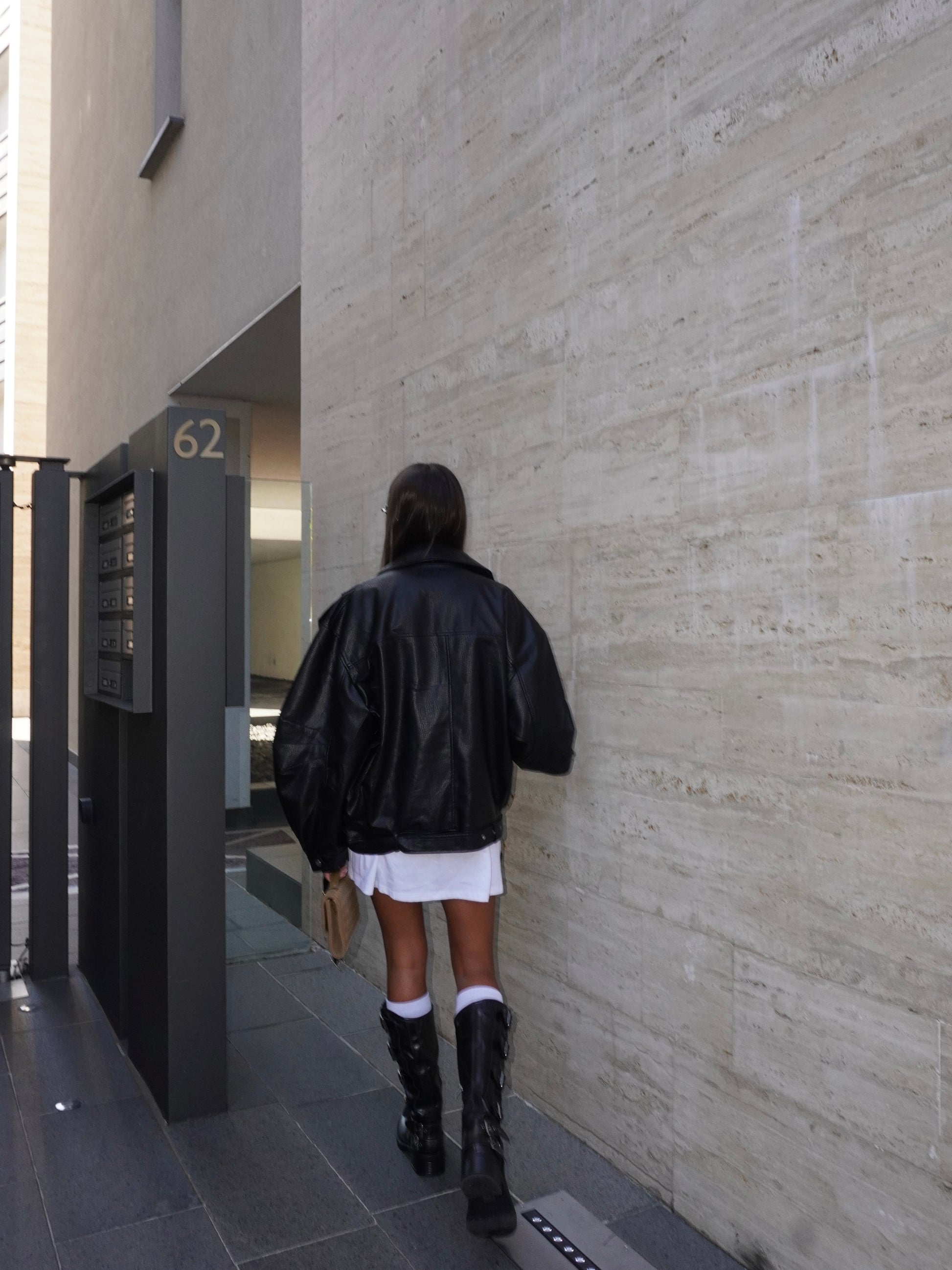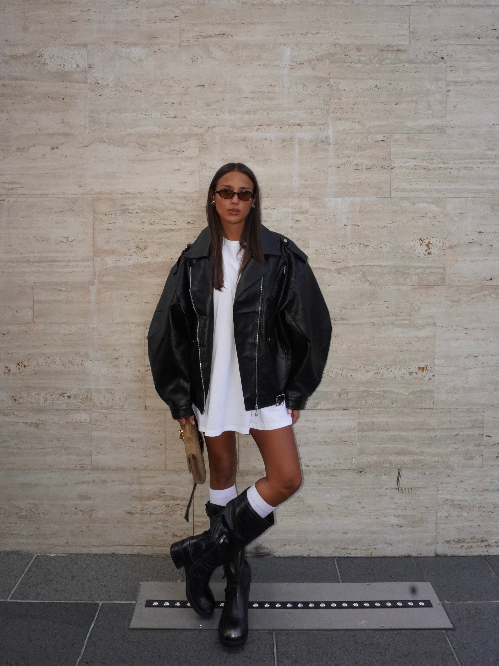 Chiodo oversize in ecopelle con collo reverse e maniche lunghe, tasche con cerniera interiore. Dettaglio di passante sulle spalle e dotati di cintura dello stesso materiale con fibbia.
