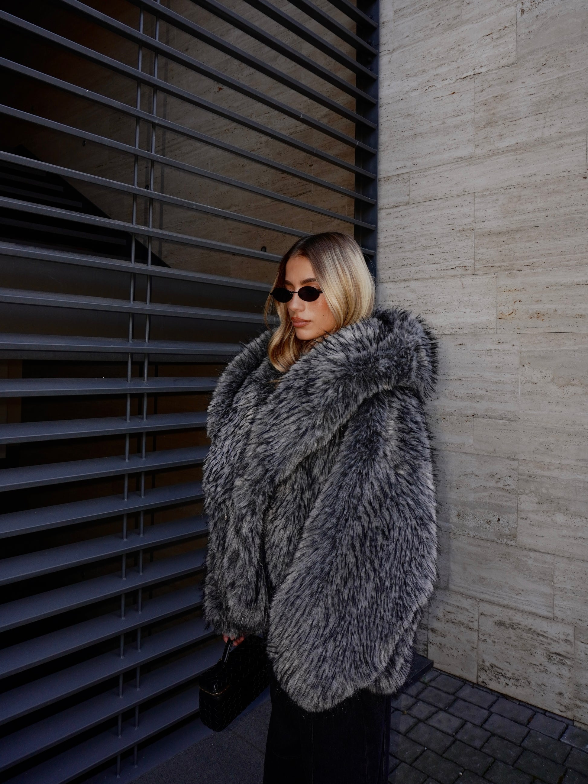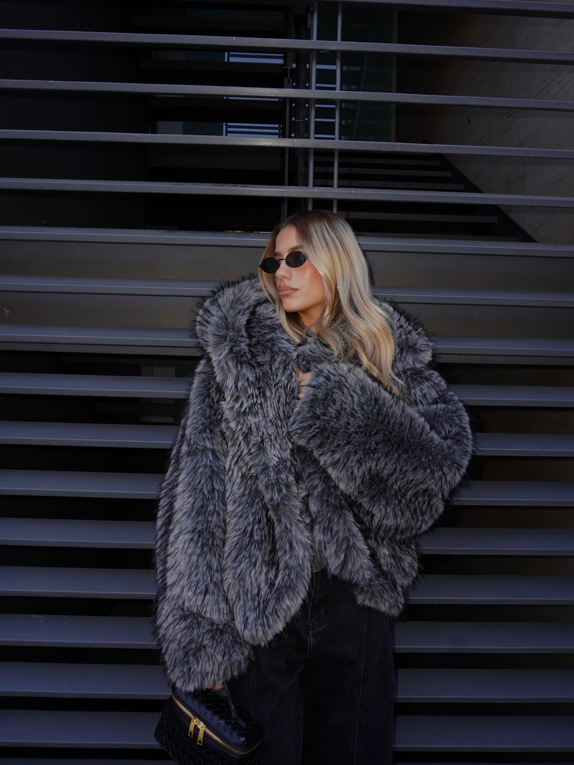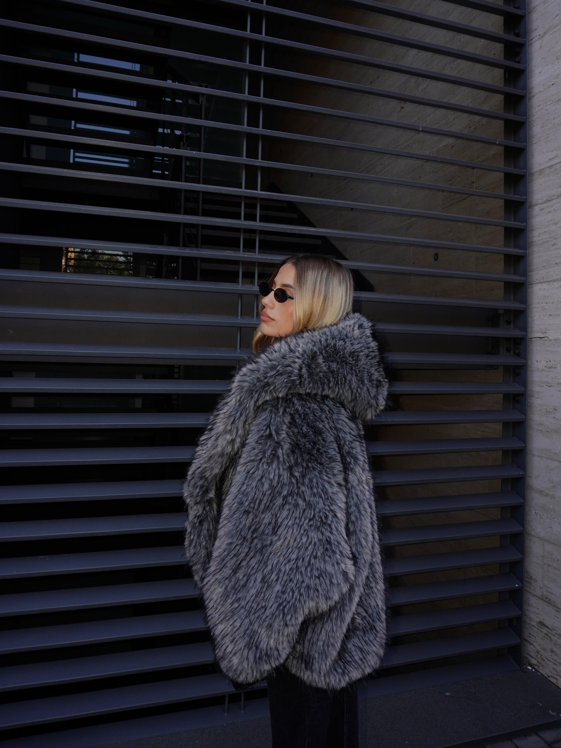 Ecopelliccia con cappuccio. Presenta tasche, chiusura con gancio a clip.