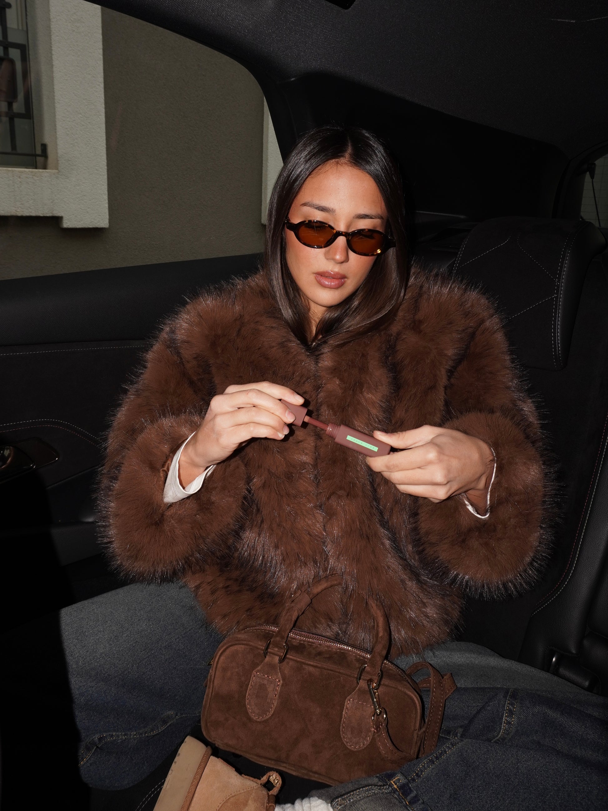 Ecofur foderata modello crop, chiusura con gancetti.