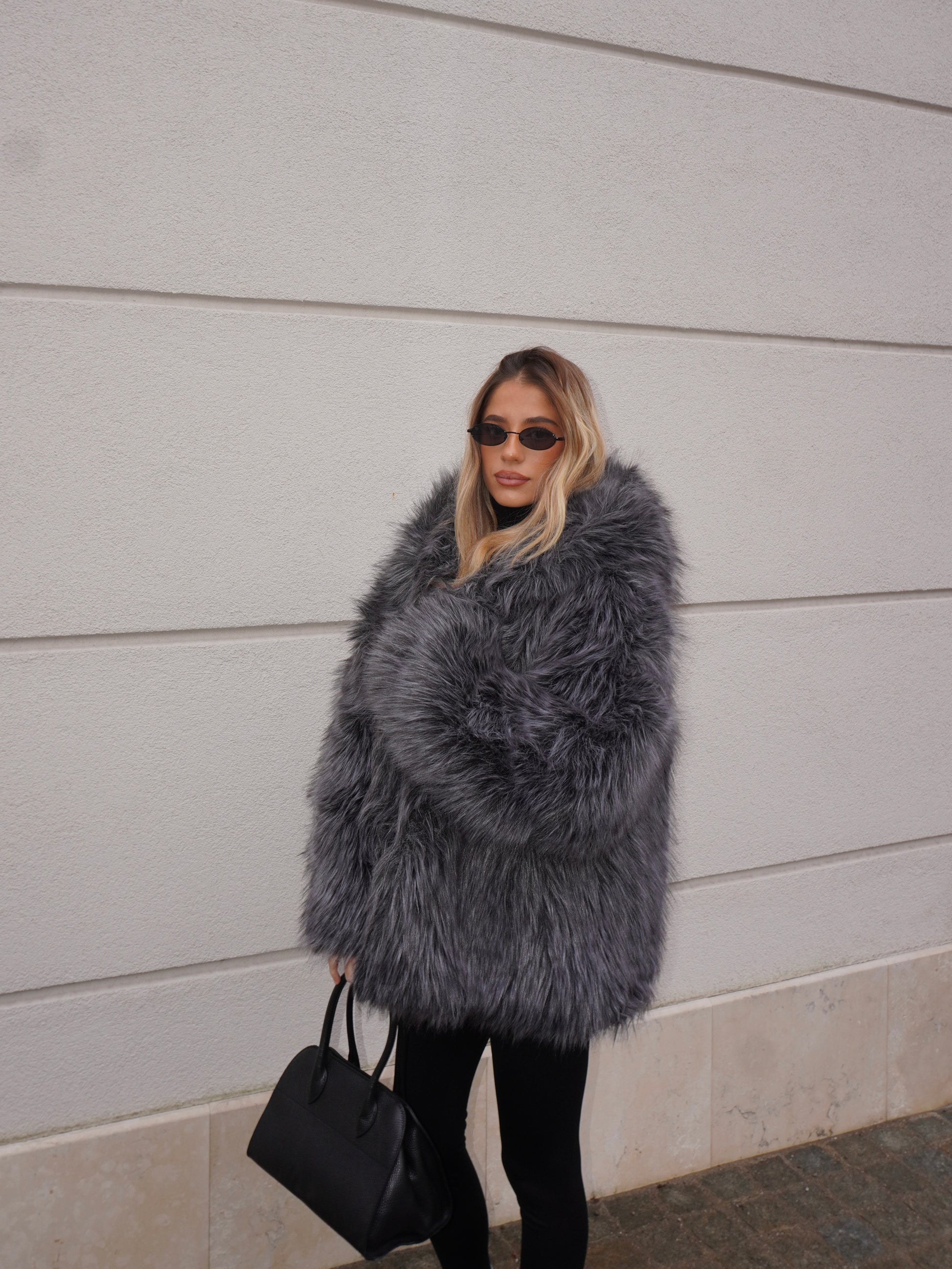 Ecopelliccia con cappuccio grigio sfumato. Presenta tasche, chiusura con bottoni automatici.