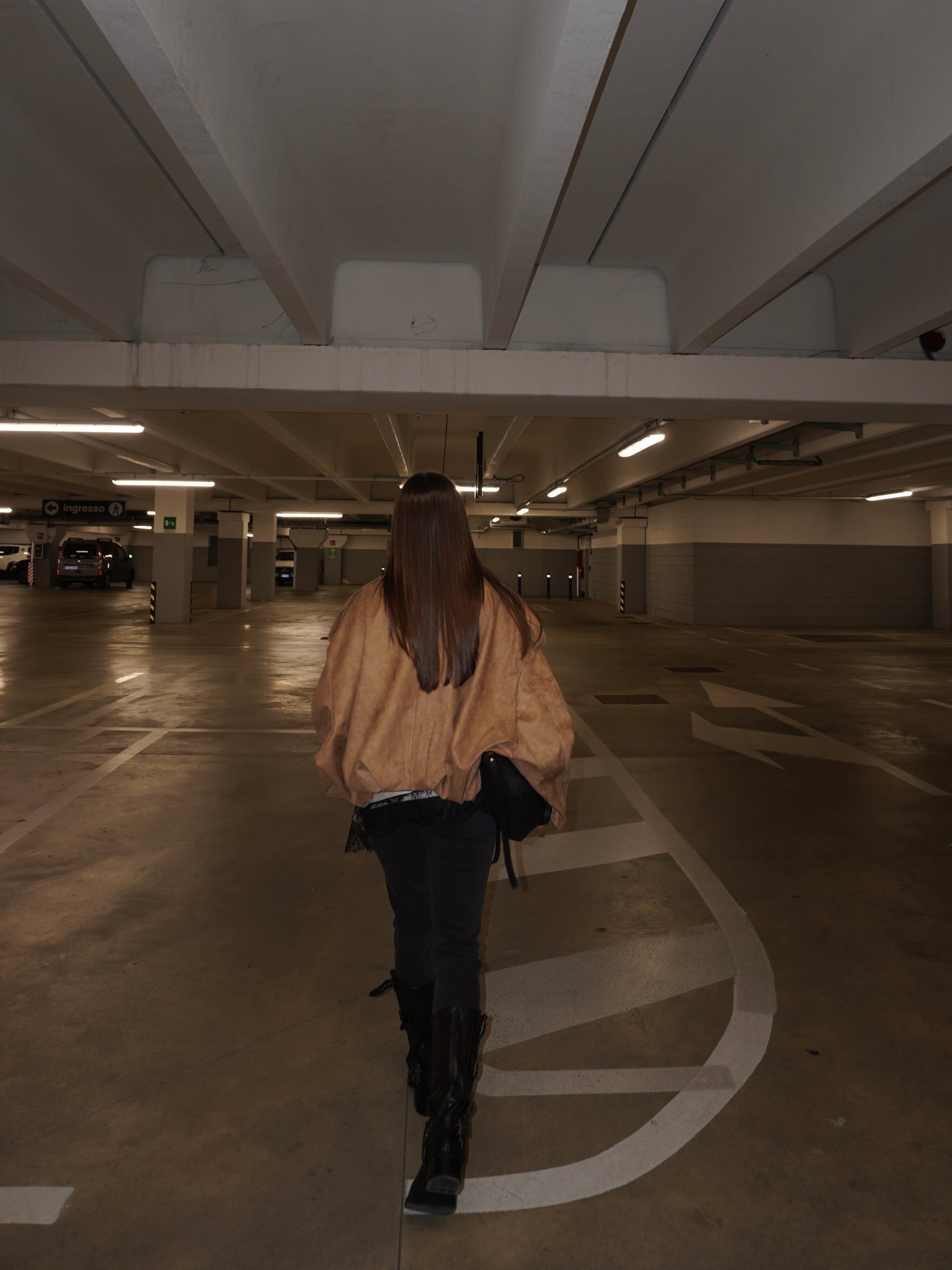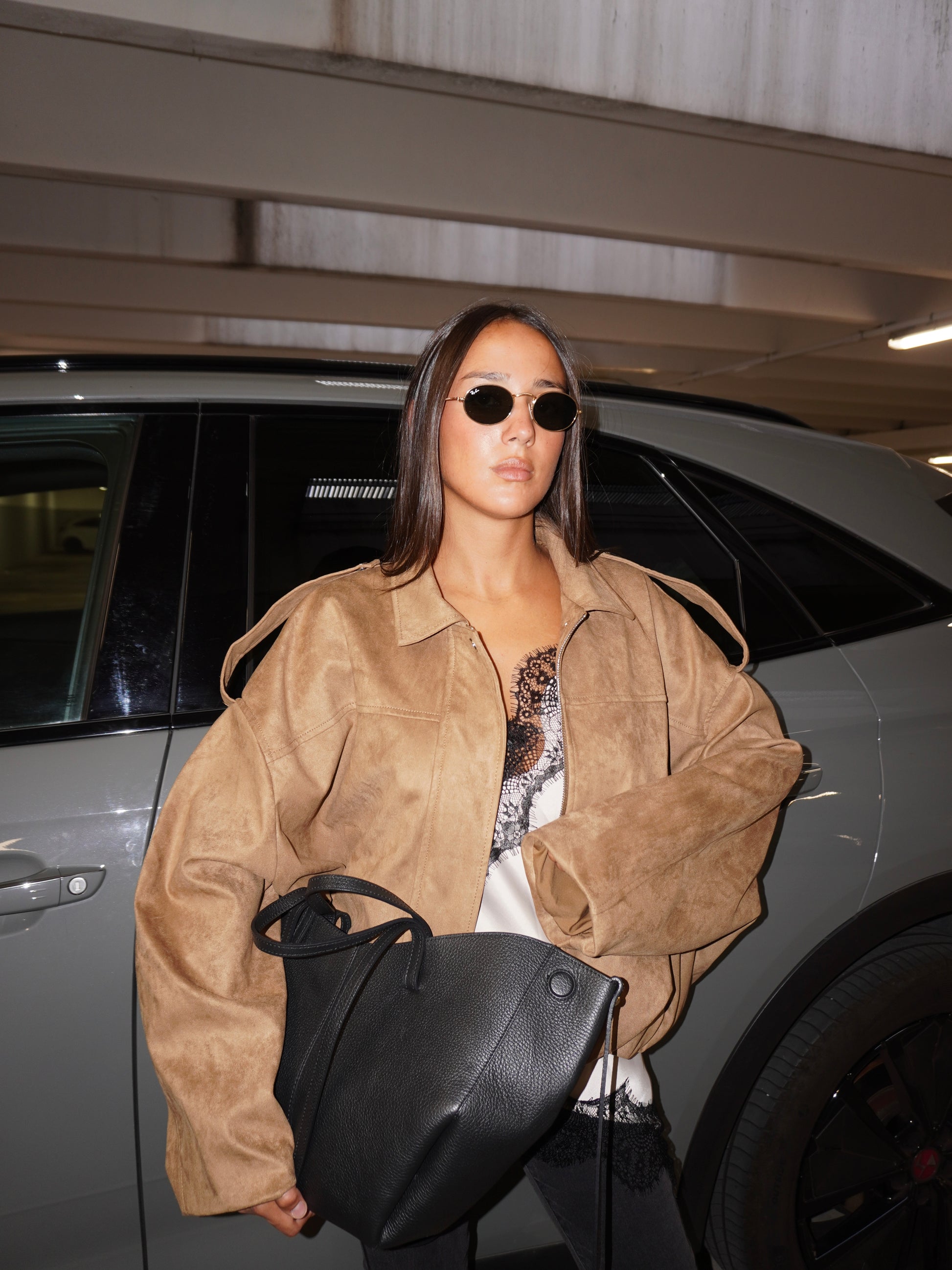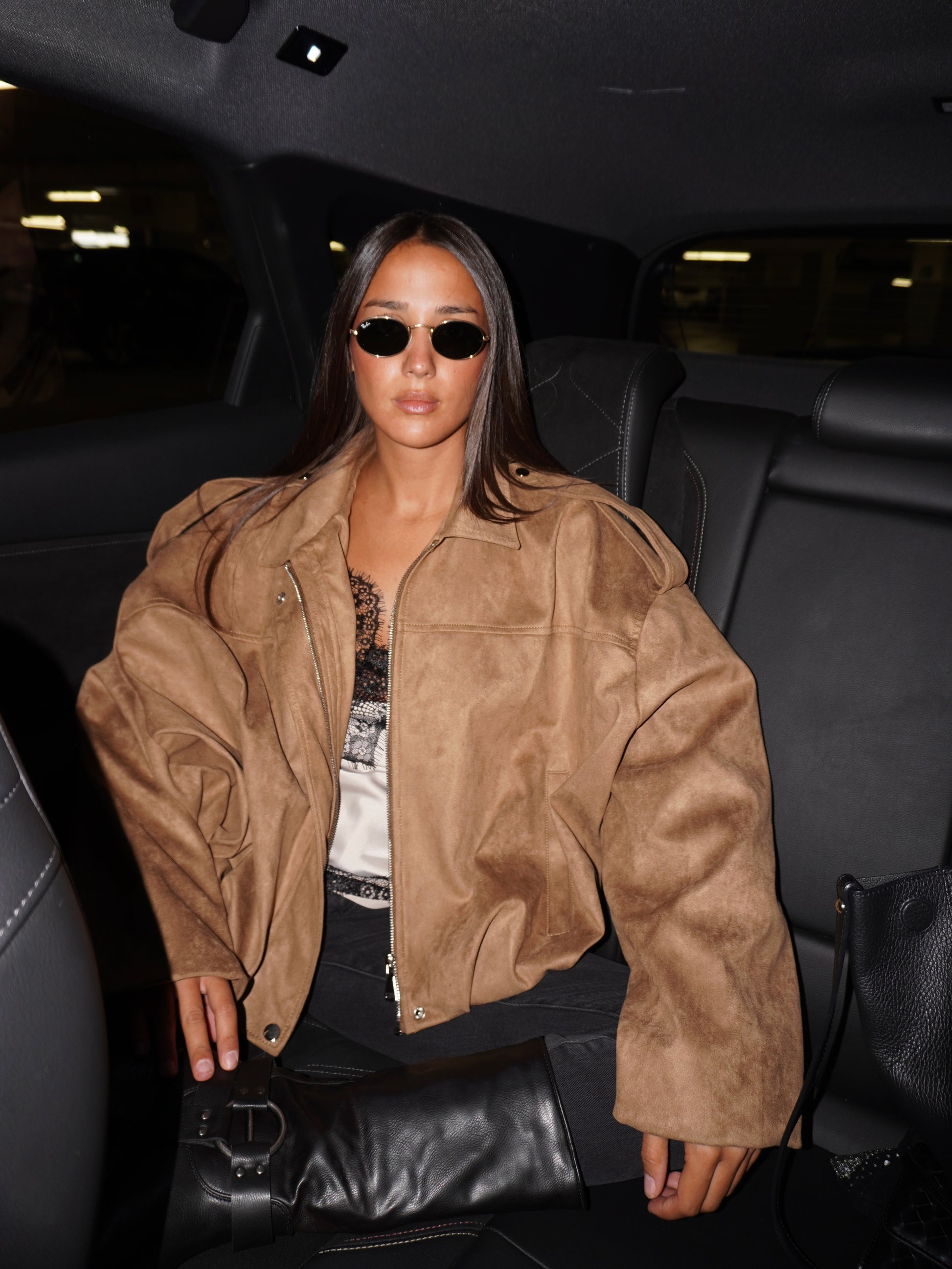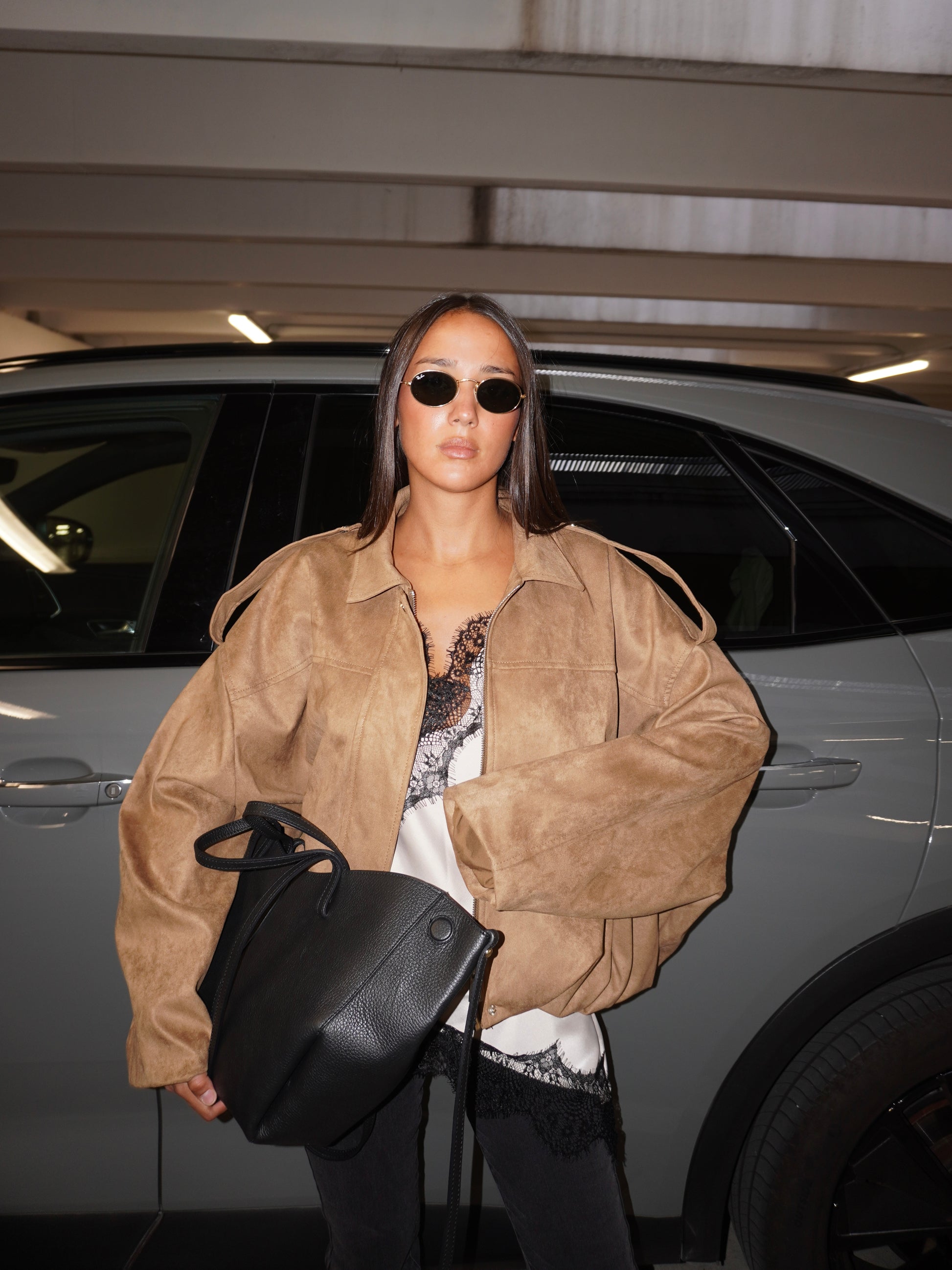Giacca bomber crop in simil camoscio. Presenta tasche, chiusura con zip e bottoni. Foderato all'interno.