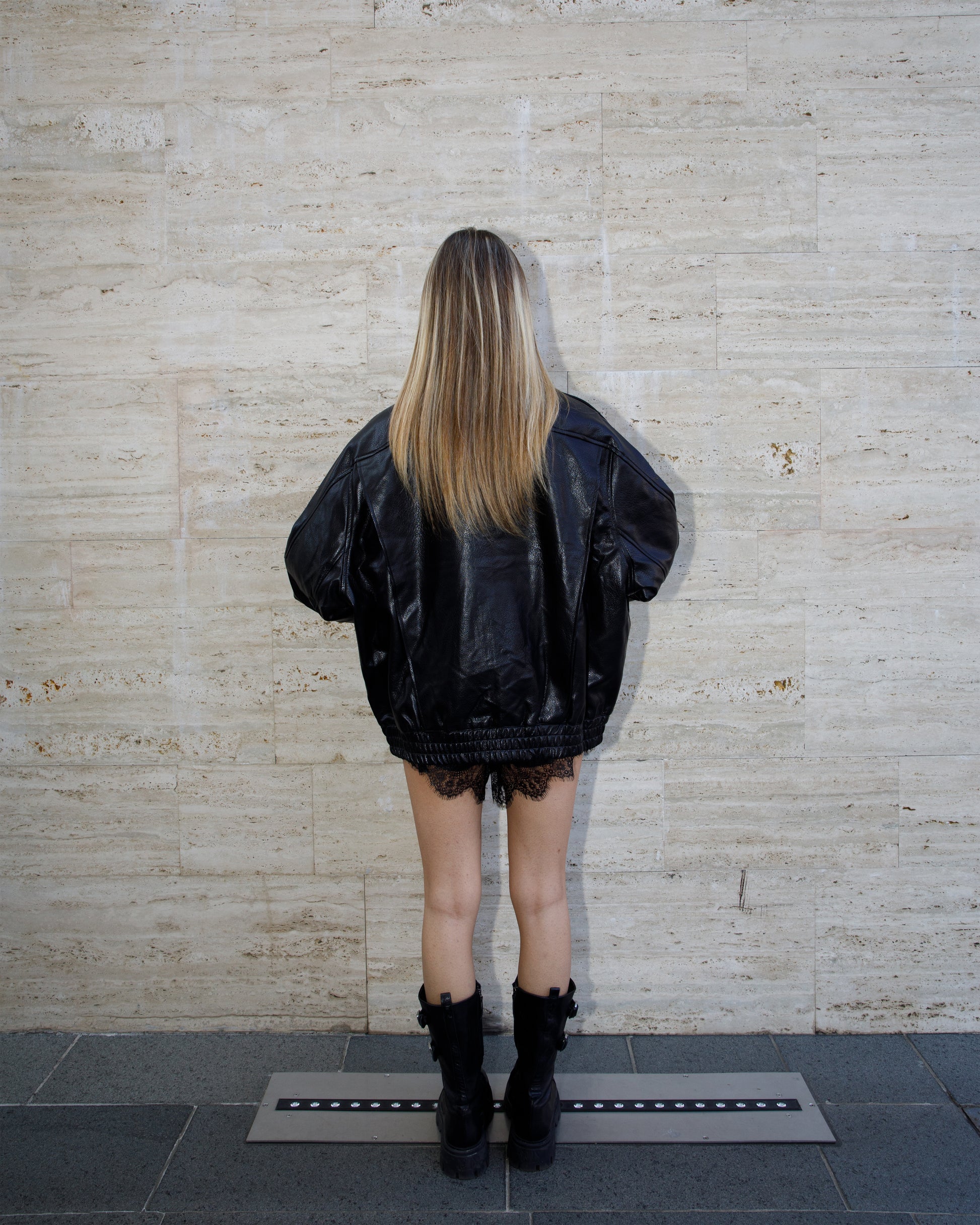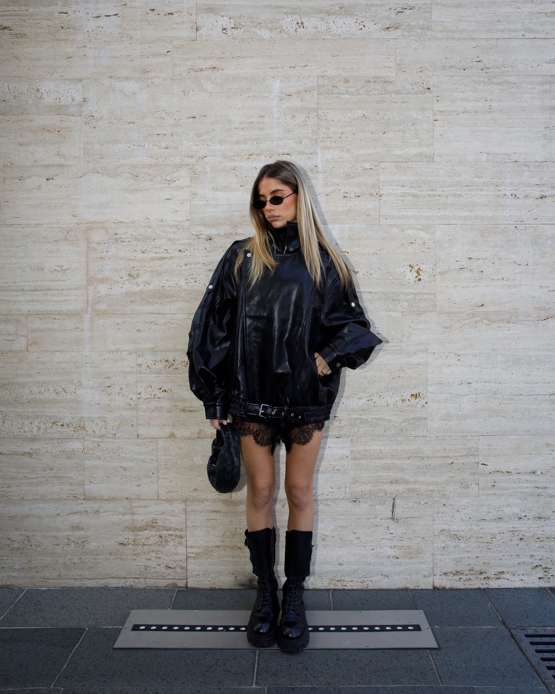 Giacca biker oversize con collo alto in ecopelle martellata. Maniche lunghe con passanti sulle spalle. Tasche laterali. Fodera interna. Chiusura con cerniera, patta con bottoni automatici e cintura.