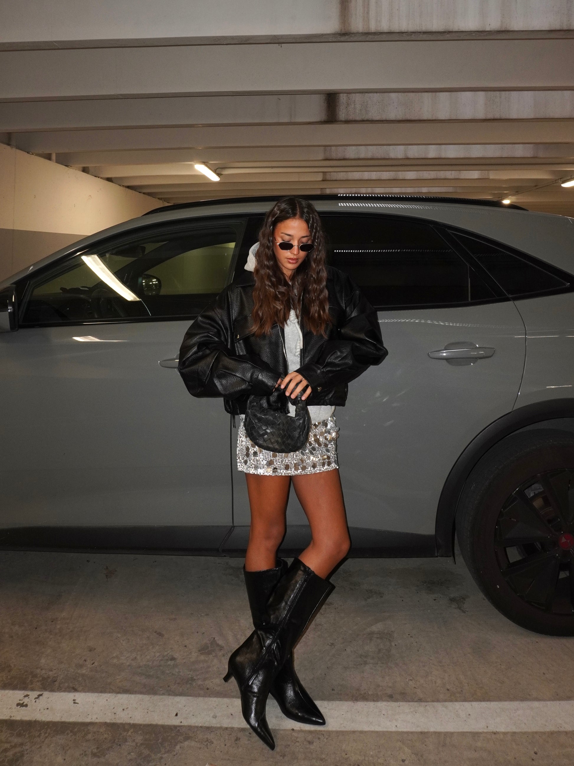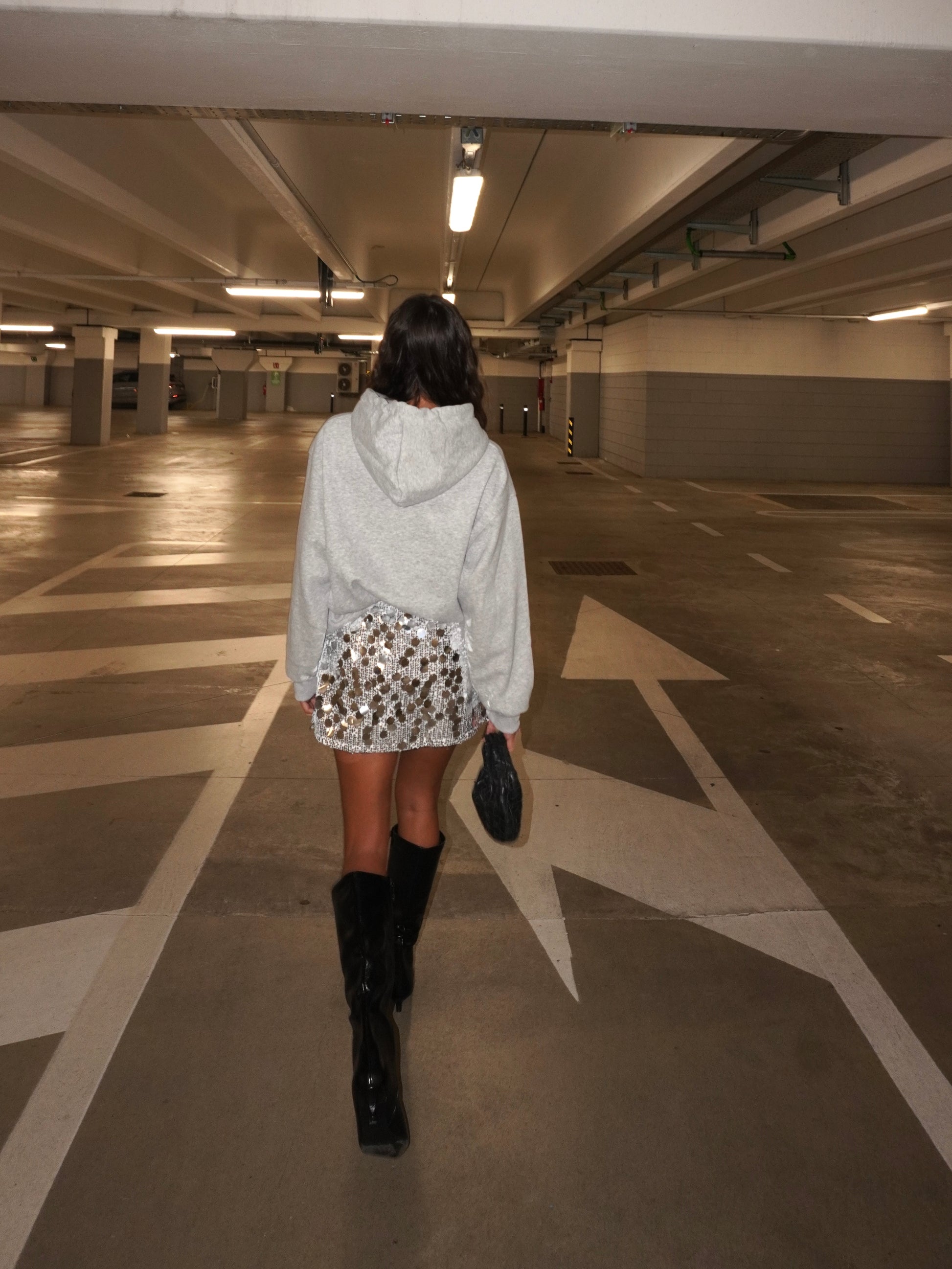 Minigonna a vita alta con paillettes grandi e piccole a cerchio. Chiusura con zip laterale invisibile. Foderata.