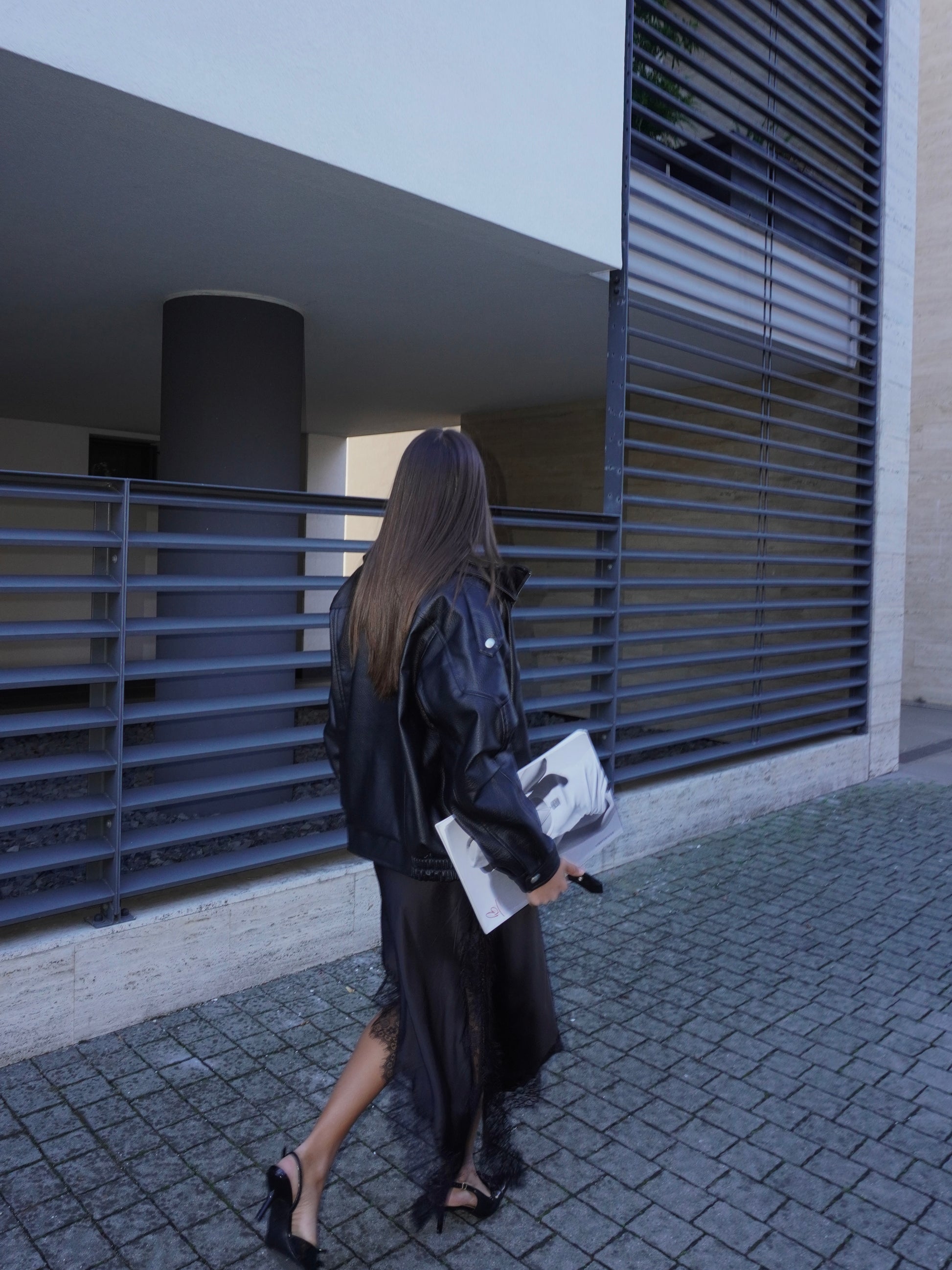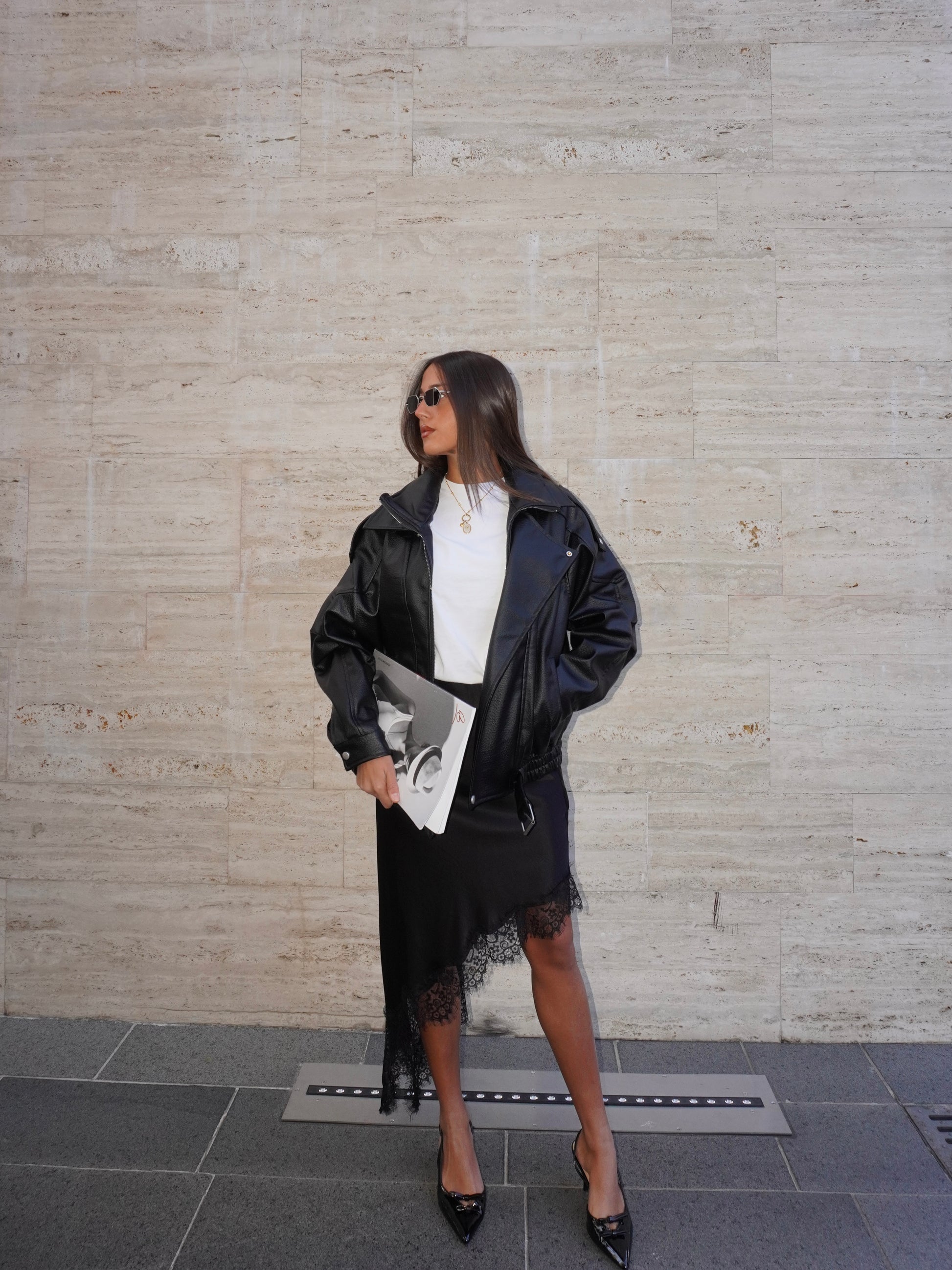 Gonna satinata in misto Viscosa. Linea asimmetrica. Rifiniture in pizzo.