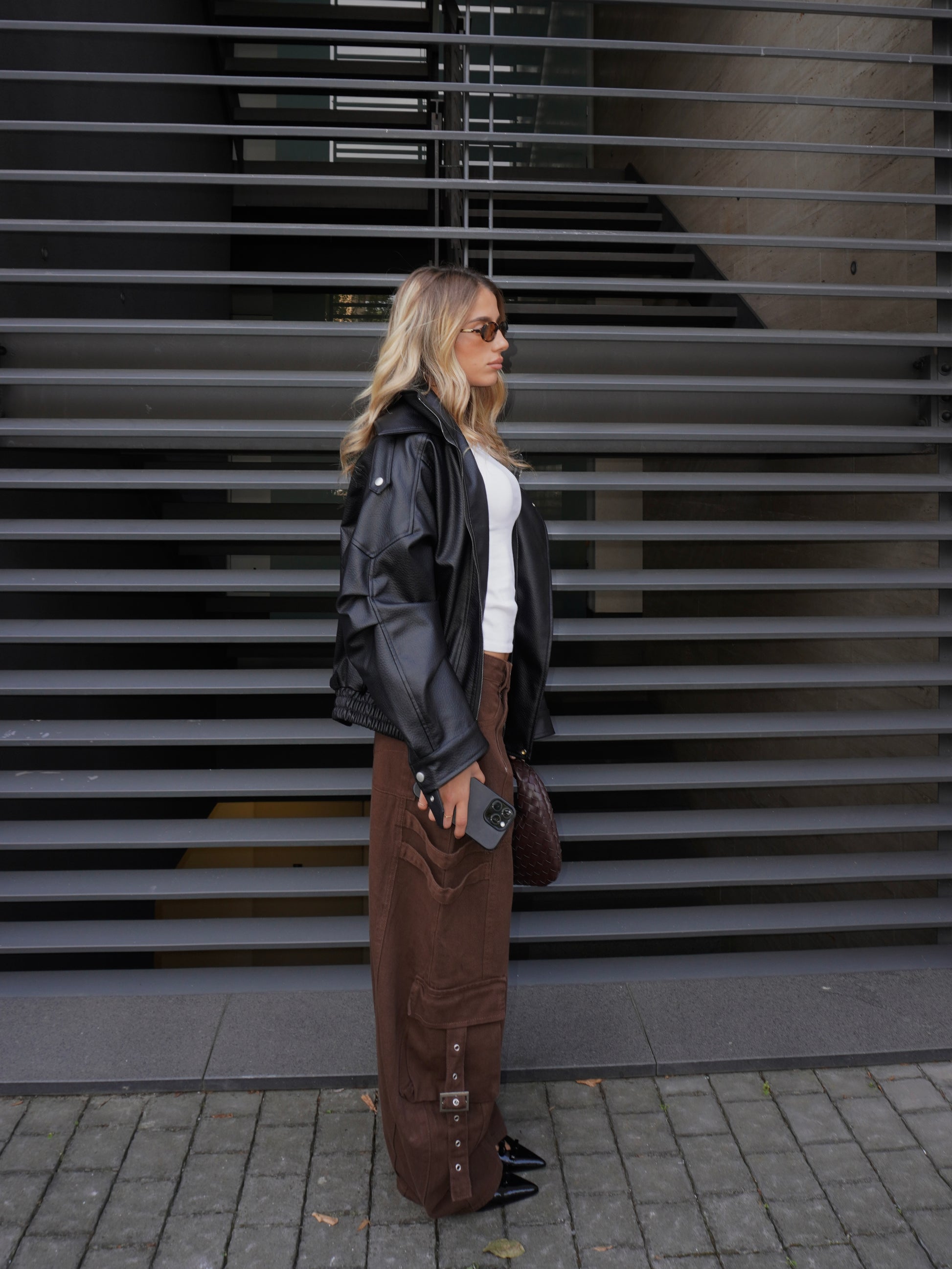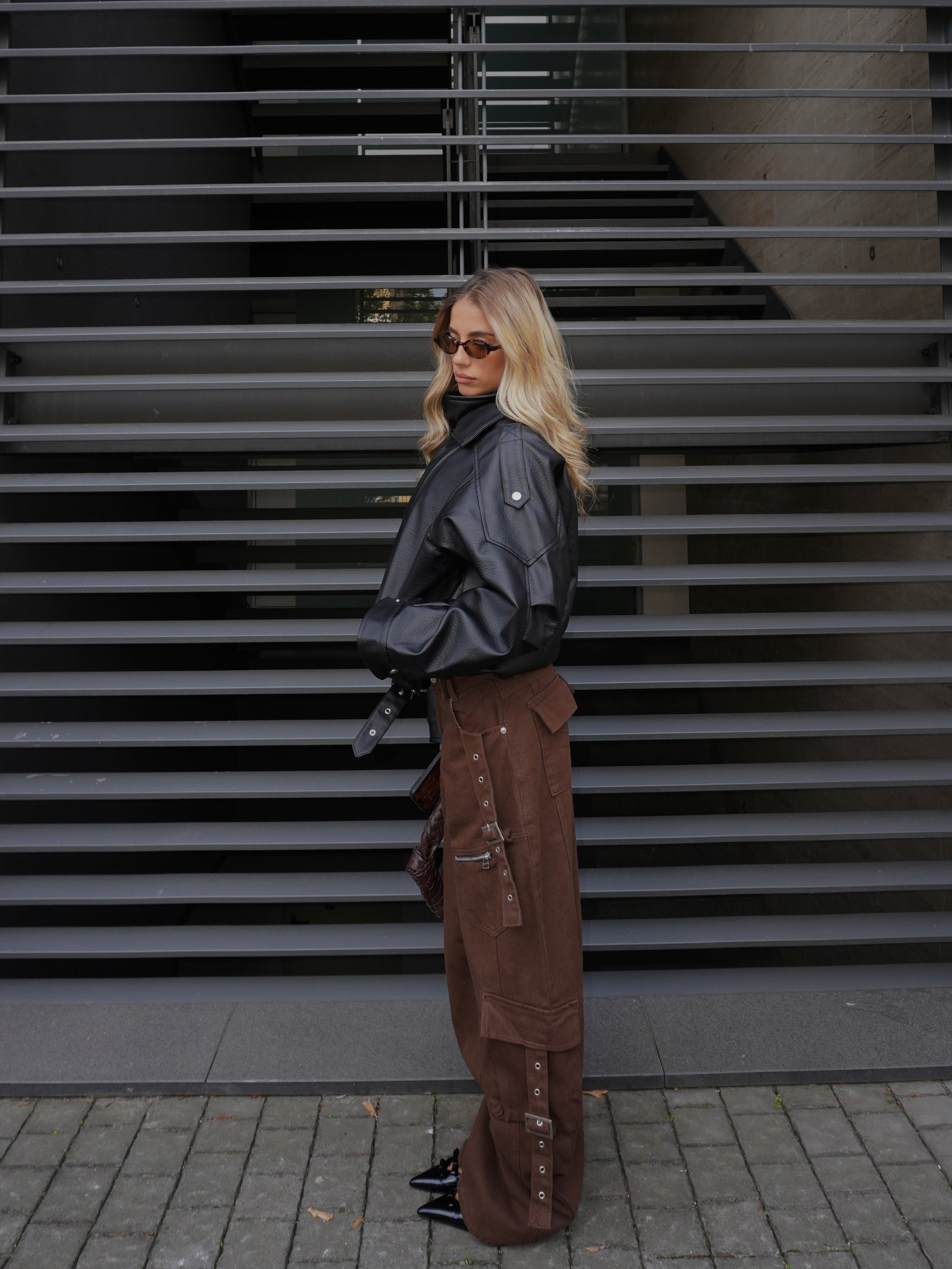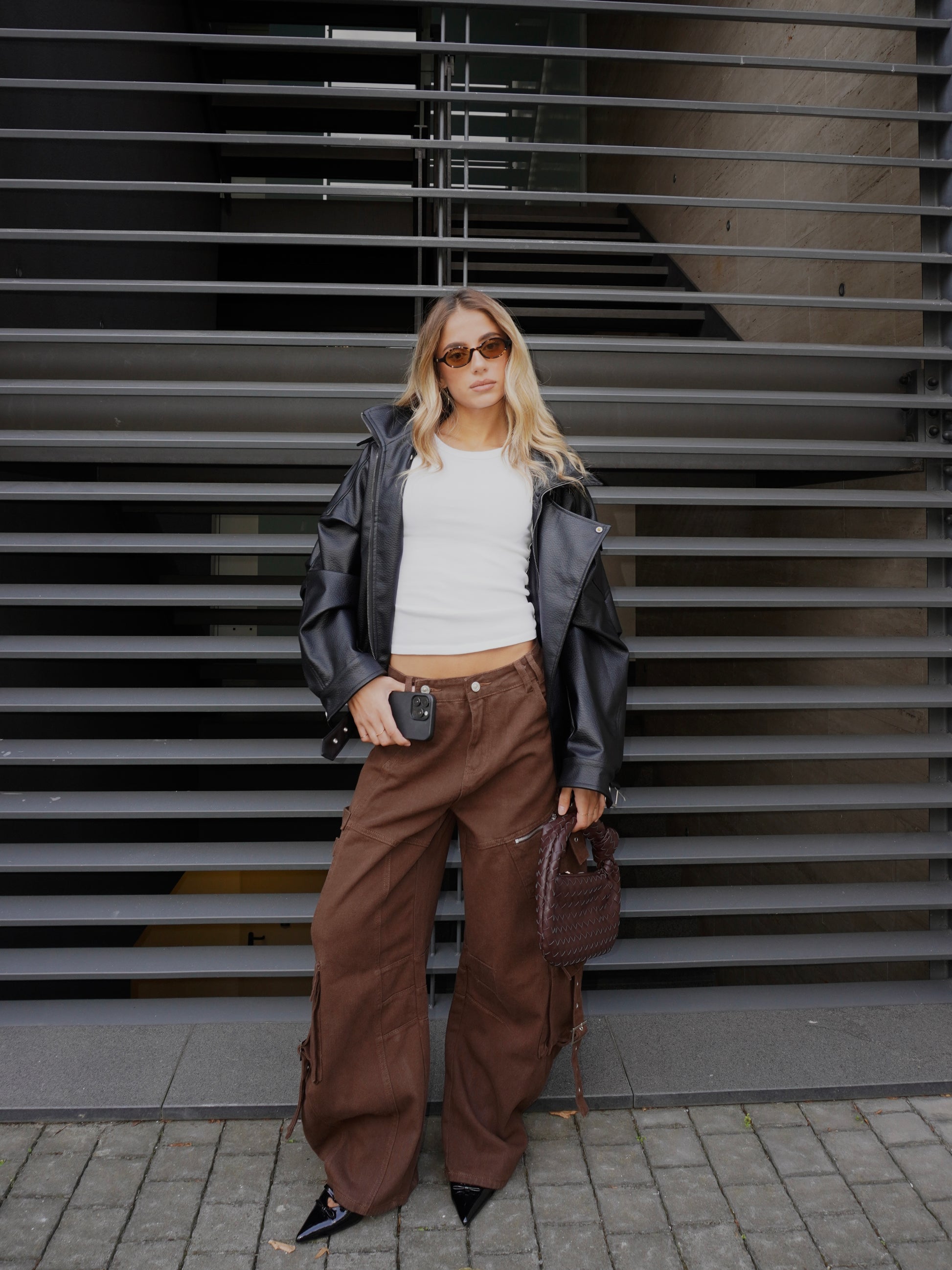Jeans modello baggy con dettaglio di fibbie e tasconi. Chiusura con zip e bottone.
