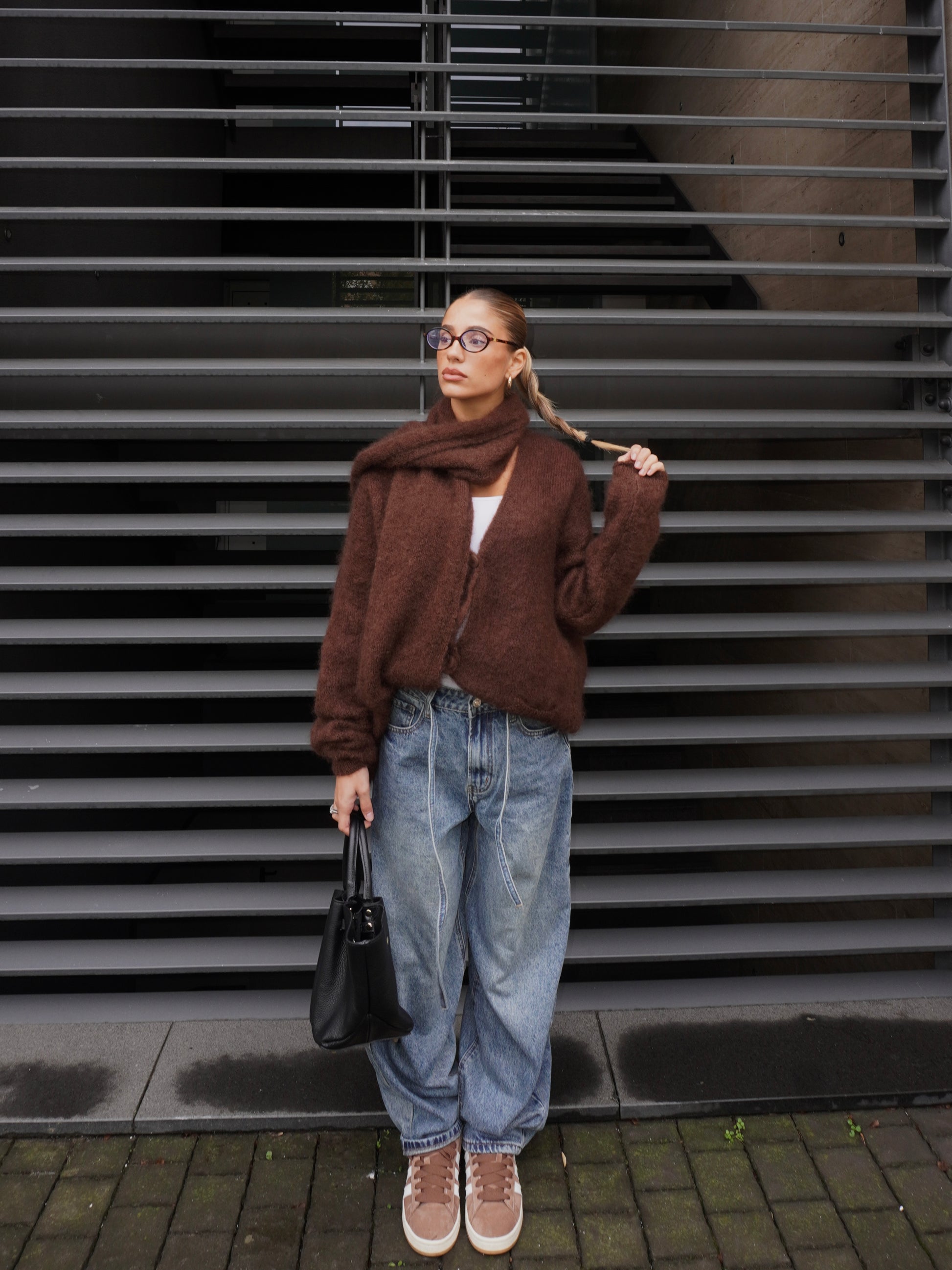 Jeans modello mom fit con dettaglio di laccio cintura rimovibile. Chiusura con zip e bottone. Presenza di cinque tasche.