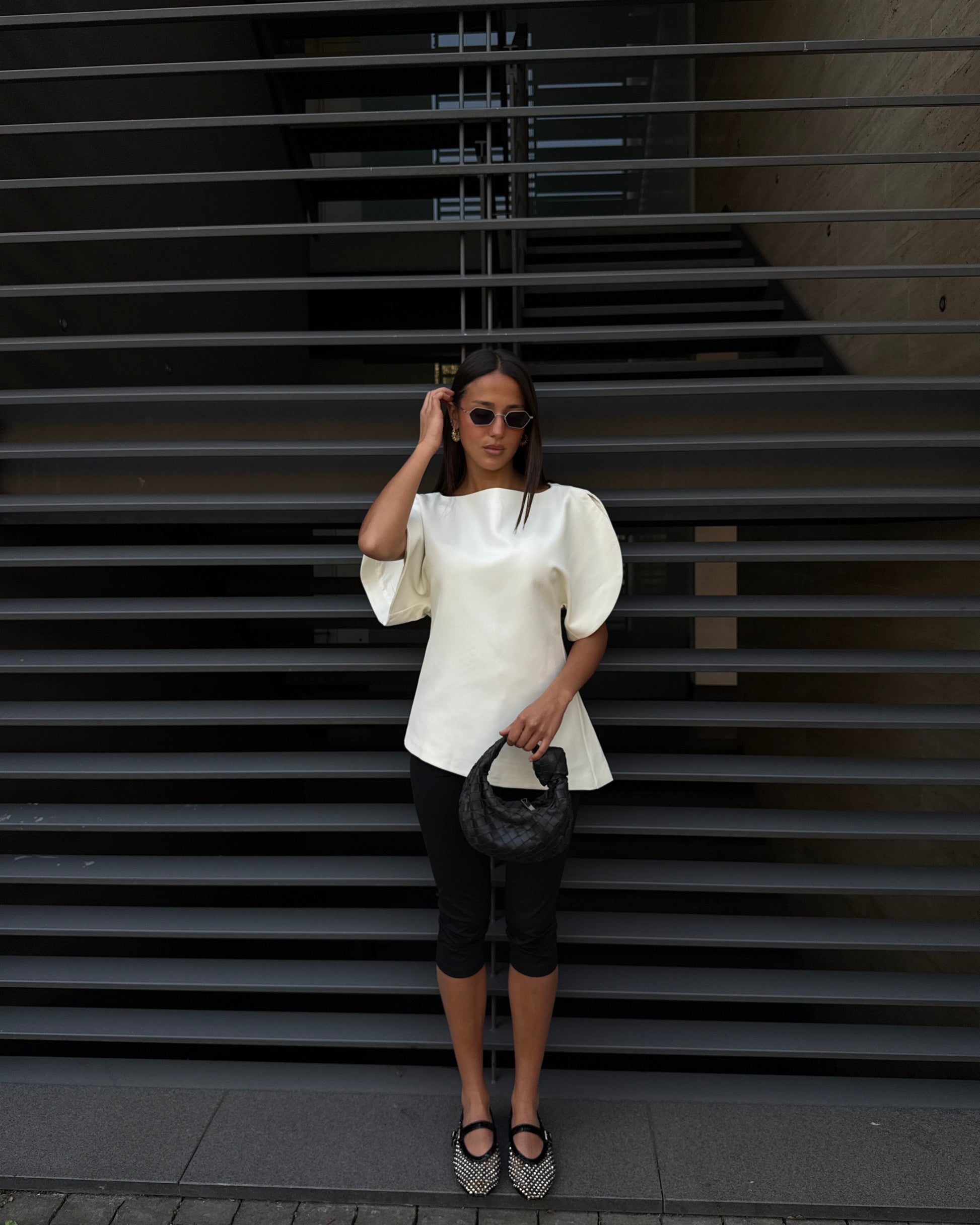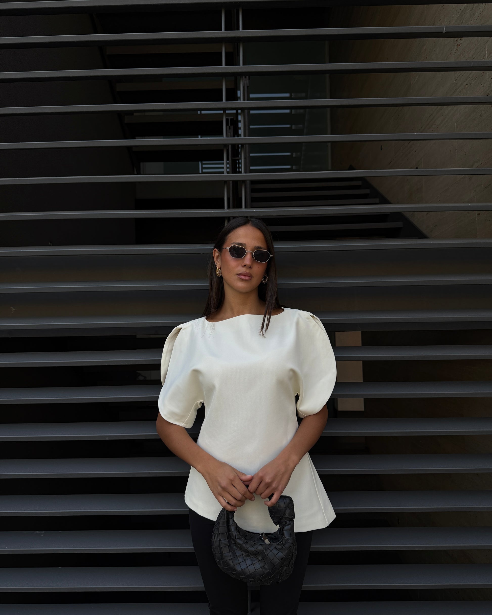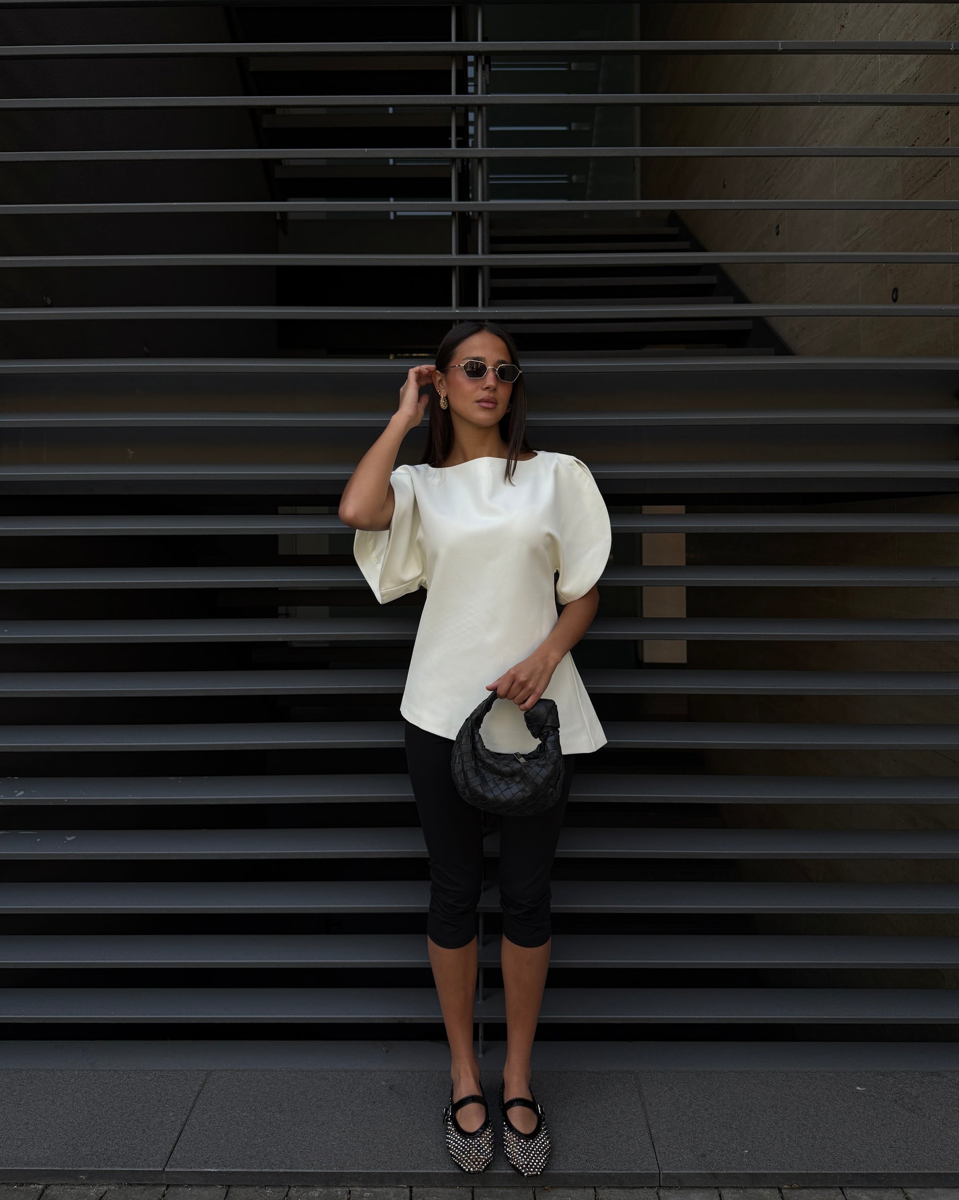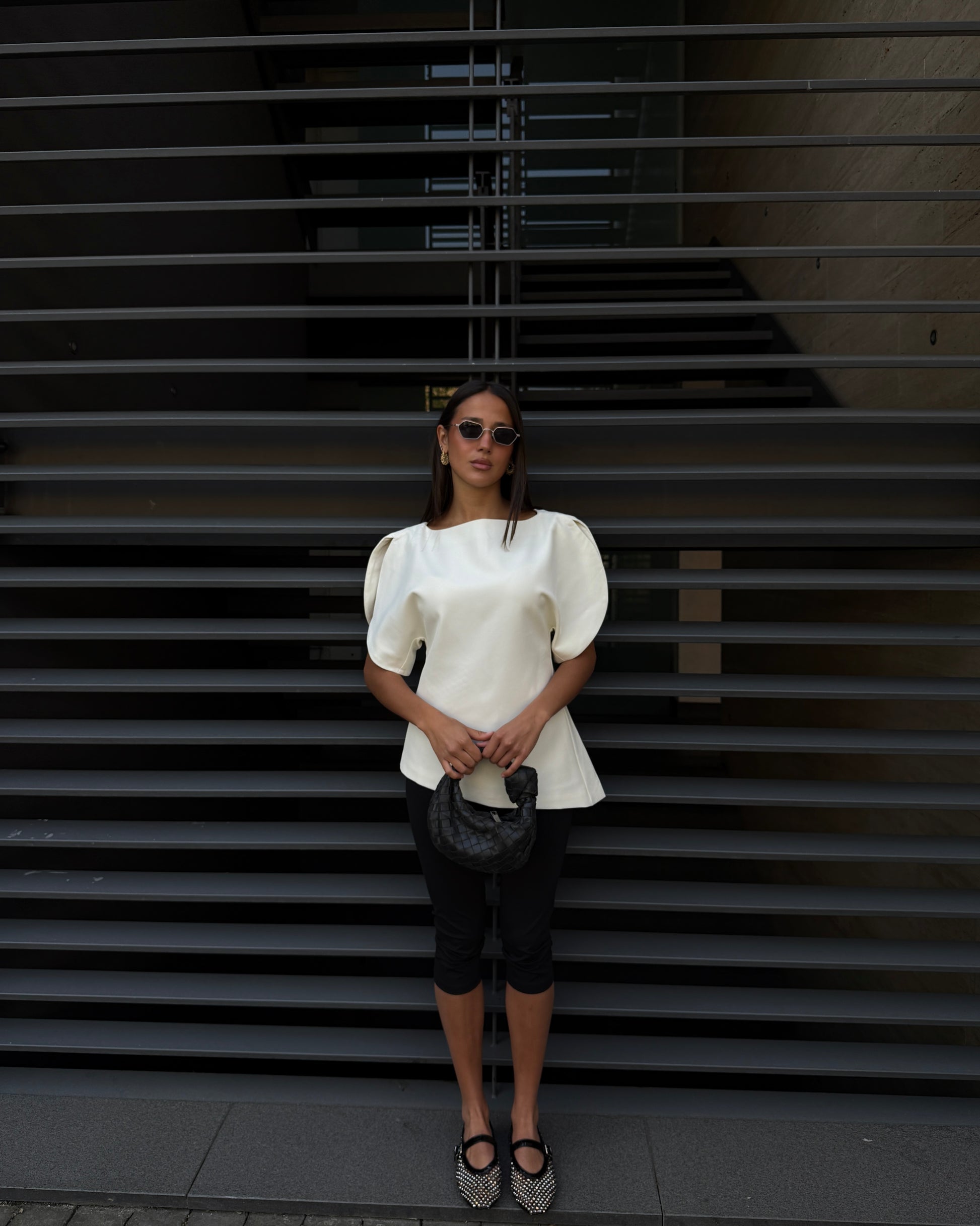 Maglia asimmetrica con maniche balloon con aperture laterali. Chiusura con zip posteriore.