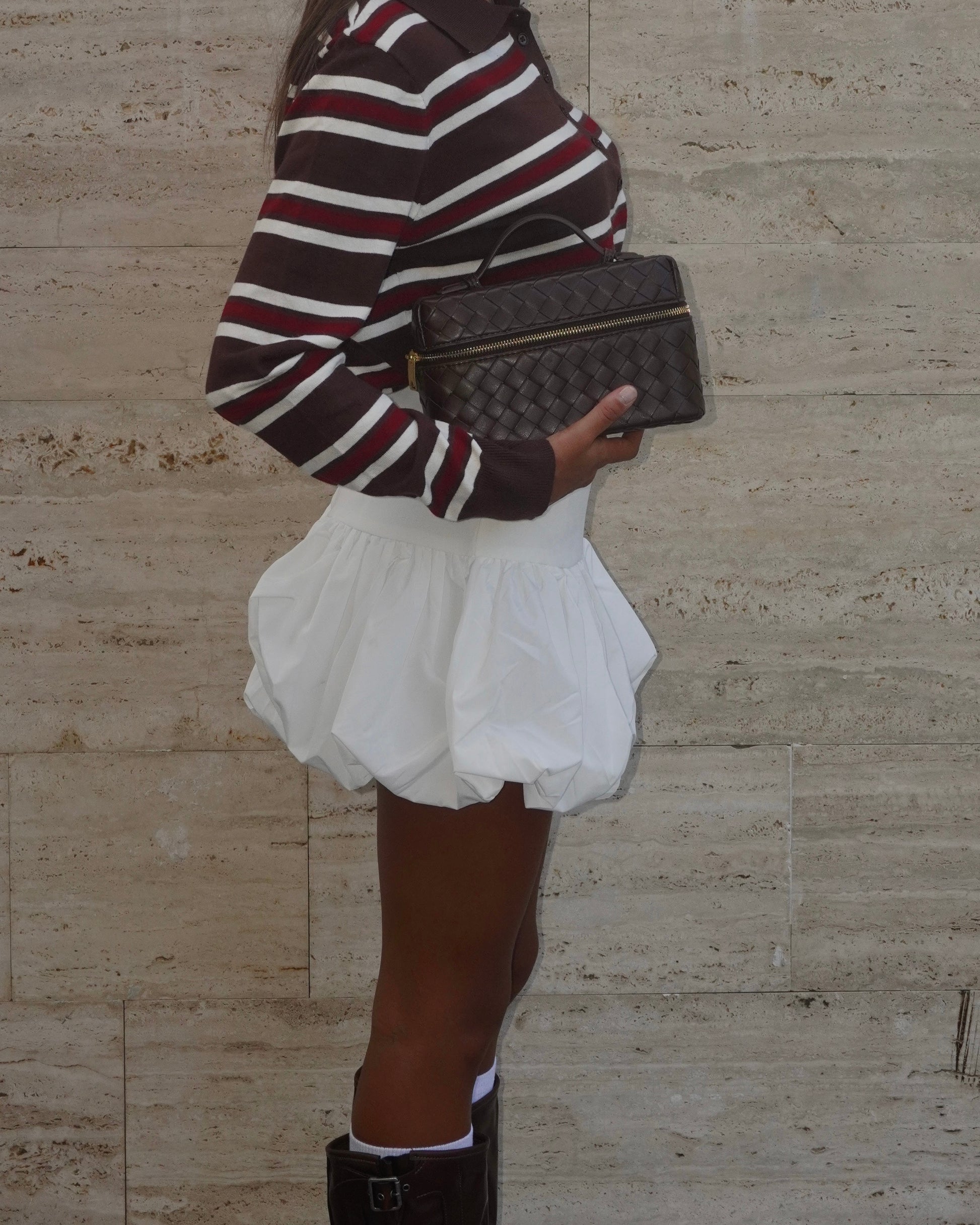 Minigonna a palloncino con fascia alta. Chiusura con zip invisibile posteriore.
