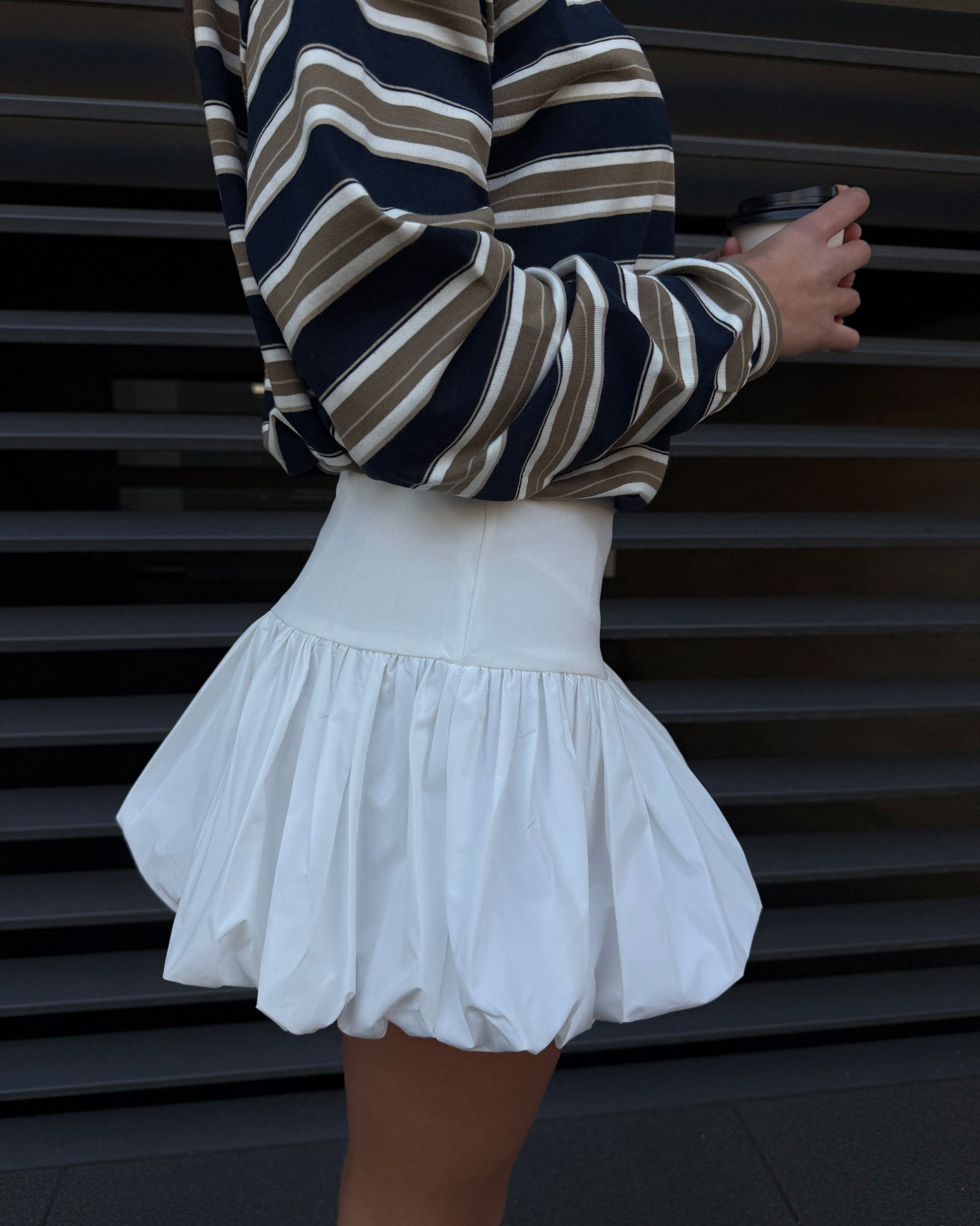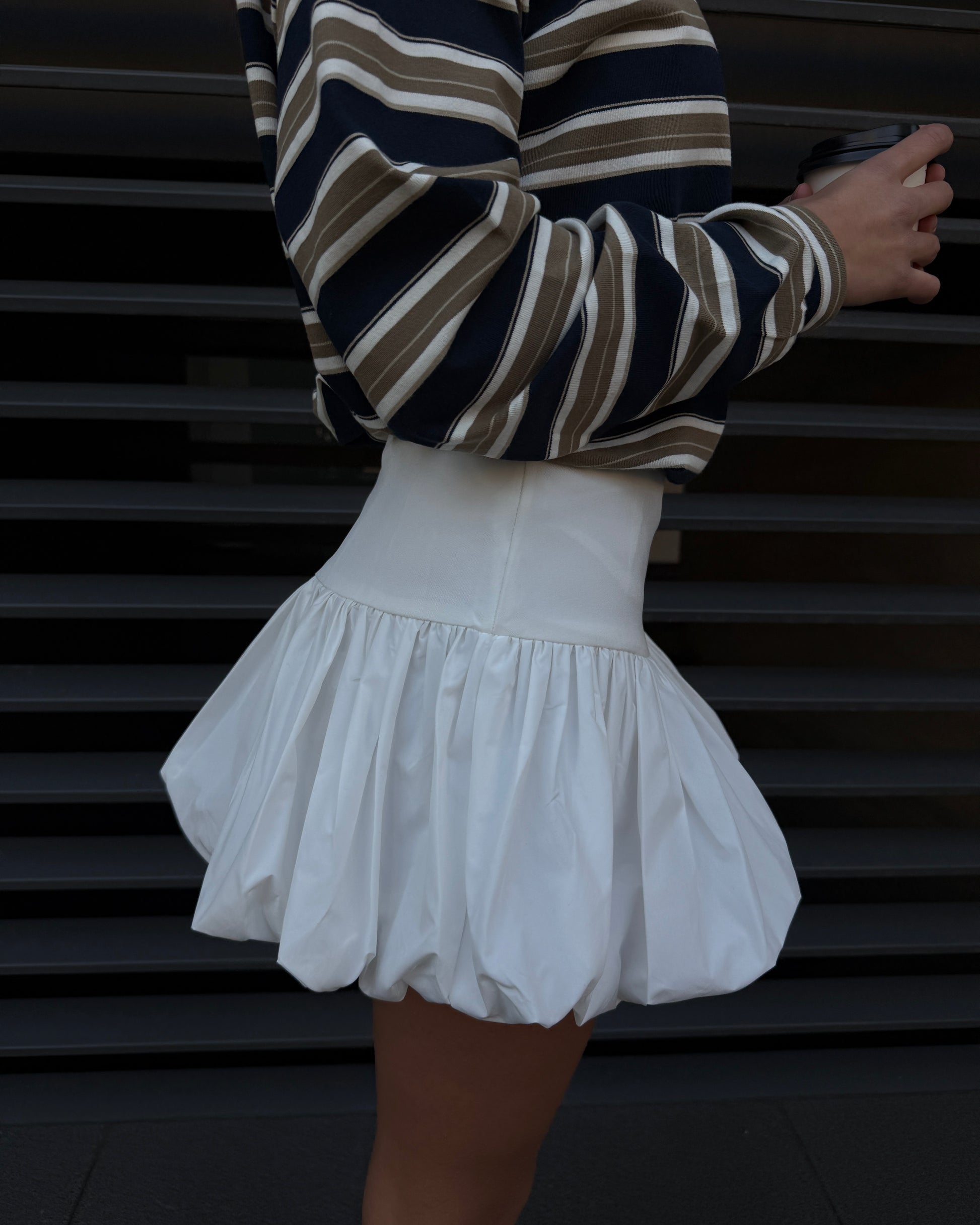 Minigonna a palloncino con fascia alta. Chiusura con zip invisibile posteriore.