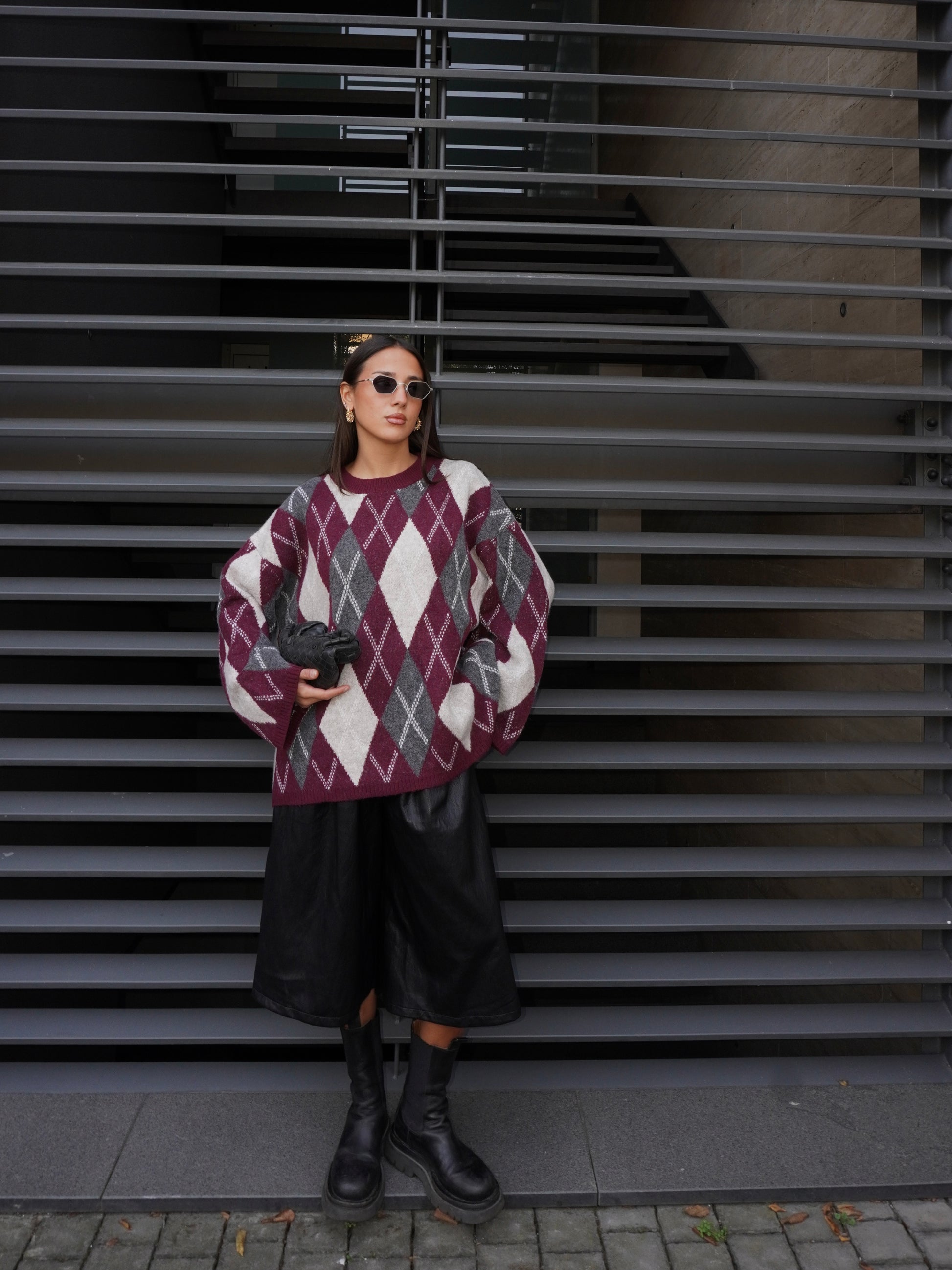 Bermuda in ecopelle lungo oversize. Presenta pinces frontali e coulisse posteriore. Chiusura con zip e bottone centrale.