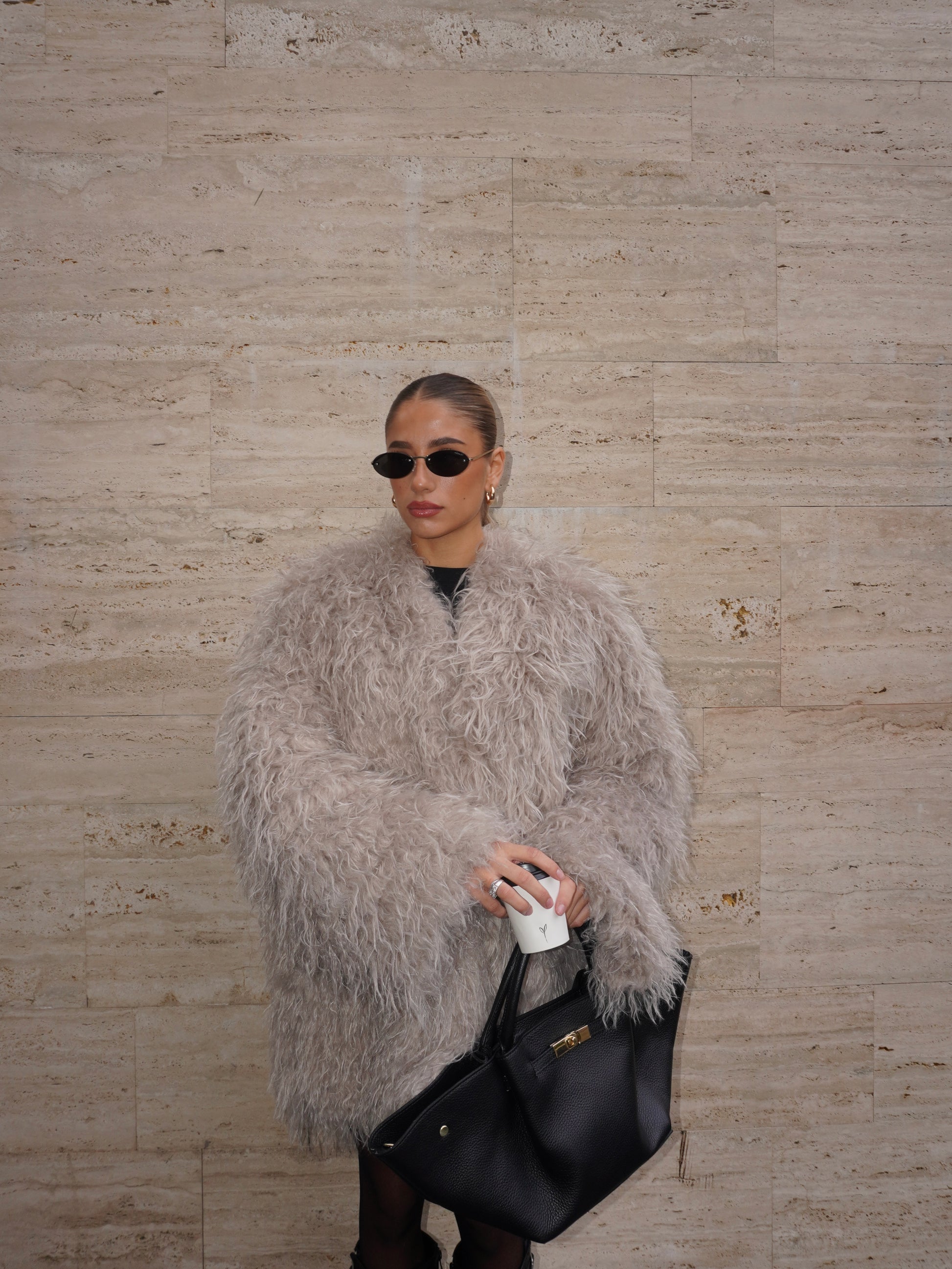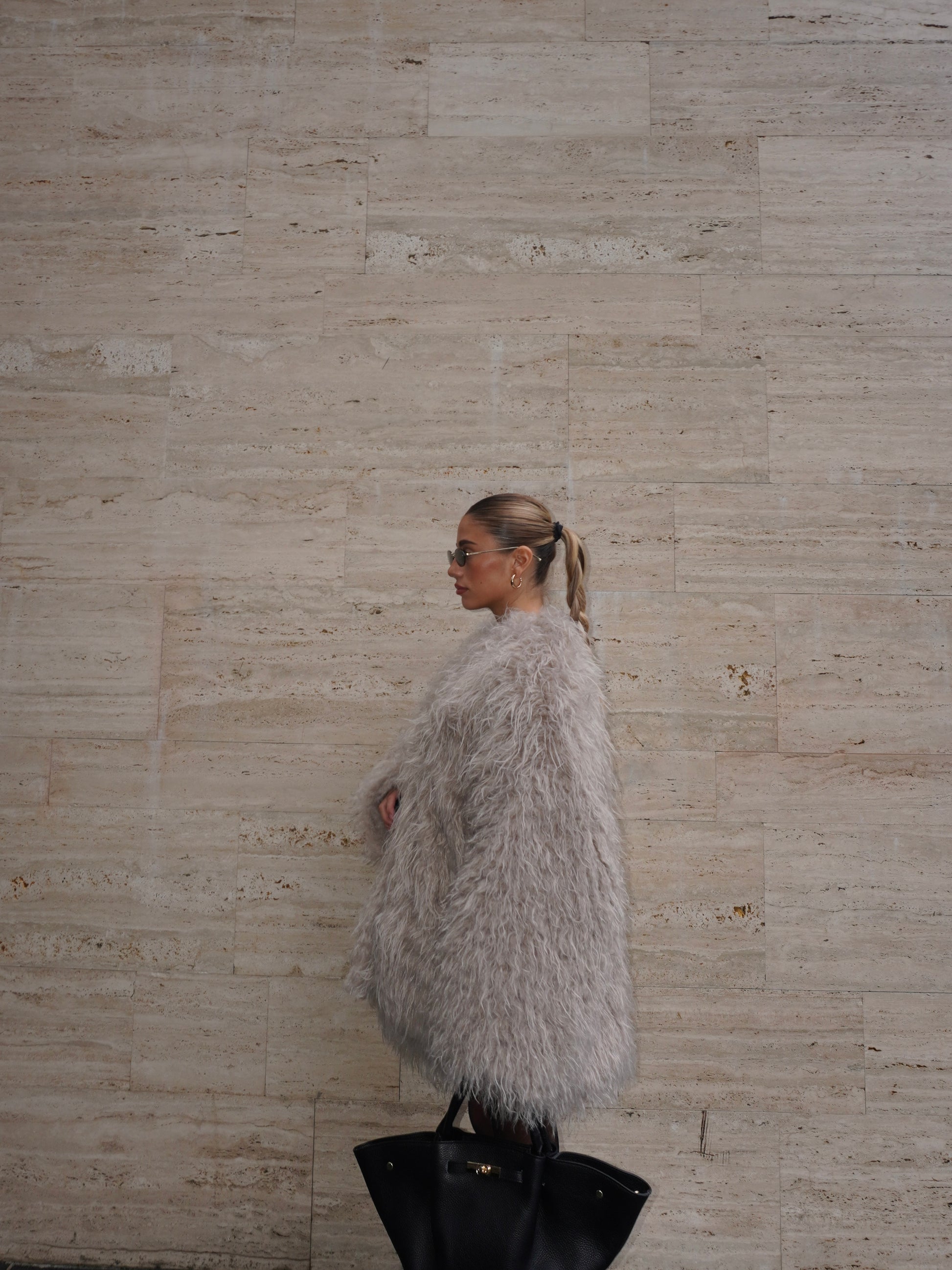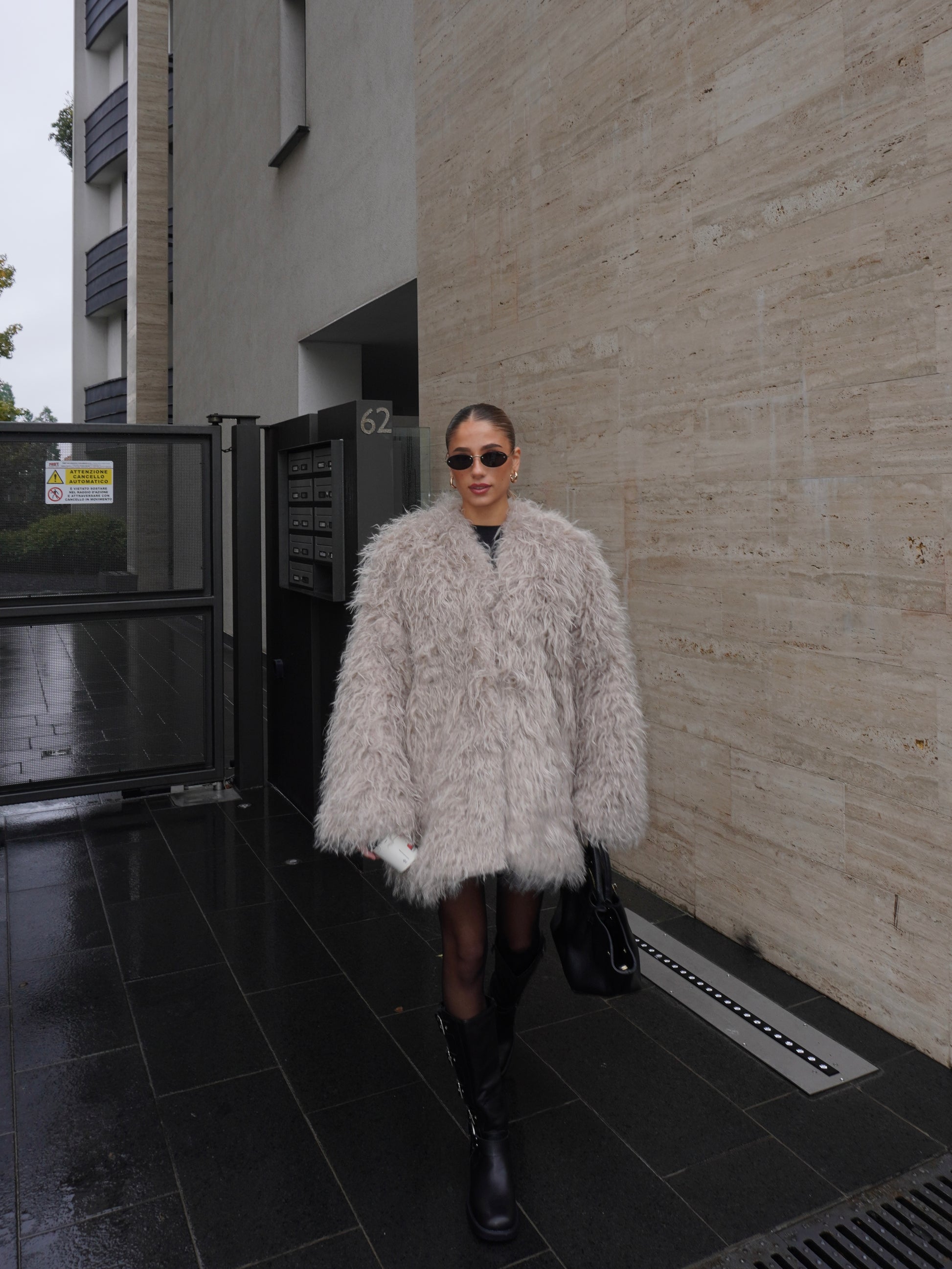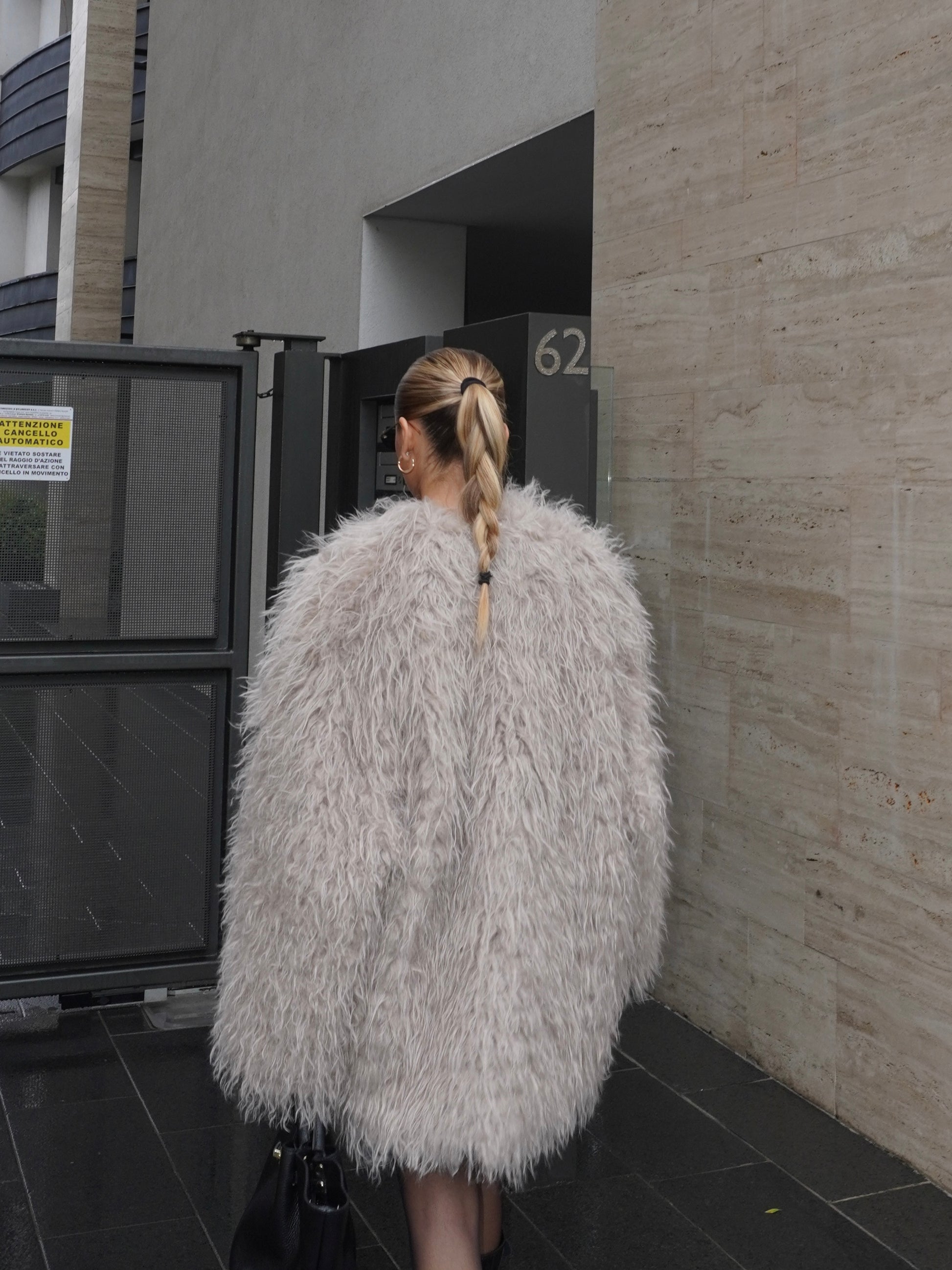 Cappotto realizzato in pelliccia sintetica. Presenta tasche laterali. Chiusura frontale con ganci nascosti. Interno foderato.