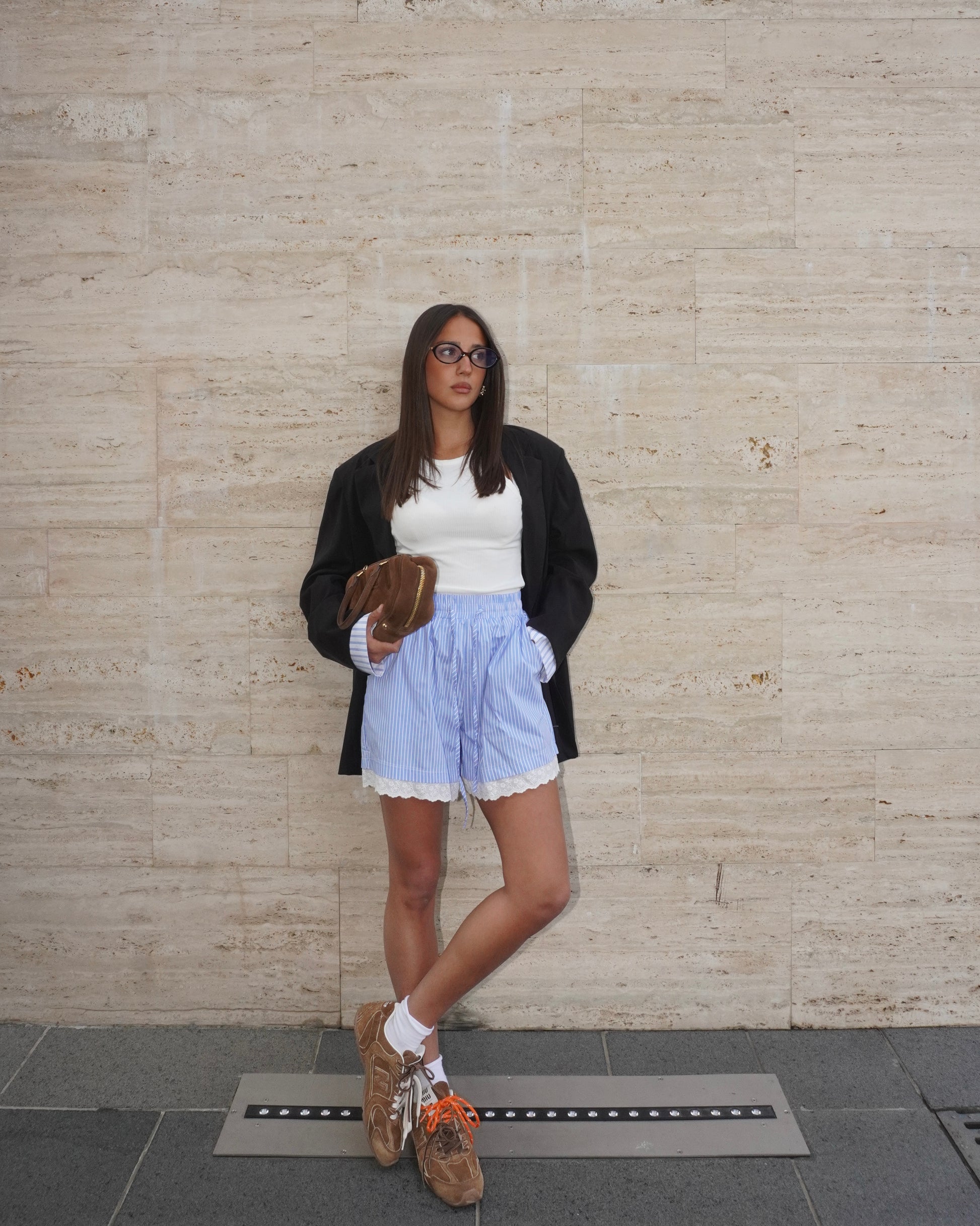 Shorts a righe con dettaglio di inserto in pizzo. Presenta elastico in vita con laccio. Presenta tasche.