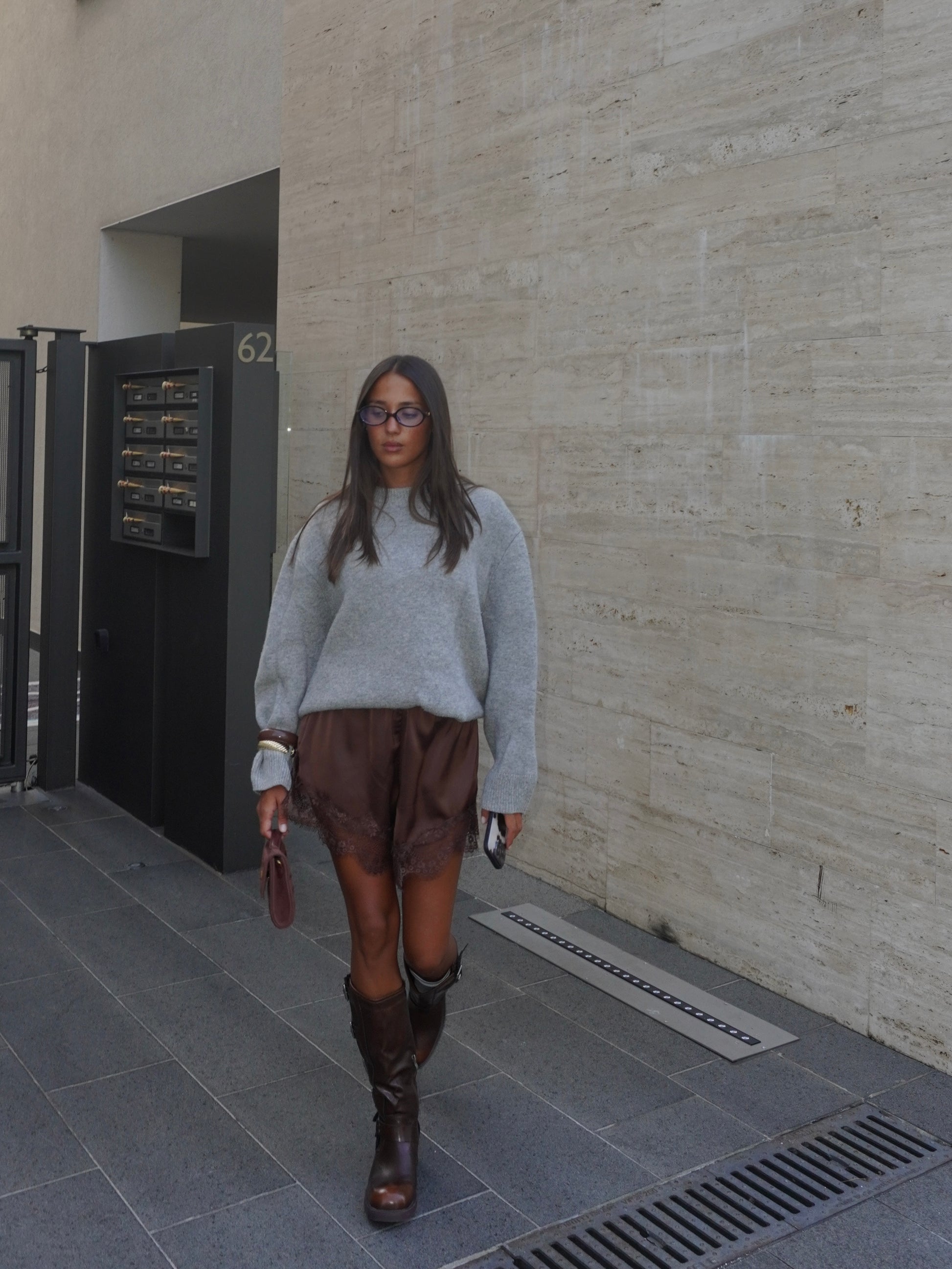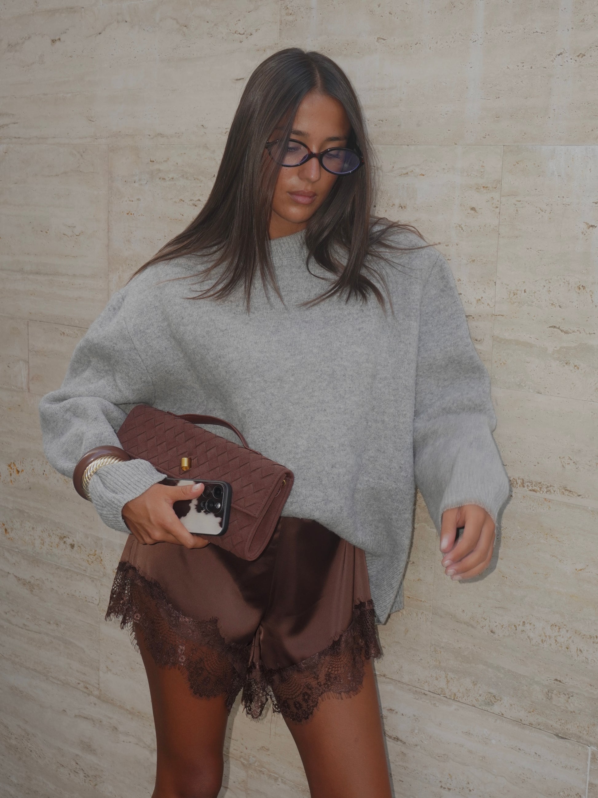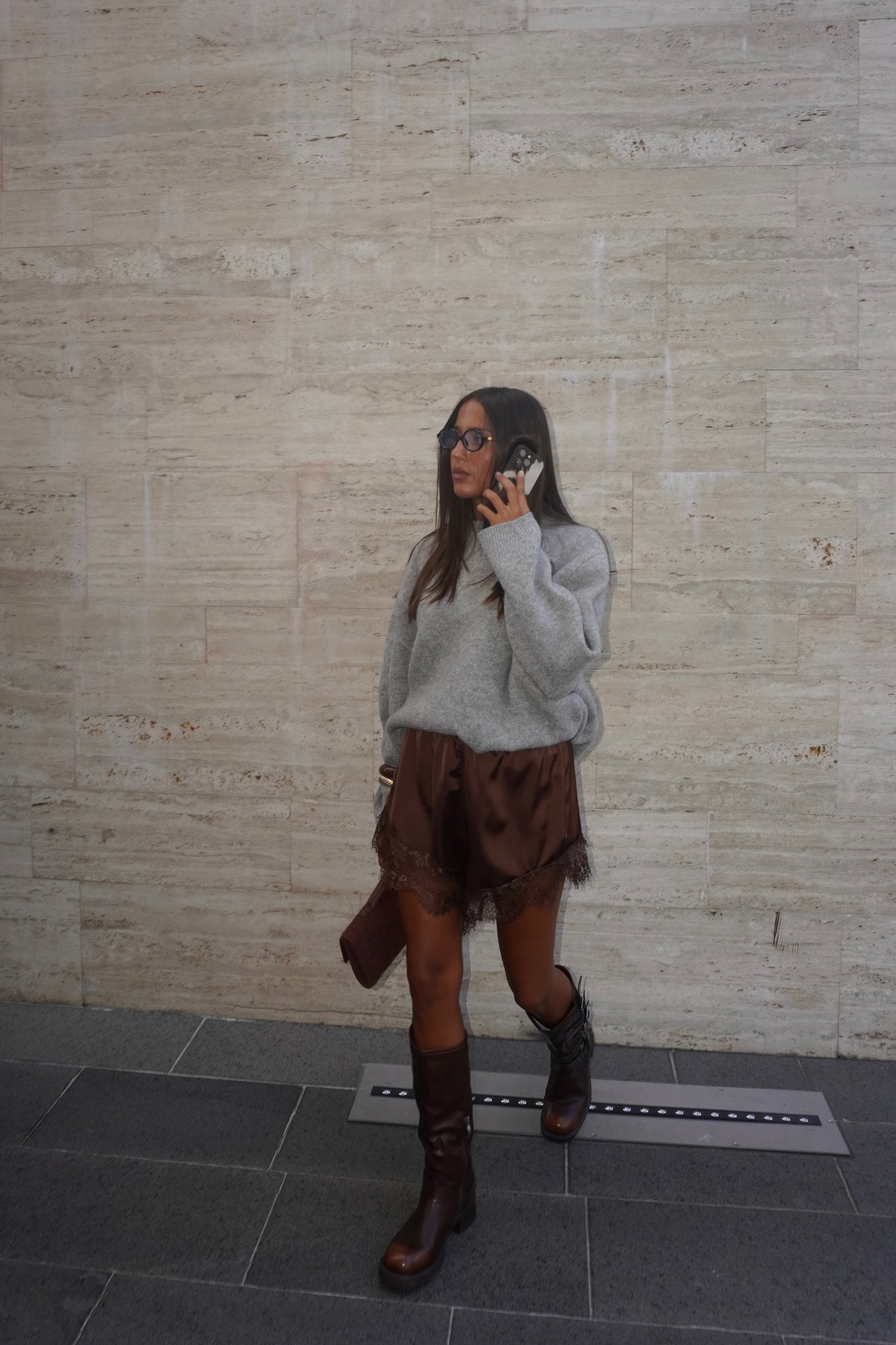 Pantaloncino in simil raso con orlo in pizzo a vita alta con elastico.