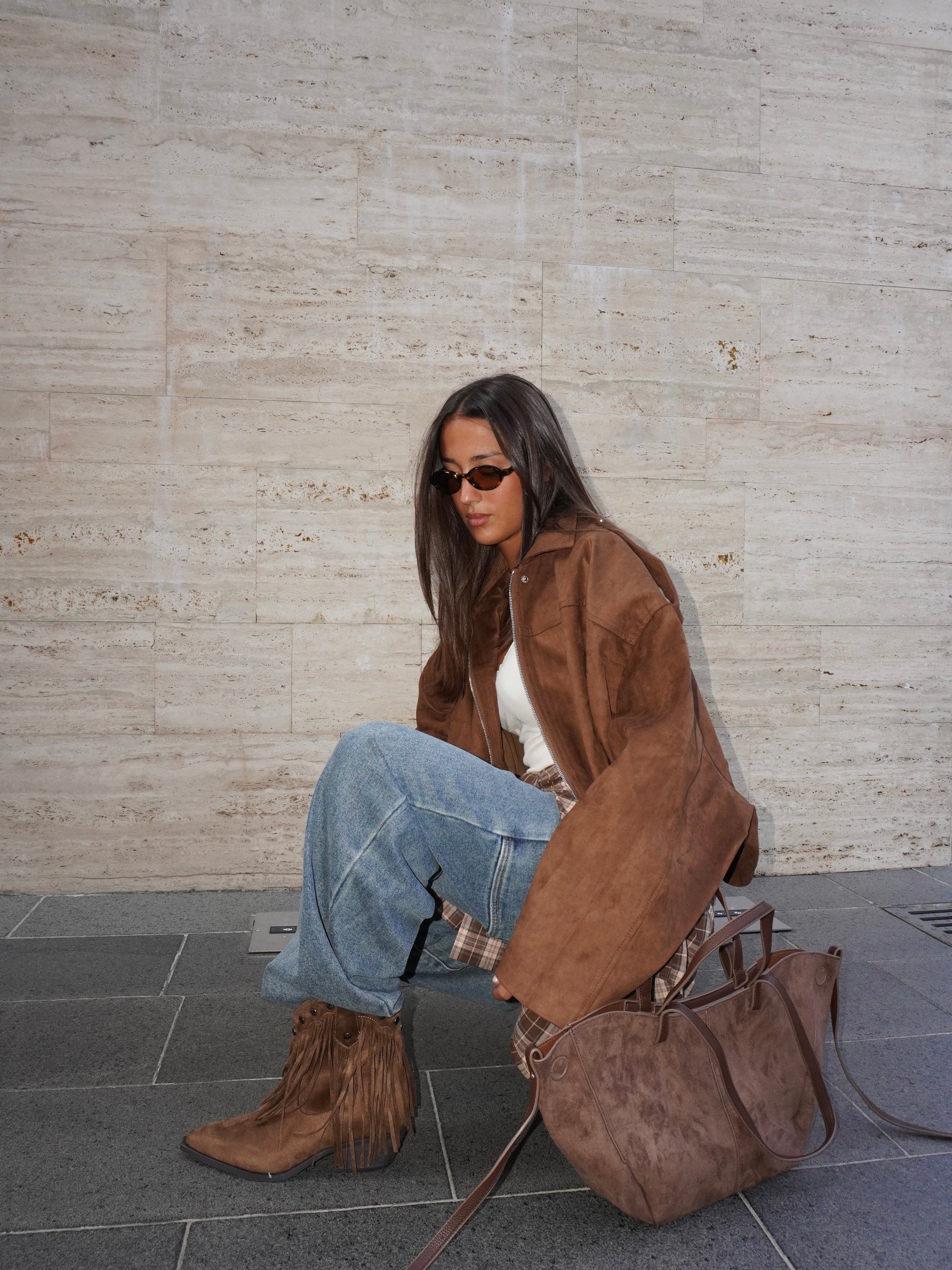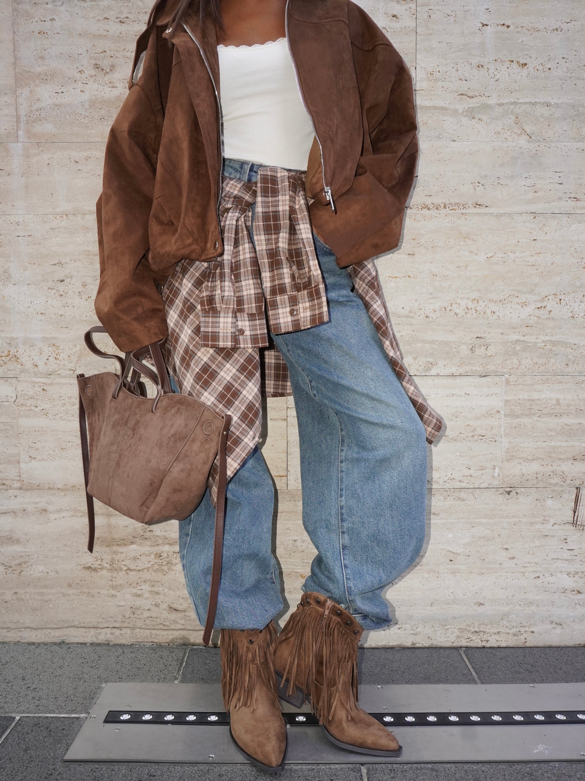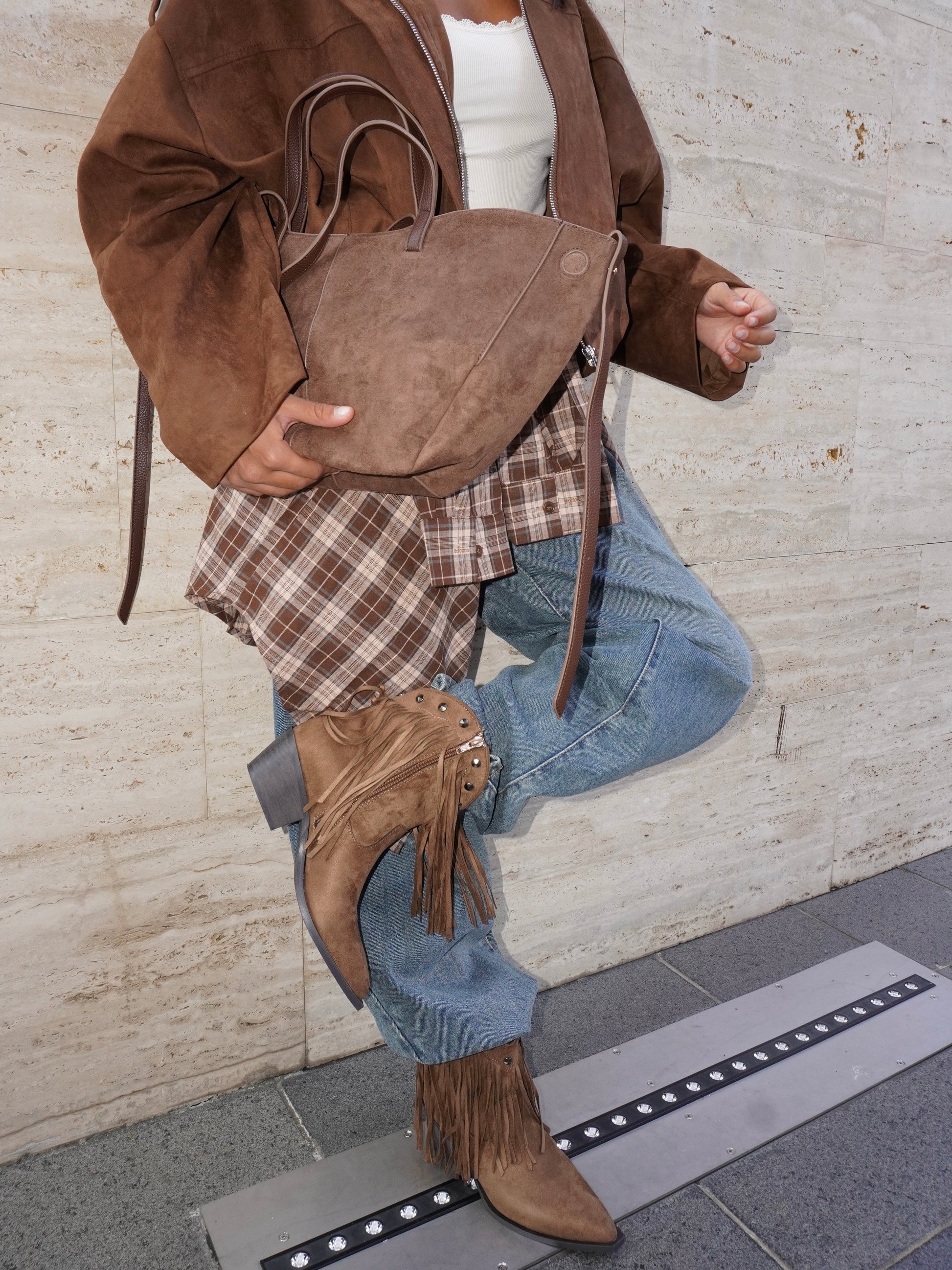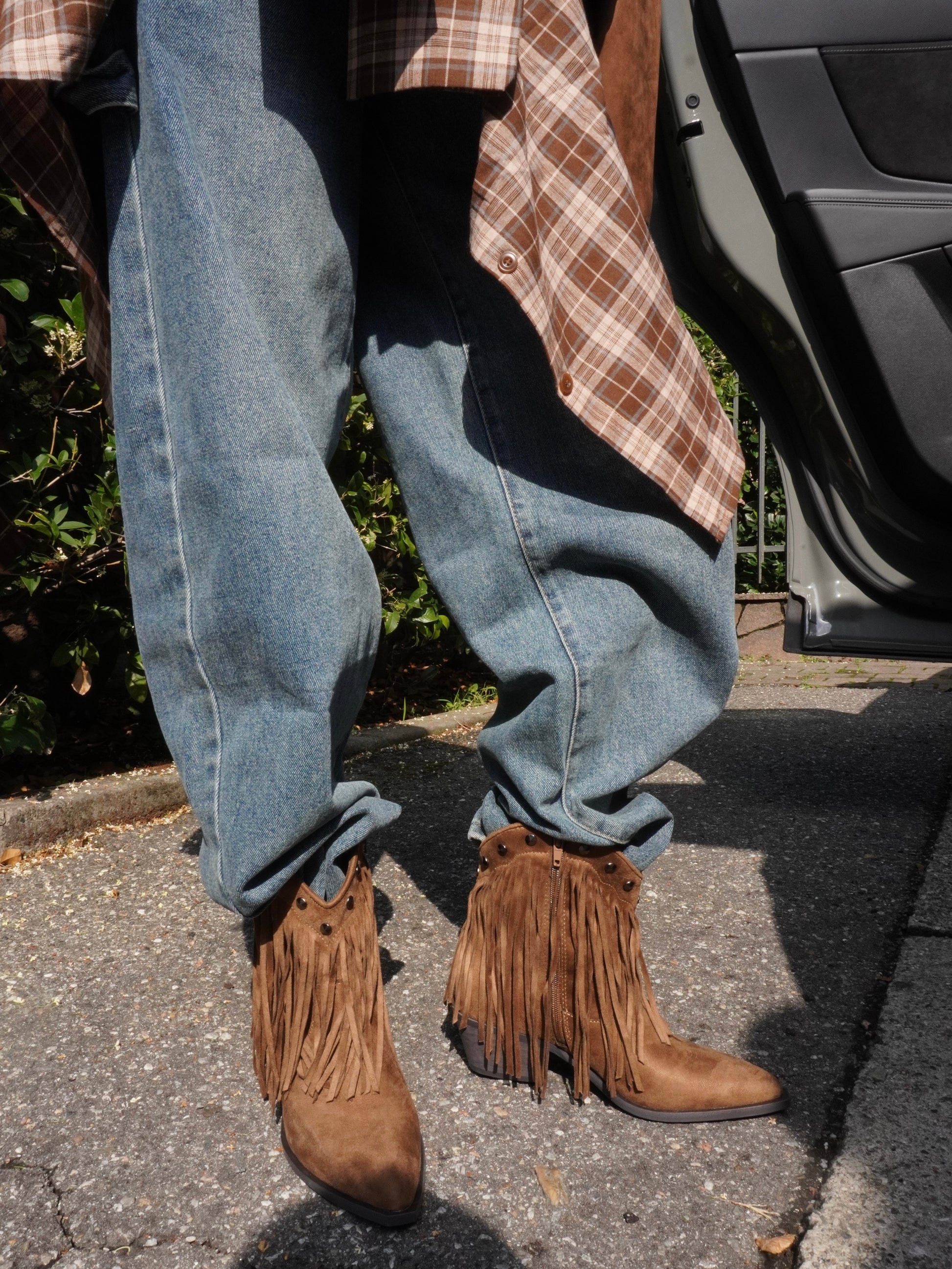 Stivale texano in simil camoscio con dettaglio di frange e borchie. Chiusura con cerniera.